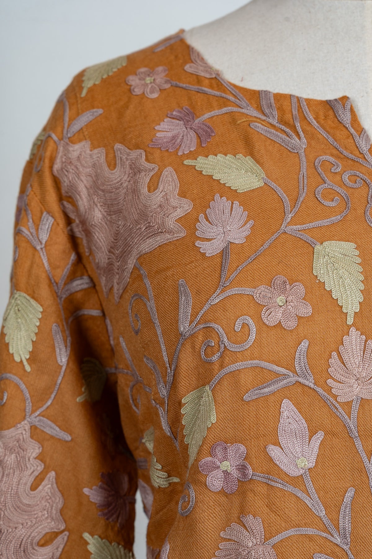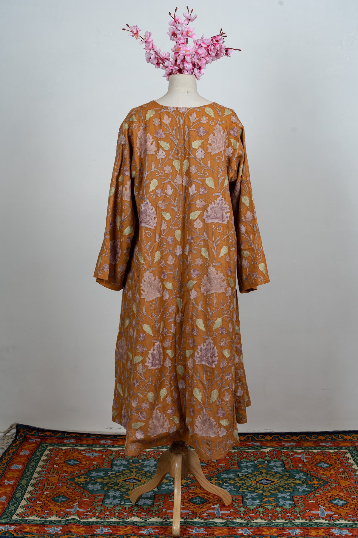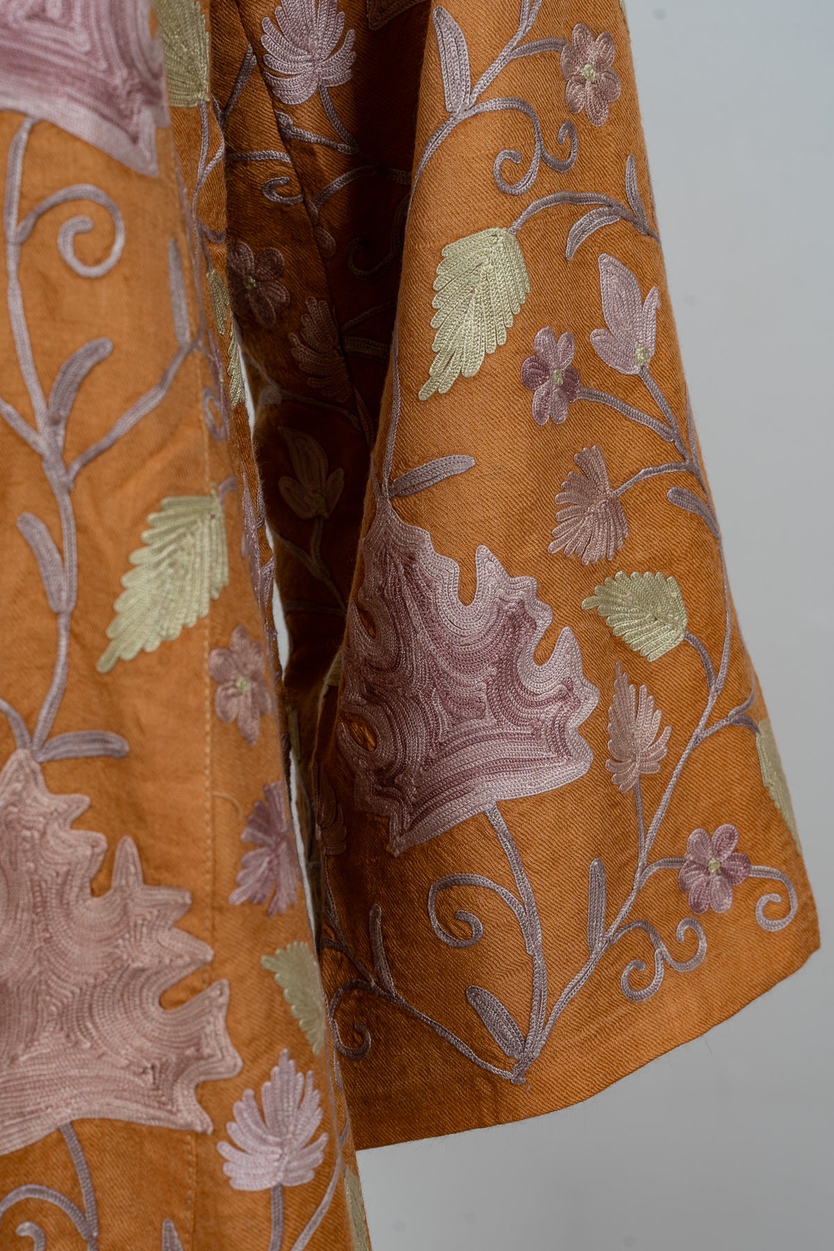 This rich amber-toned Aari Embroidered Abaya showcases a forest of embroidered maple-style leaves and vines in lilac, ivory, and pale green. The notched neckline and relaxed fit bring a modern touch, while the embroidery speaks of heritage artistry and detailed craftsmanship.