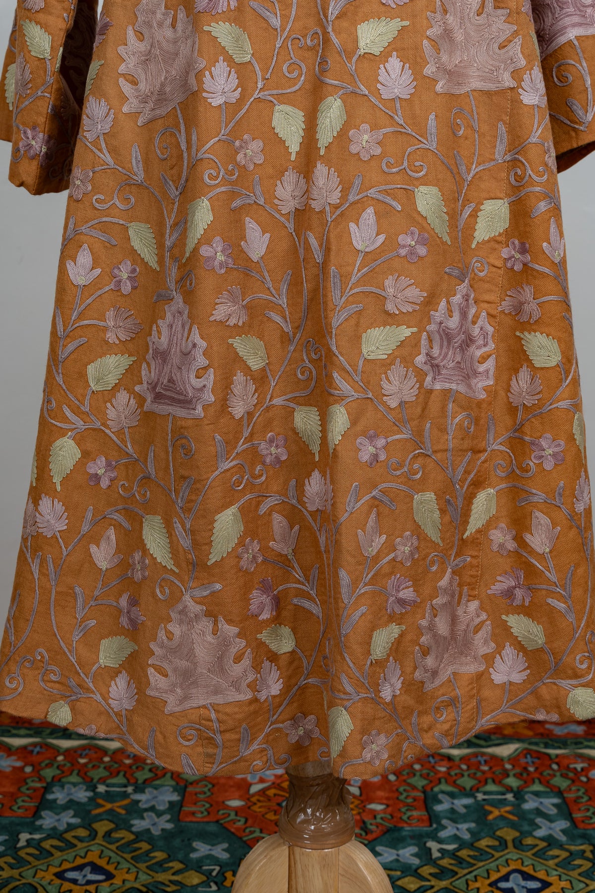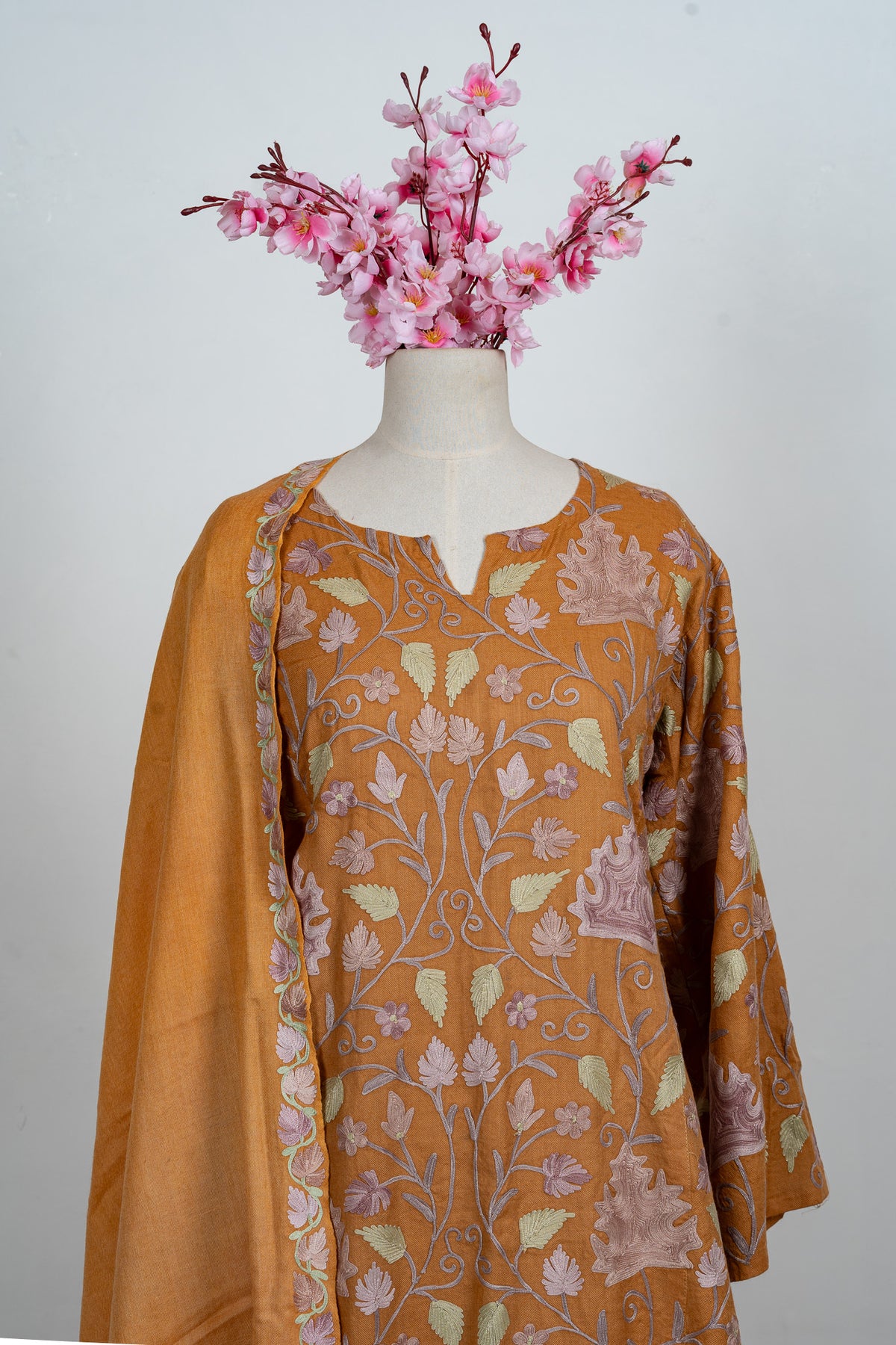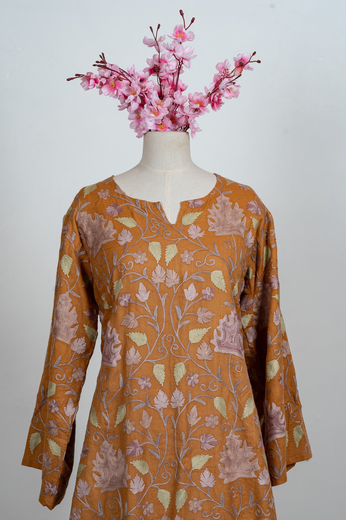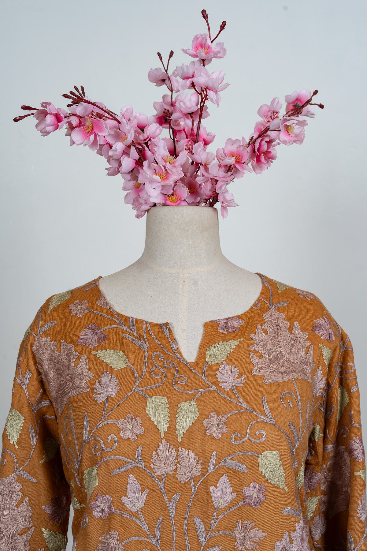 This rich amber-toned Aari Embroidered Abaya showcases a forest of embroidered maple-style leaves and vines in lilac, ivory, and pale green. The notched neckline and relaxed fit bring a modern touch, while the embroidery speaks of heritage artistry and detailed craftsmanship.