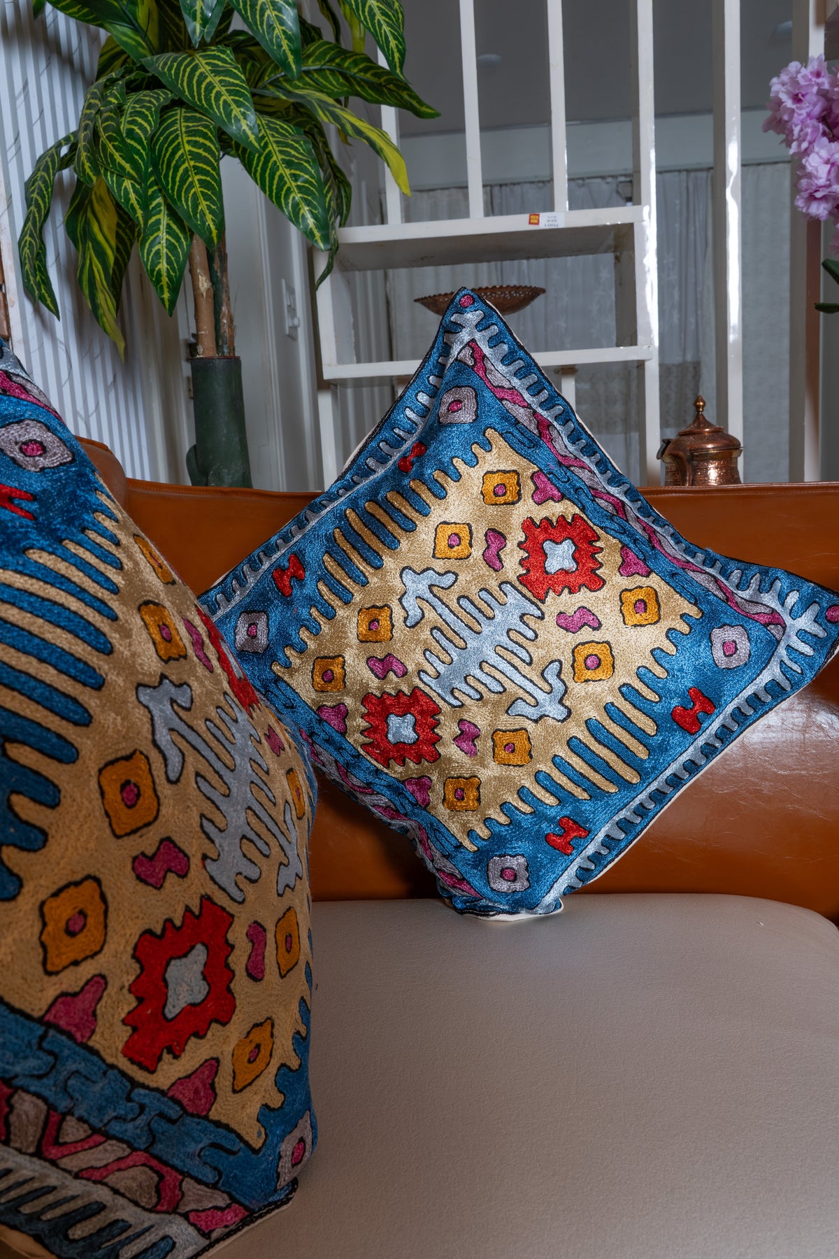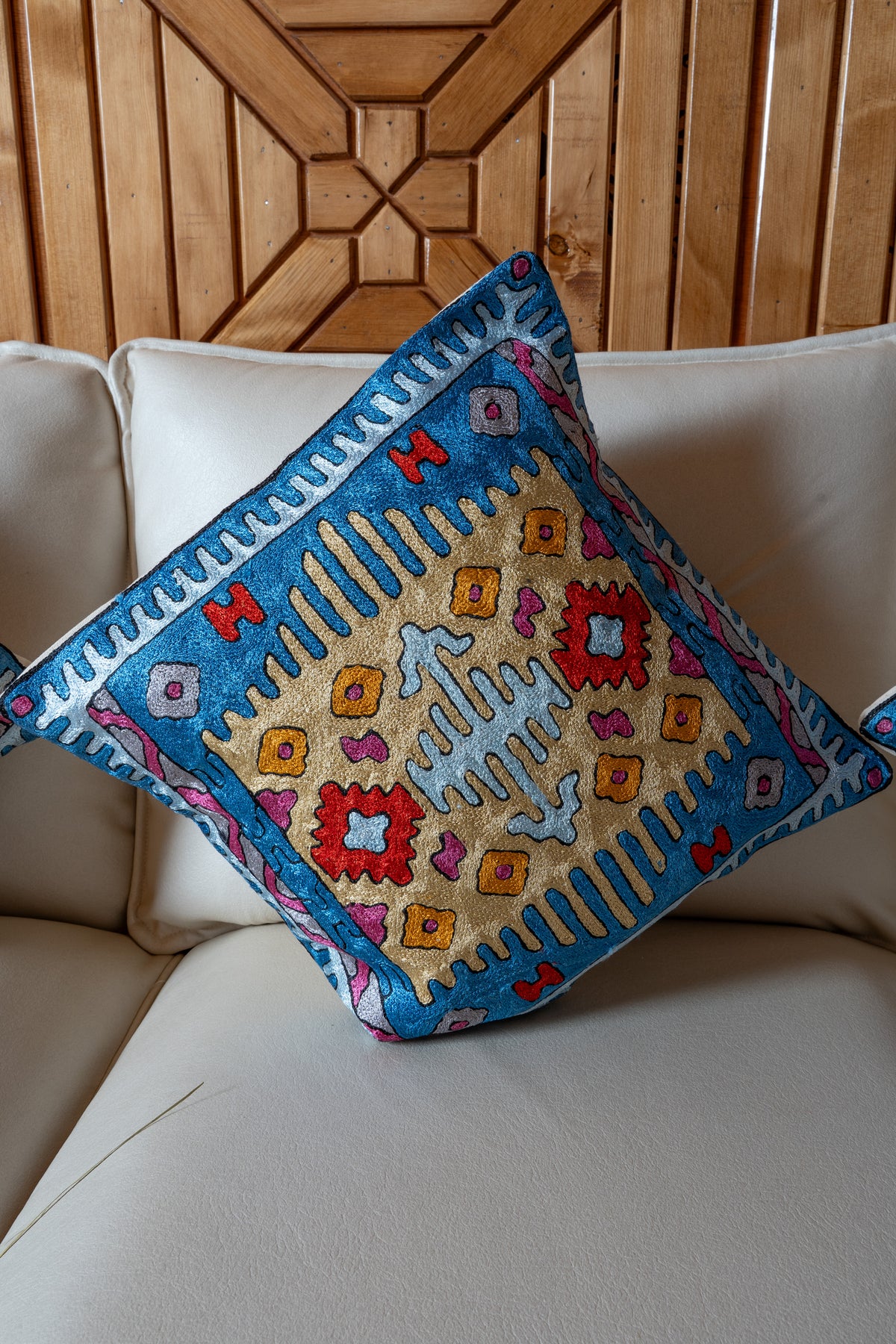 This pillow cover hand embroidered on cotton showcases a beautiful contrast of sky blue borders and a warm beige center filled with traditional motifs. Pops of red, pink, and mustard bring the design to life, while the carefully stitched patterns create a balanced and harmonious look that feels both artistic and inviting.