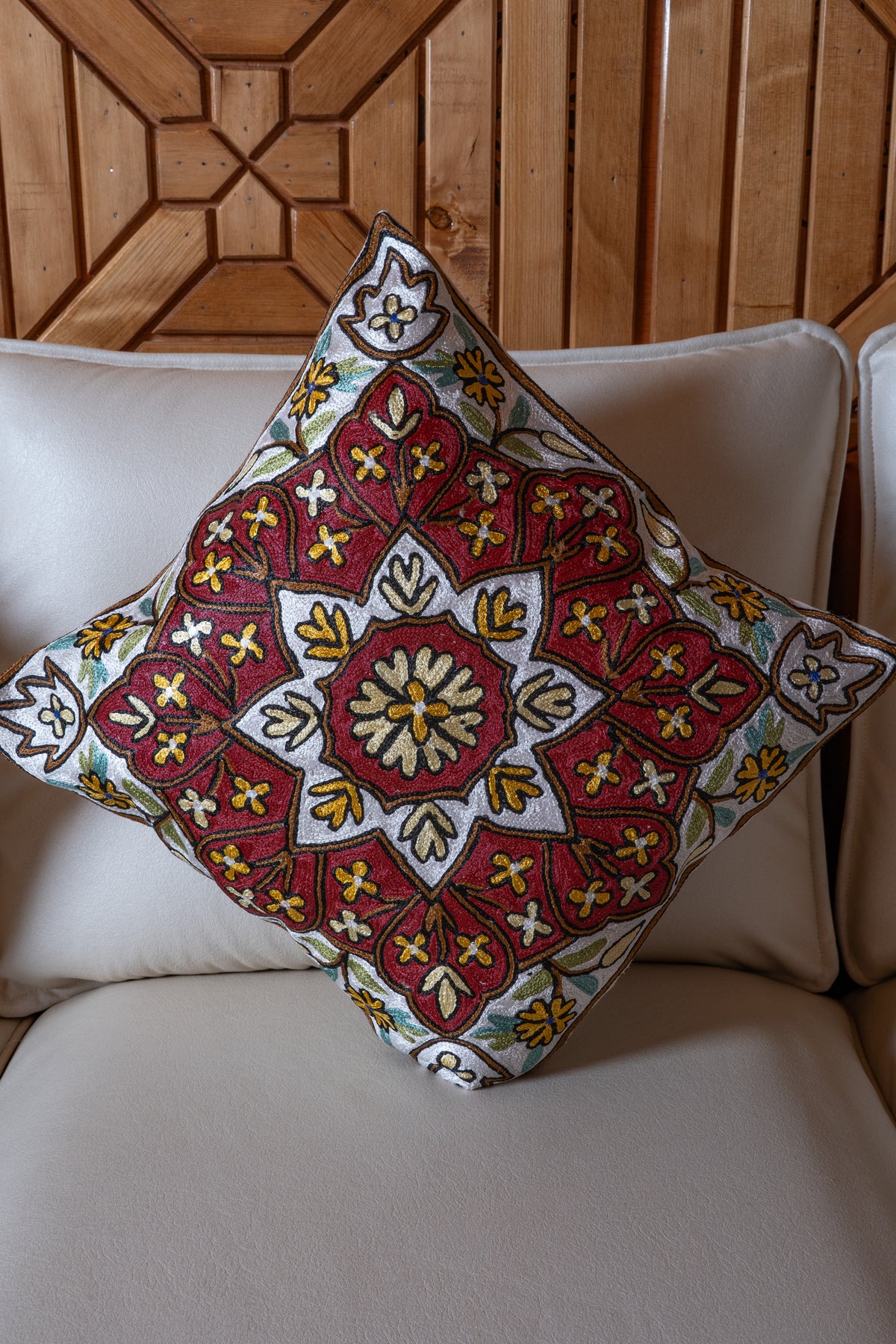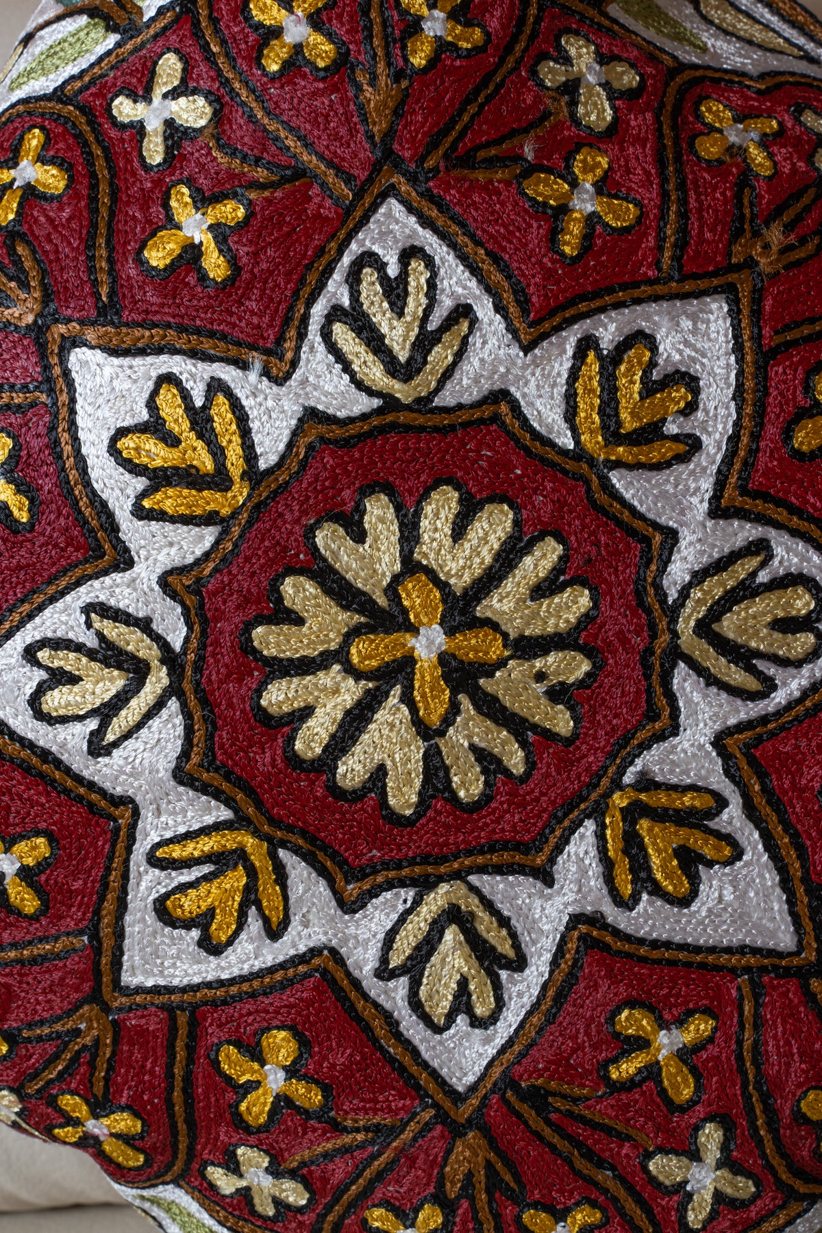 This pillow cover hand embroidered on cotton base presents a captivating star inspired medallion in shades of red, gold, and ivory. Delicate floral elements radiate outward, forming a symmetrical pattern that feels grand yet timeless.