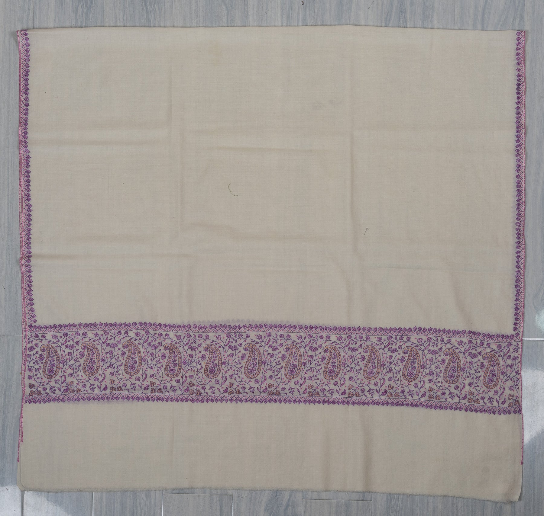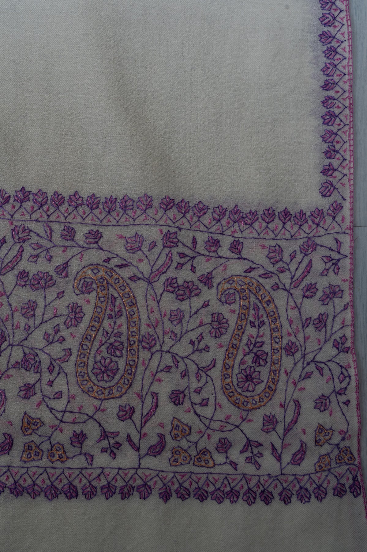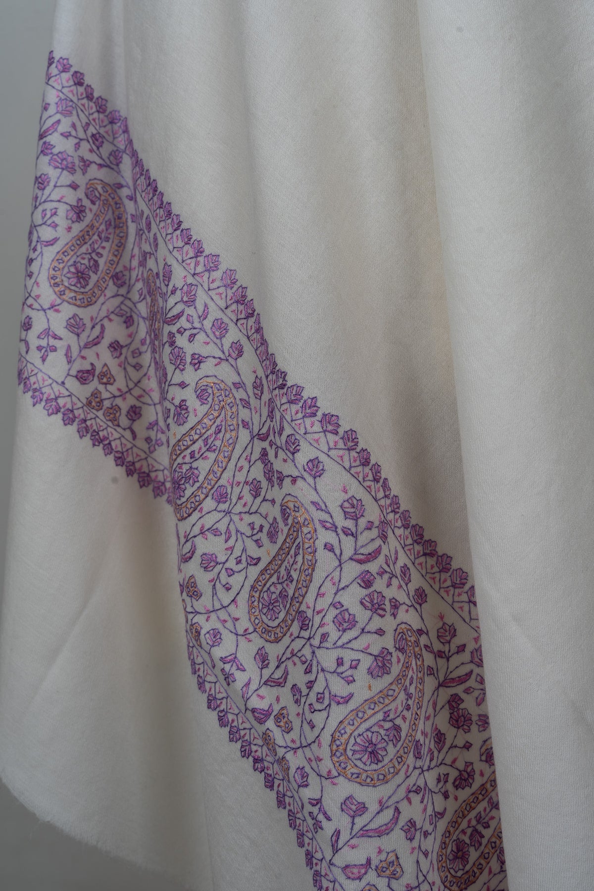 Elegant and serene, this Sozni Hand Embroidered Merino Wool Shawl features a soft ivory base accented with intricate lavender paisley detailing along the border. The delicate contrast adds visual interest while maintaining a graceful, timeless character.