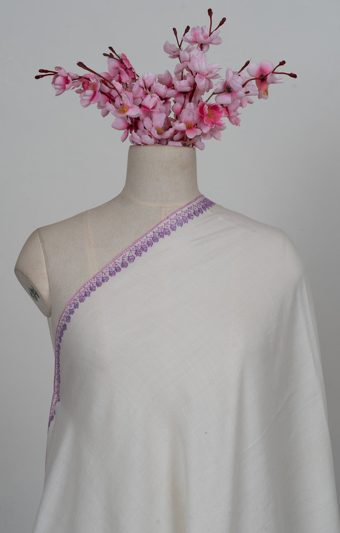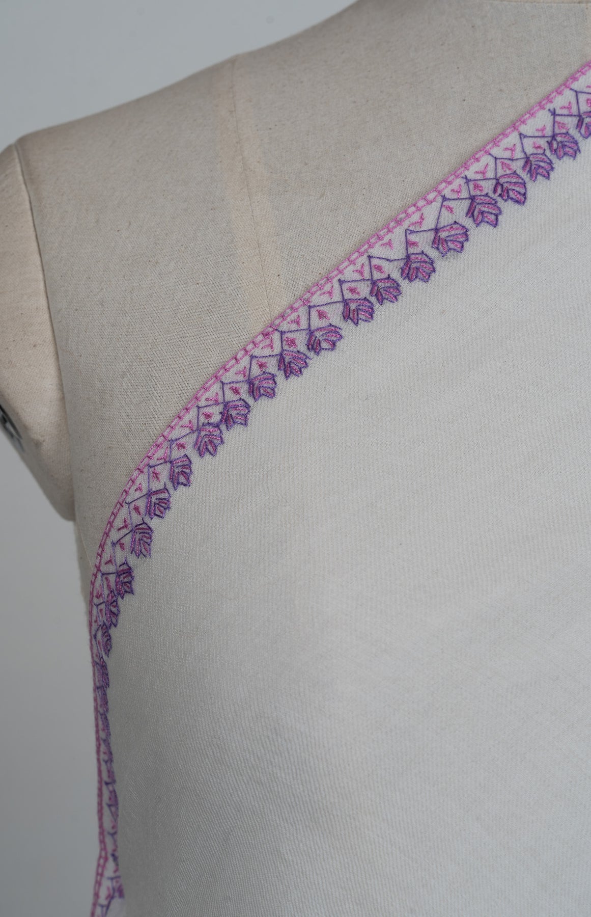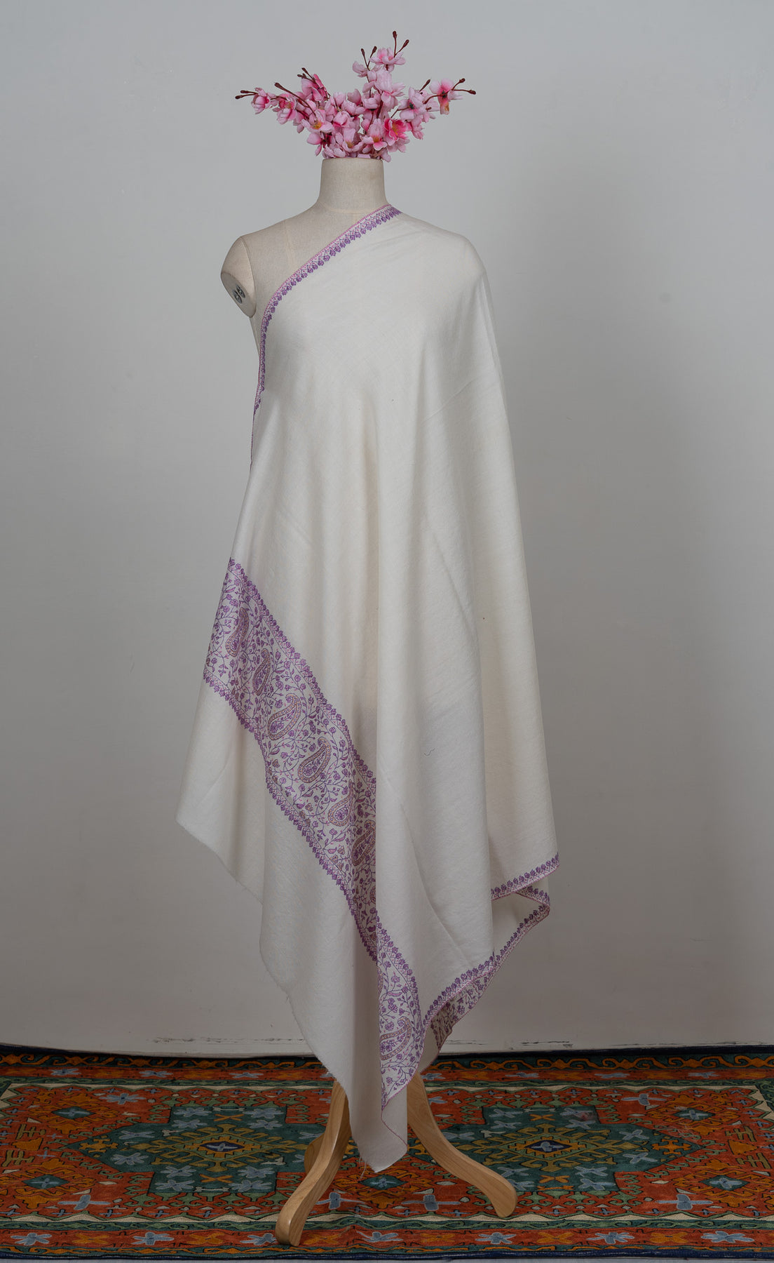Elegant and serene, this Sozni Hand Embroidered Merino Wool Shawl features a soft ivory base accented with intricate lavender paisley detailing along the border. The delicate contrast adds visual interest while maintaining a graceful, timeless character.