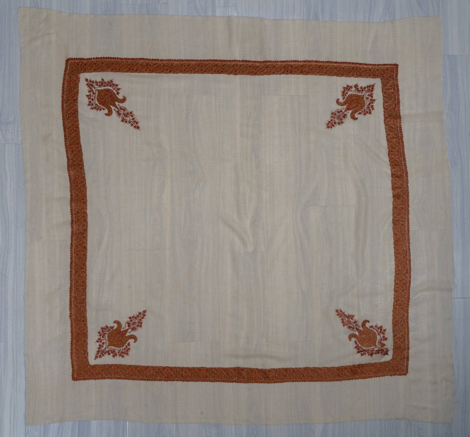 The Amber Glow Rumal embodies the warmth and richness of Kashmiri heritage. Woven in pure pashmina, its soft ivory base comes alive with Sozni embroidery in deep amber and russet hues, forming a magnificent paisley that reflects timeless artistry. Each stitch radiates finesse, preserving centuries of traditional craftsmanship.
