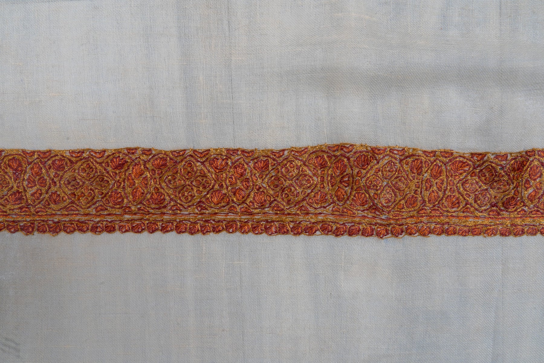 Encircled by an intricately embroidered border, this masterpiece exudes understated opulence. Whether draped as a statement of cultural pride or styled for refined occasions, it captures the poetic spirit of Kashmir’s needlework tradition.