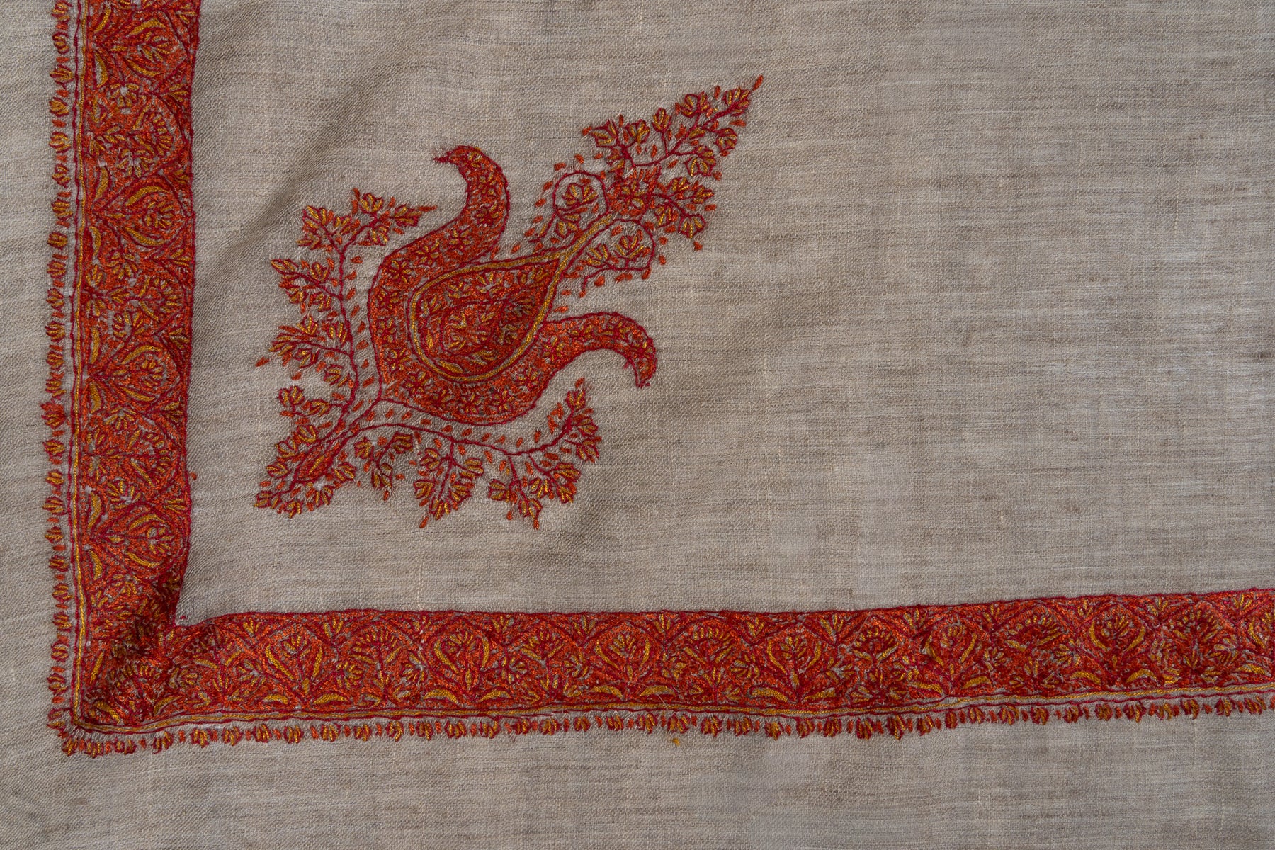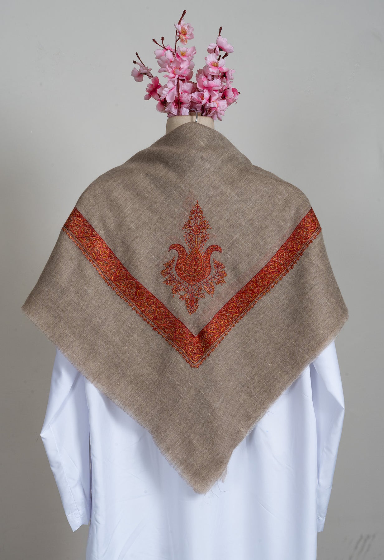The Crimson Earth Rumal reflects the richness of Kashmiri artistry. Its deep taupe base is illuminated by Sozni embroidery in glowing crimson and saffron tones, forming an iconic paisley that celebrates heritage and culture. Each motif is a testament to precision and passion.