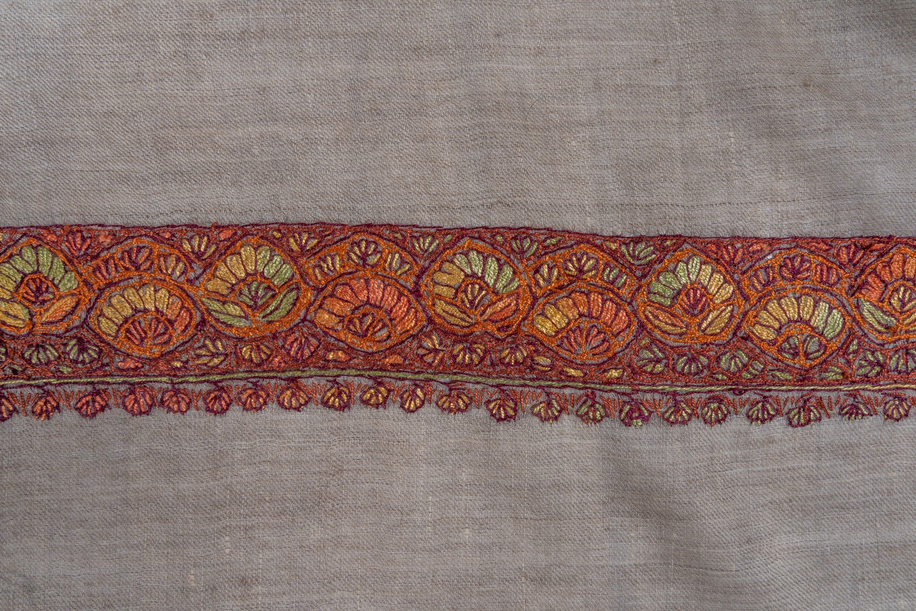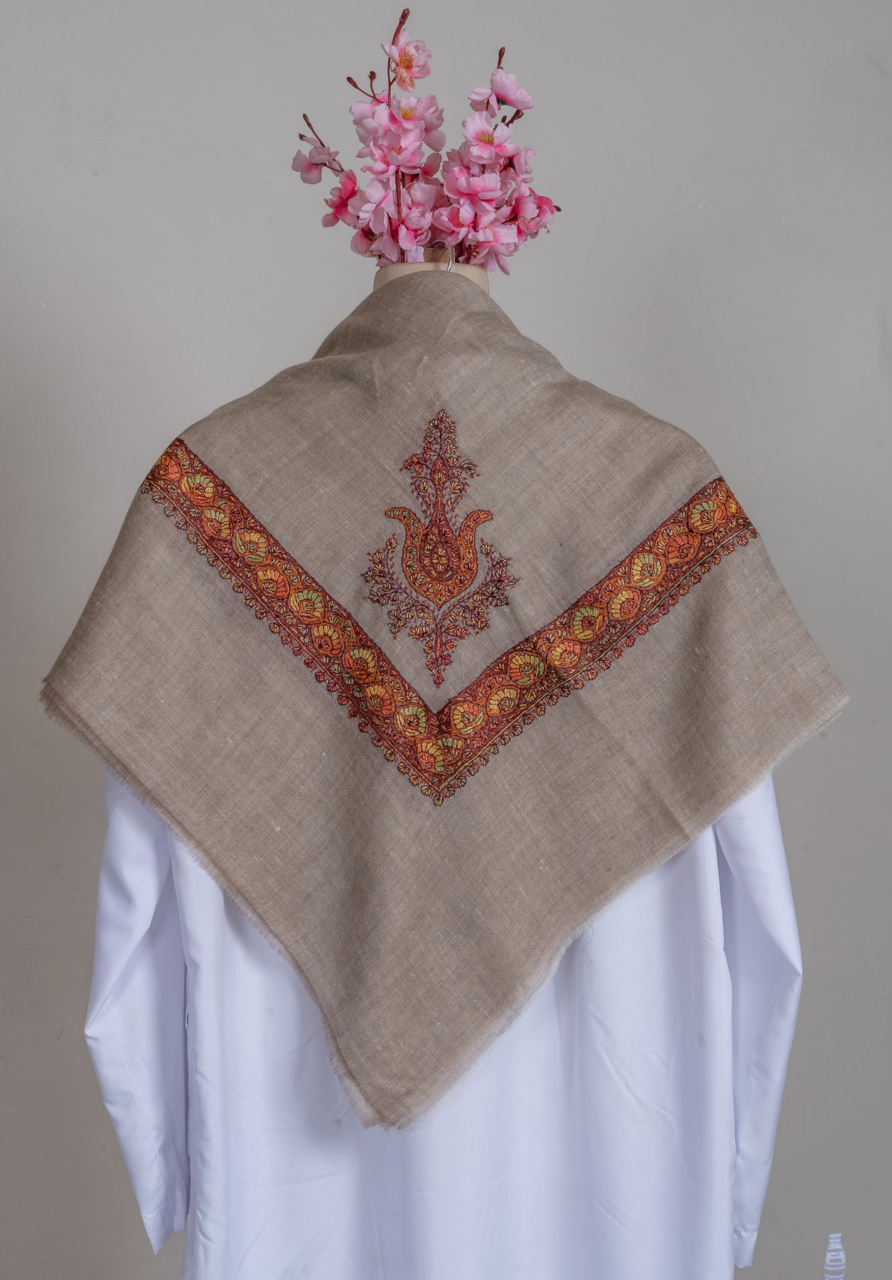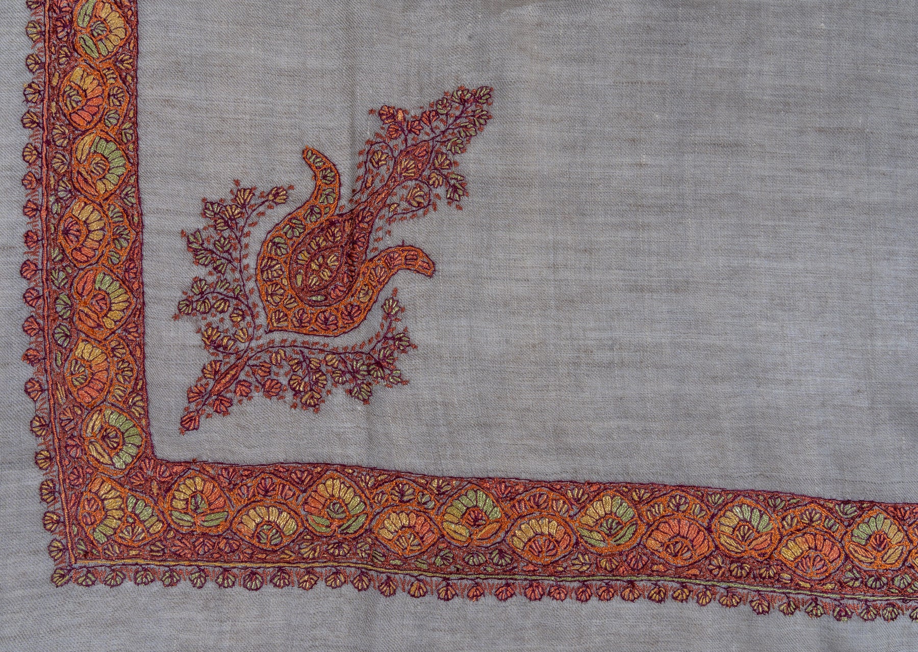The Ember Dusk Rumal captures the fiery spirit of Kashmiri craftsmanship. Its taupe-toned base contrasts beautifully with Sozni embroidery in rich saffron and crimson hues, creating a striking central motif reminiscent of traditional paisleys. Every element is delicately balanced to highlight finesse and vibrancy.