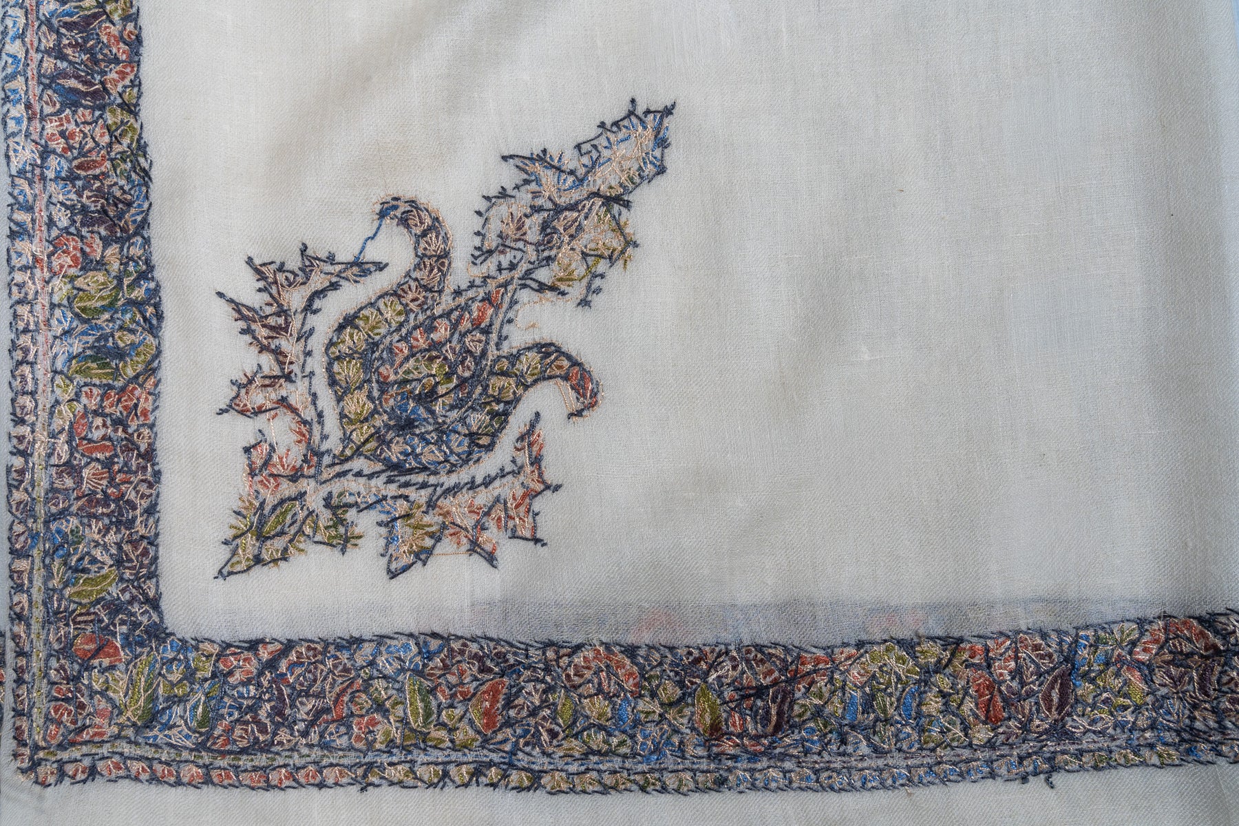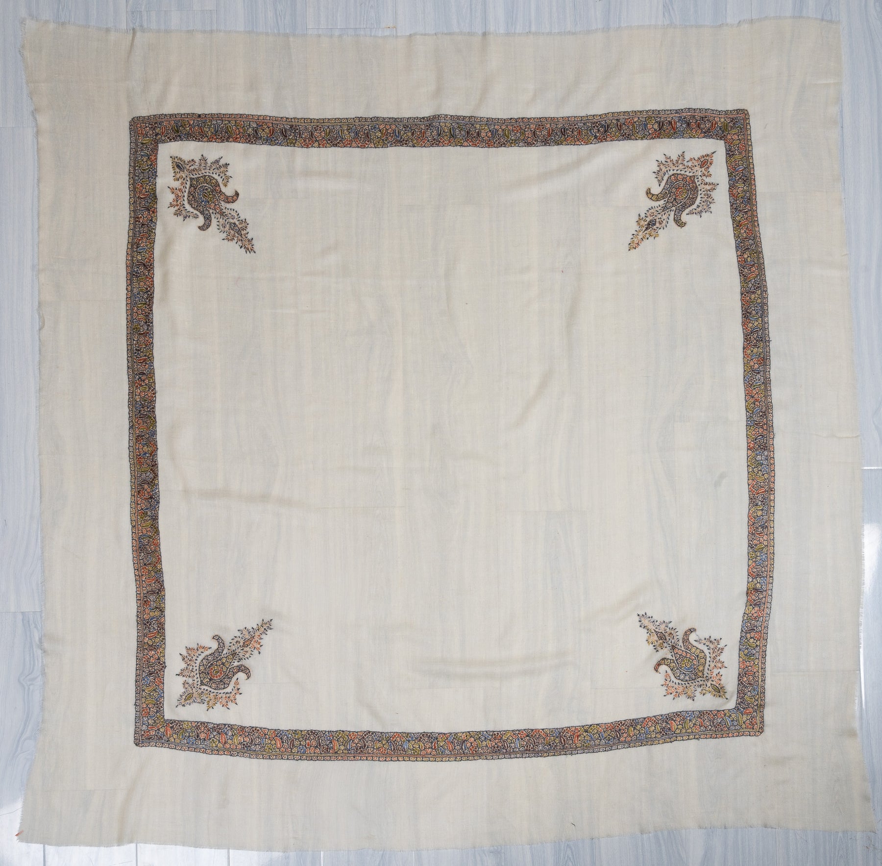 Framed by a beautifully detailed border, this piece radiates gentle sophistication. Perfect for special occasions or curated collections, it offers an exquisite glimpse into Kashmir’s living embroidery tradition.