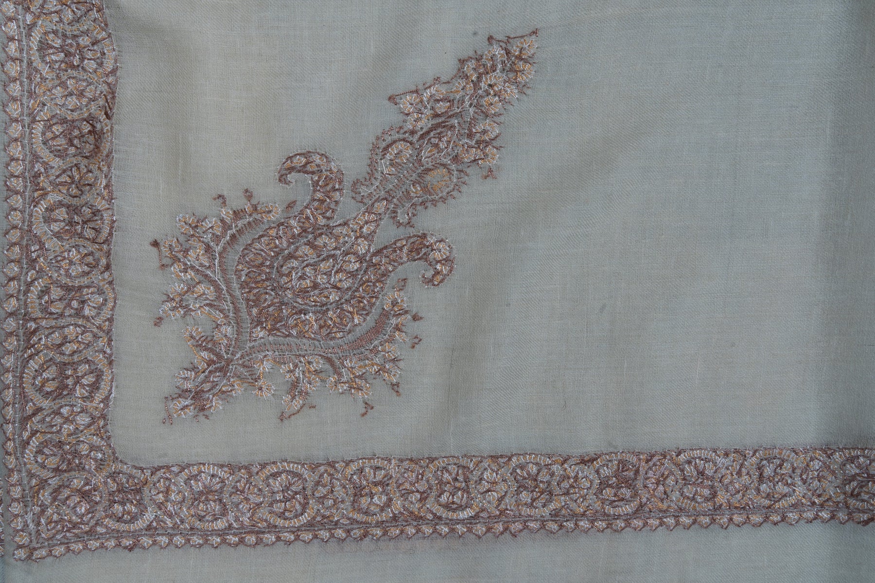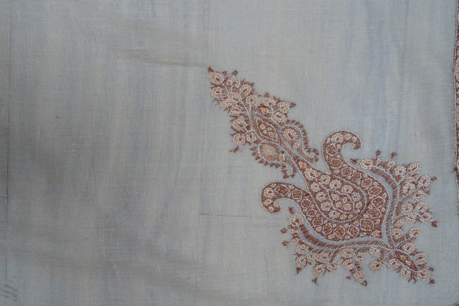 The Sand Veil Rumal is a portrait of delicate sophistication. Its muted sand base is brought to life through intricate Sozni embroidery in soft copper tones. The paisley centerpiece, bordered with fine detailing, celebrates the elegance of minimalist Kashmiri expression.