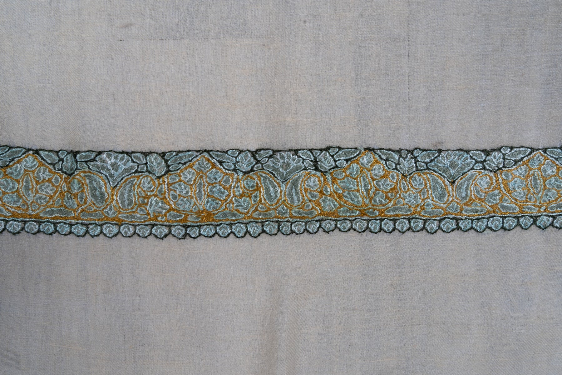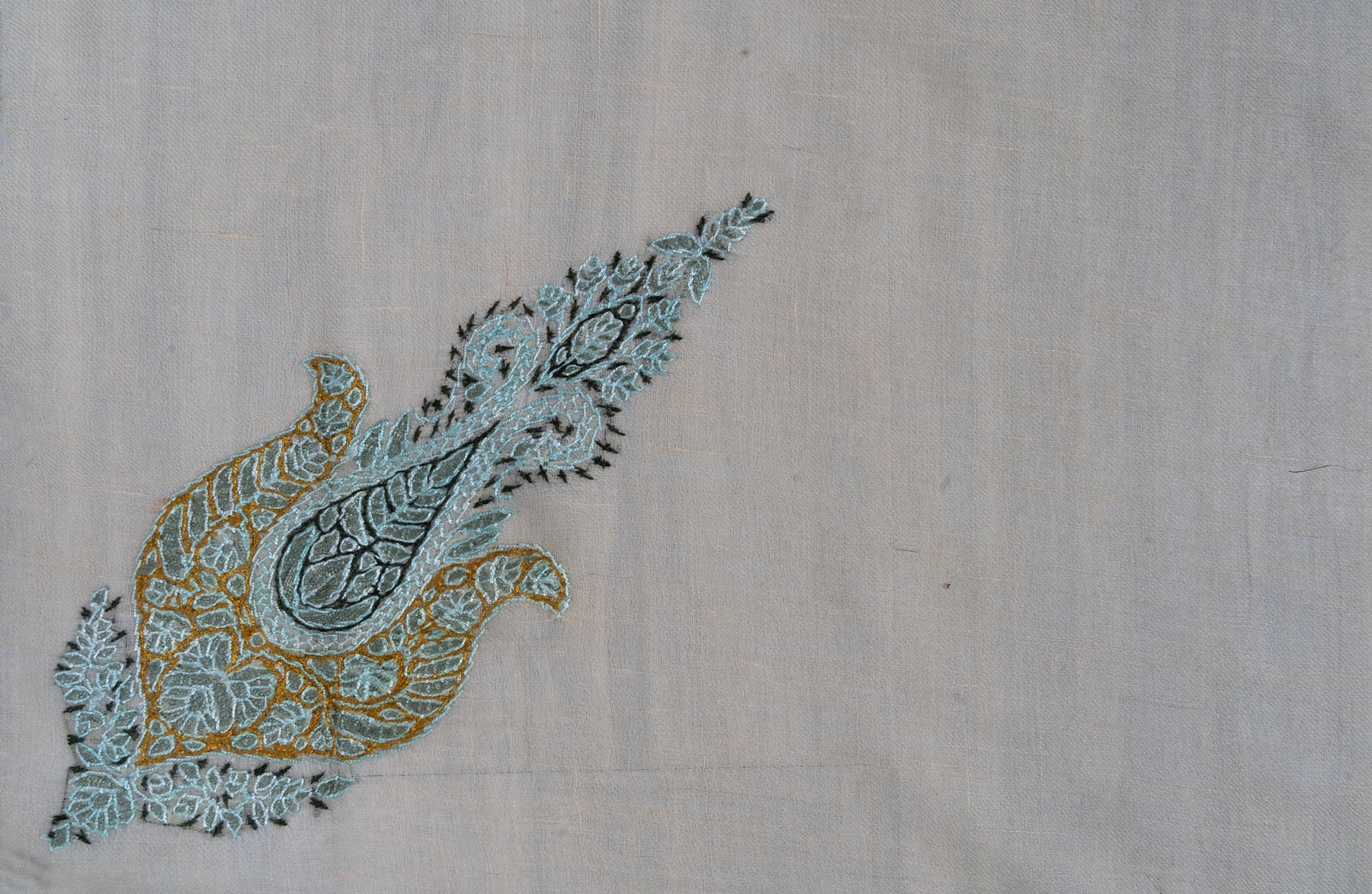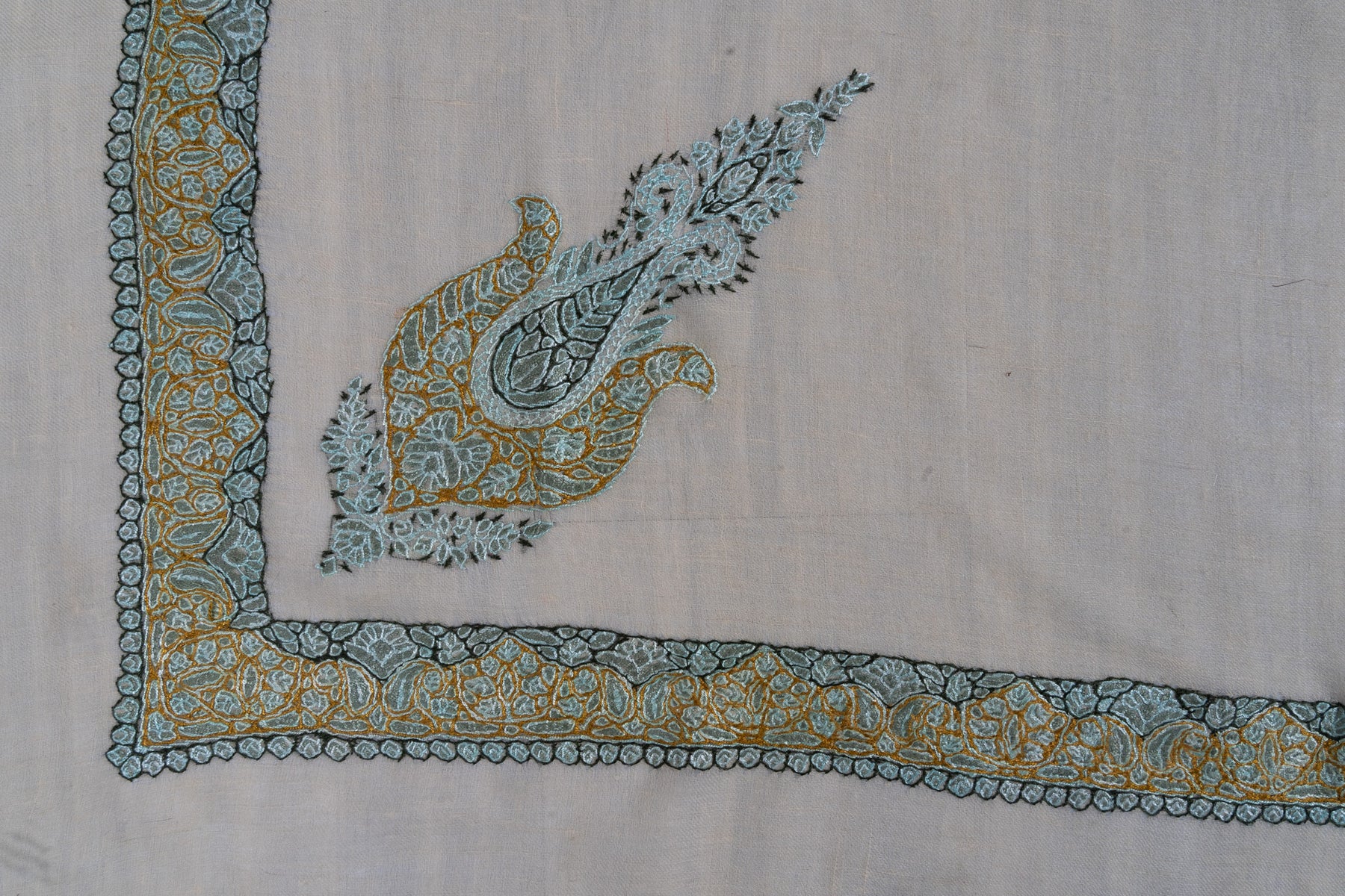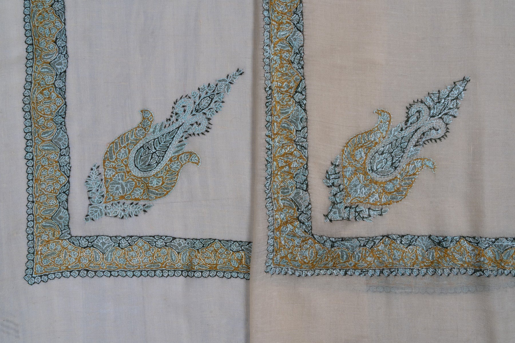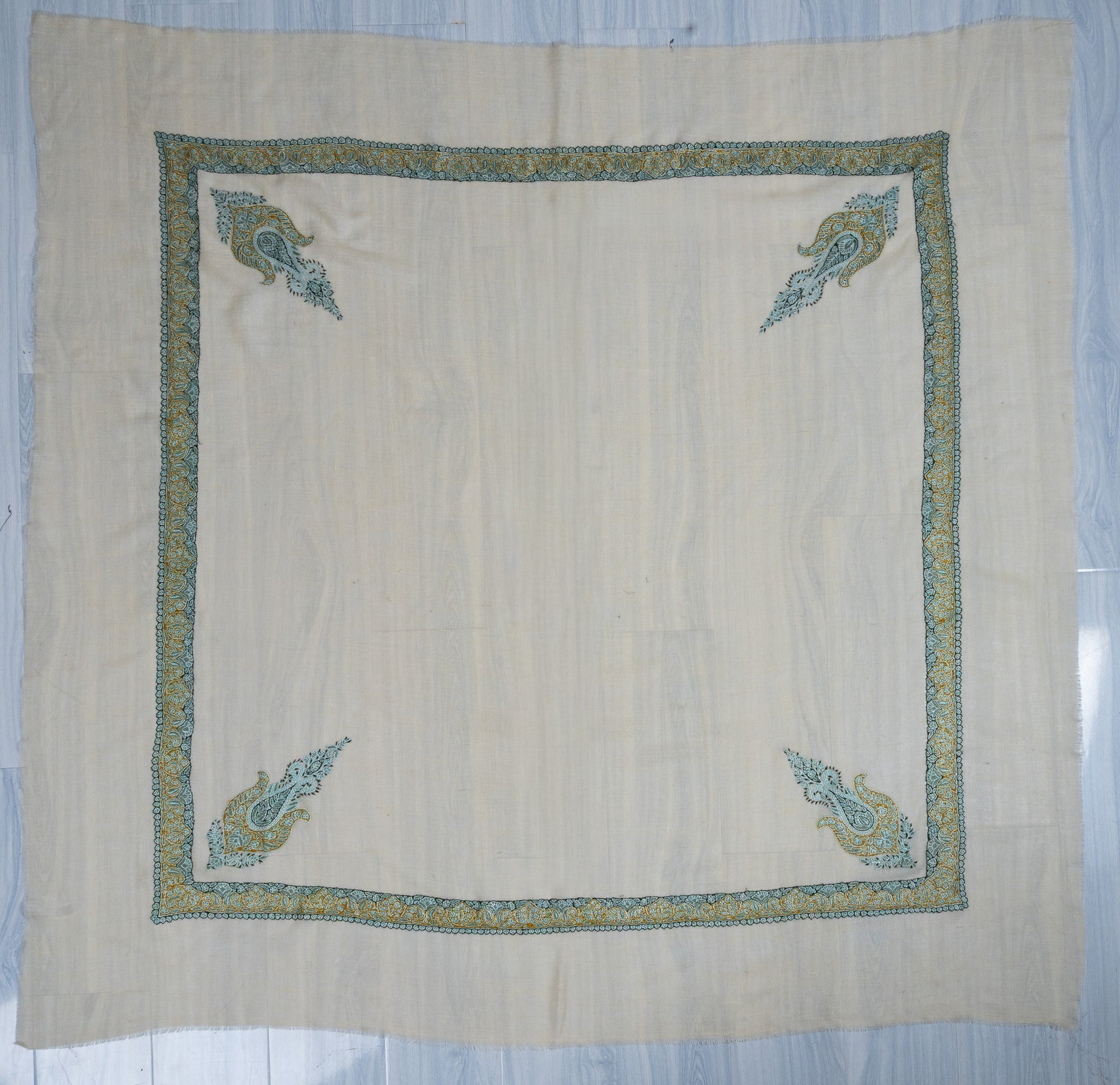 The Seafoam Bloom Rumal celebrates harmony through color and craft. Its pale beige base is enriched with Sozni embroidery in teal, gold, and olive tones. The delicate paisley pattern reflects Kashmir’s serene beauty and artistic precision.