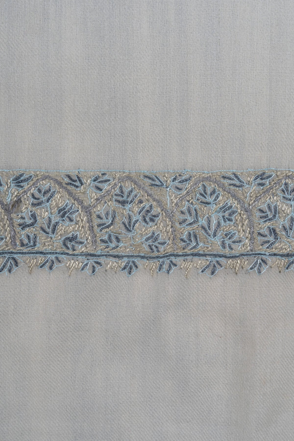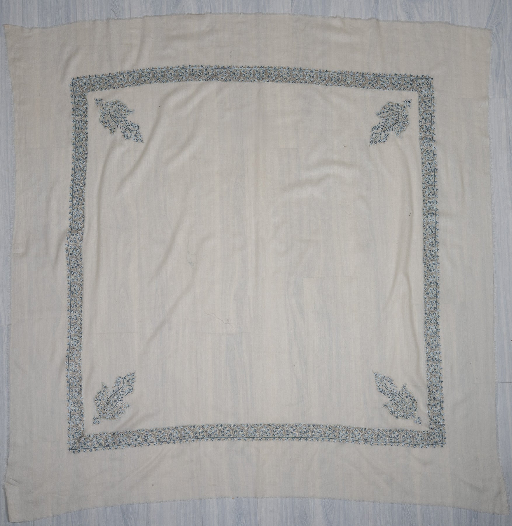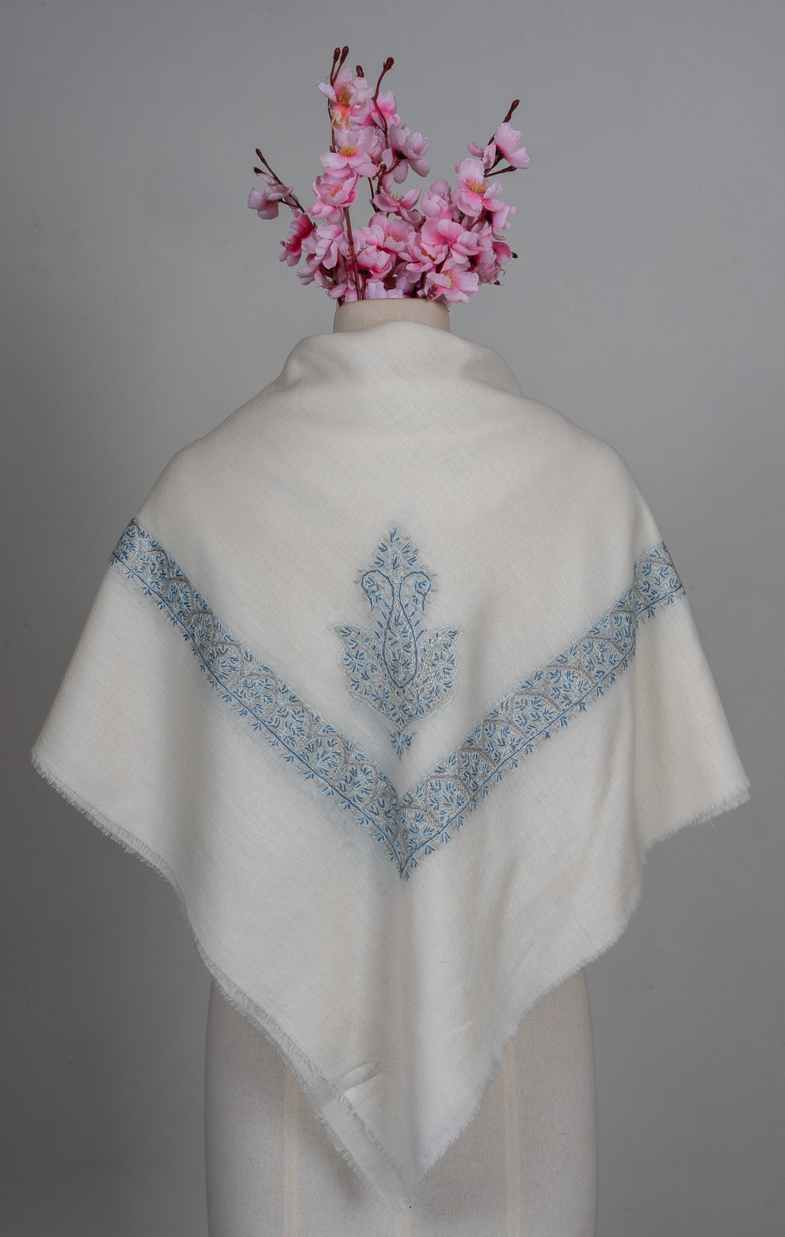 The embroidery is Sozni, the most intricate of Kashmiri needlework, executed entirely by hand. Soft sky blue threadwork forms a graceful chevron border and central floral motif over a luminous ivory base, creating an airy and ethereal aesthetic. This Rumal pairs beautifully with pastel abayas, summer kaftans, and contemporary minimal dressing.