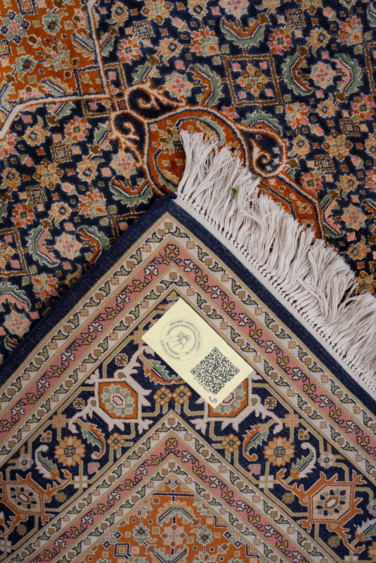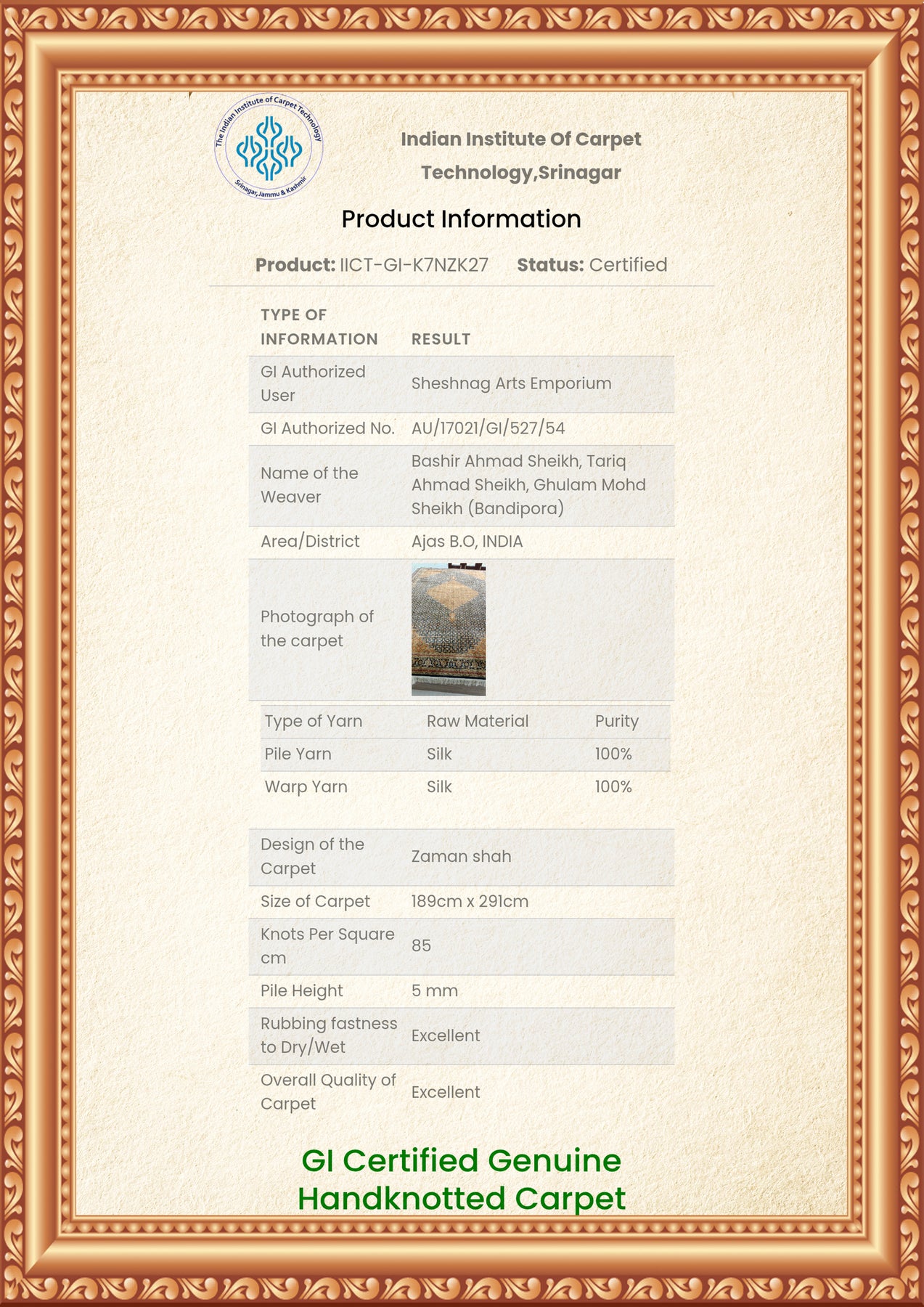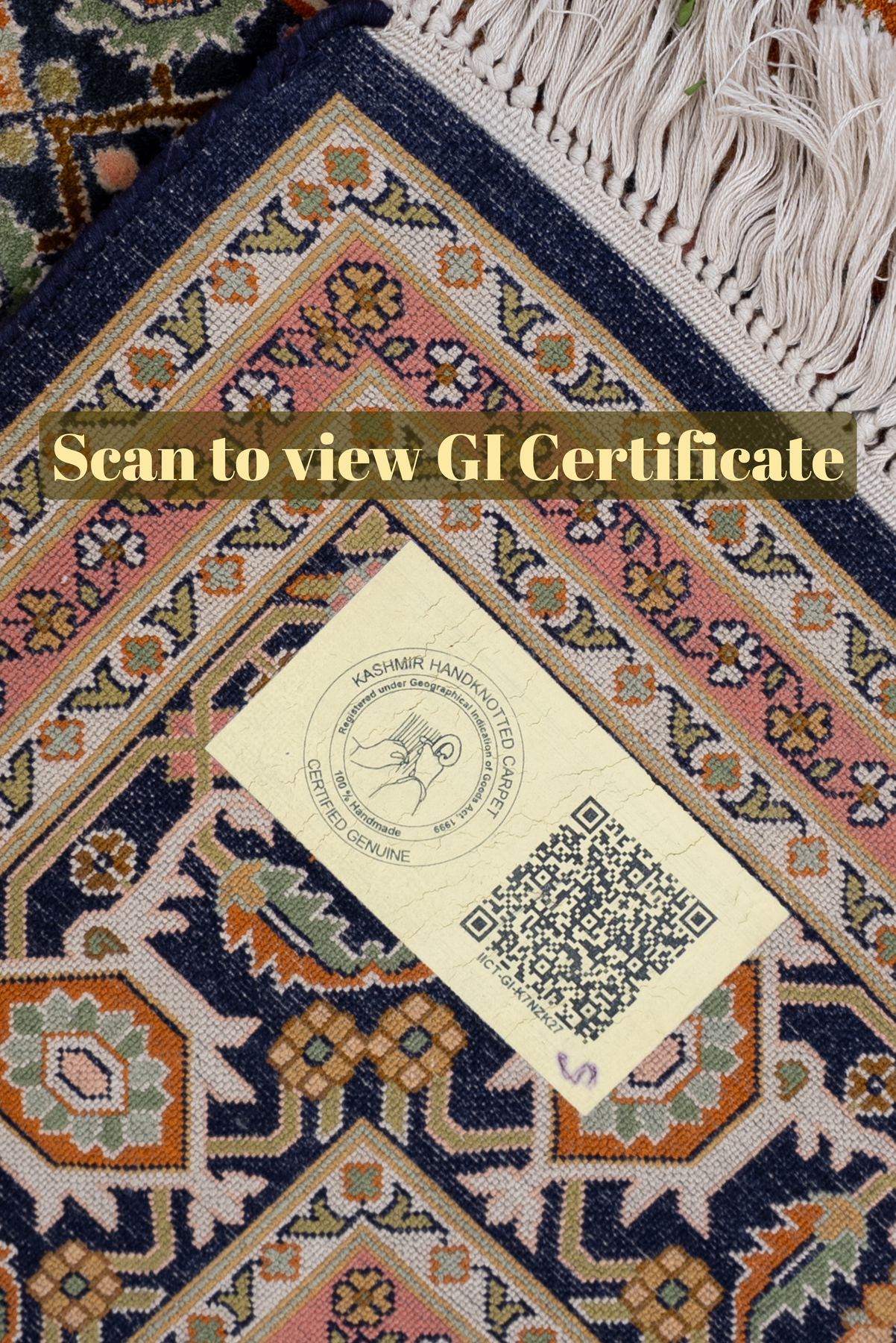 To guarantee authenticity, every Pure silk on silk carpet is accompanied by a Geographical Indication (GI) Certificate, issued by the Government of India. This certificate confirms that this carpet is a 100% Pure silk carpet and is Hand-knotted, and Hand-Crafted by local Artisans in Kashmir valley.