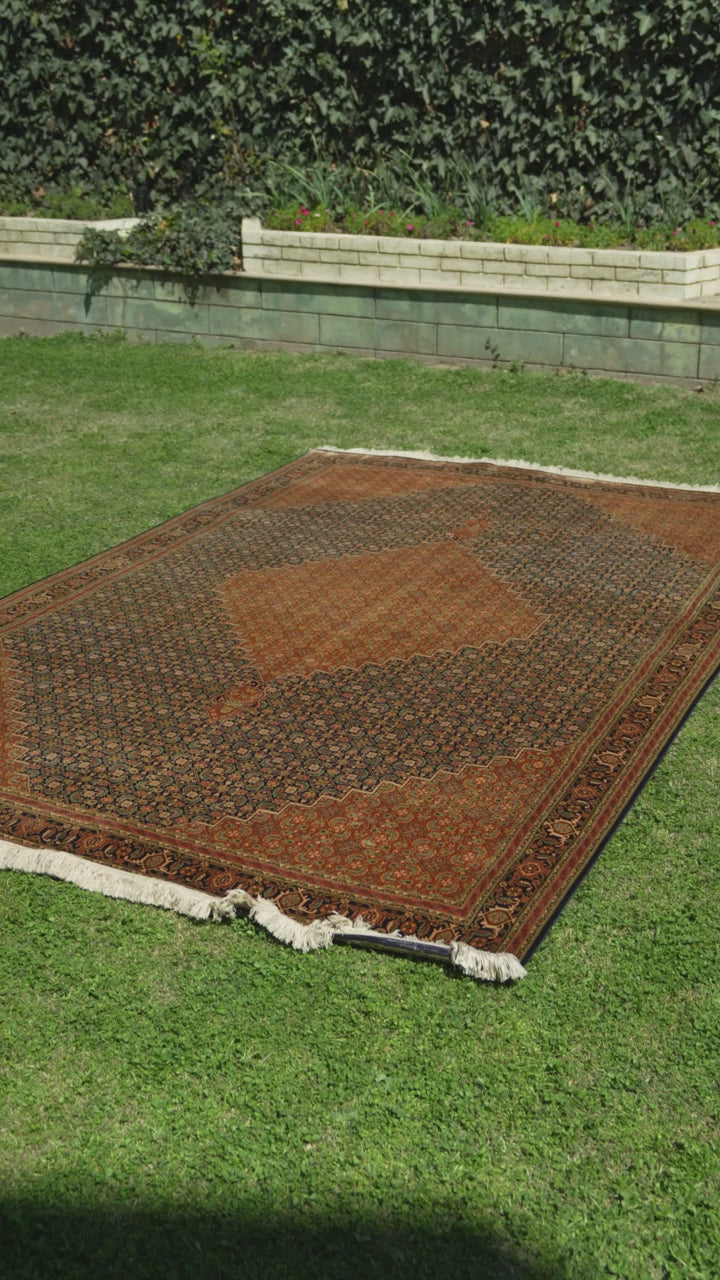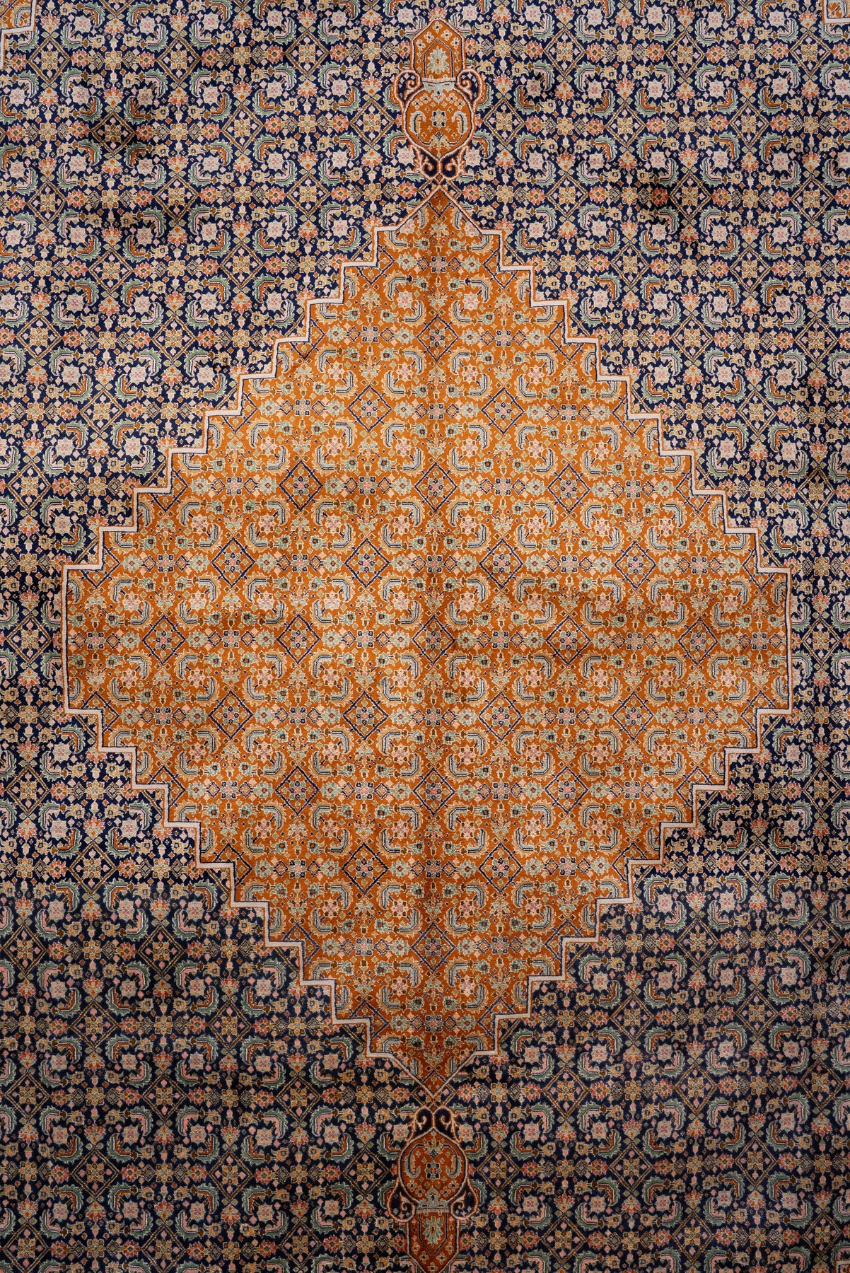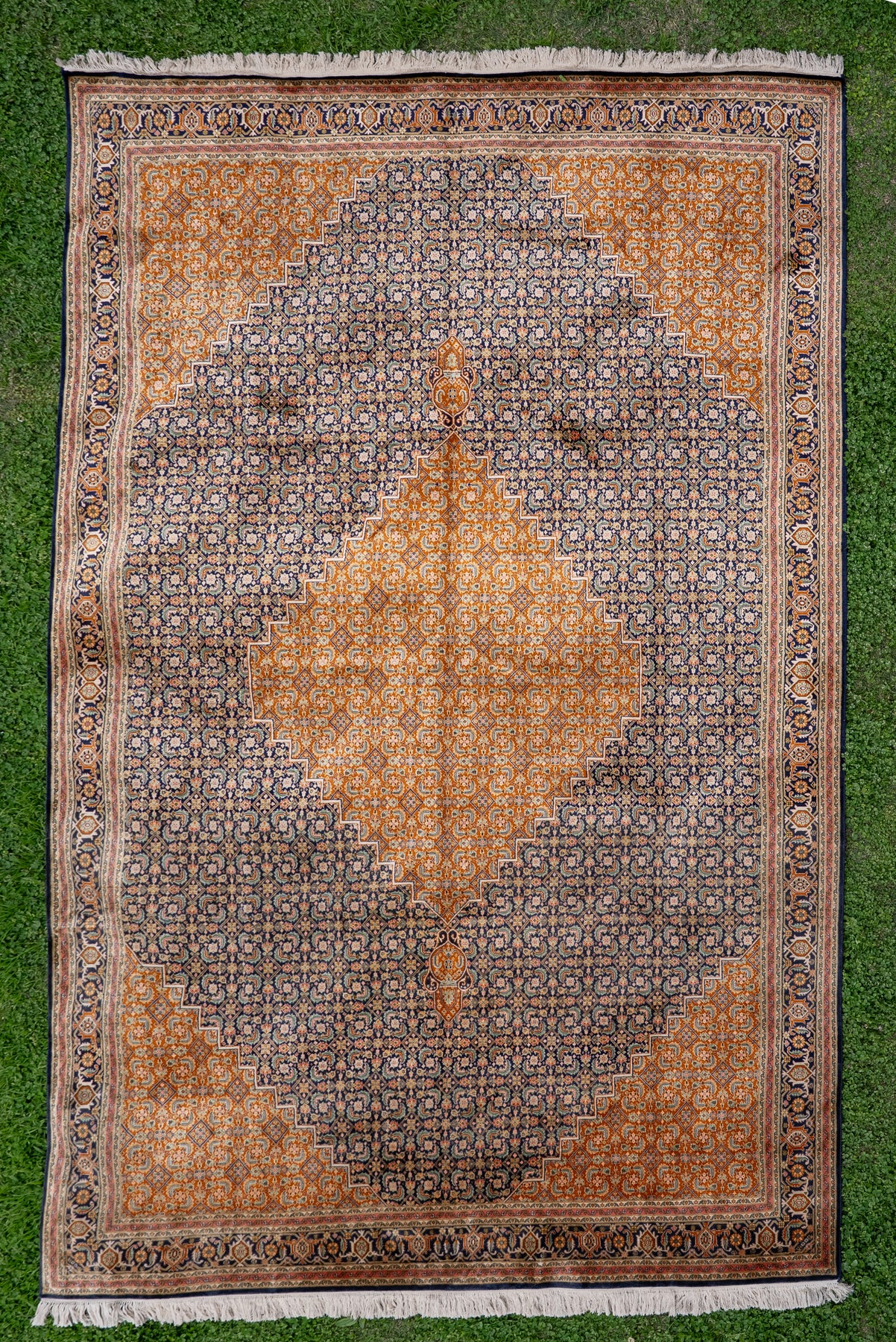 9ft x 6ft: Golden Mosaic Medallion: Hand Knotted Mulberry silk on silk Kashmiri Carpet