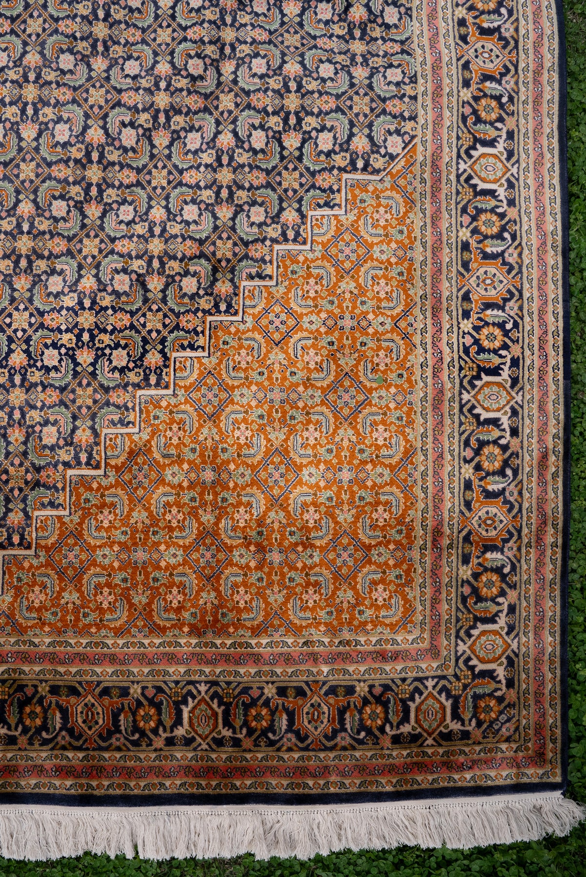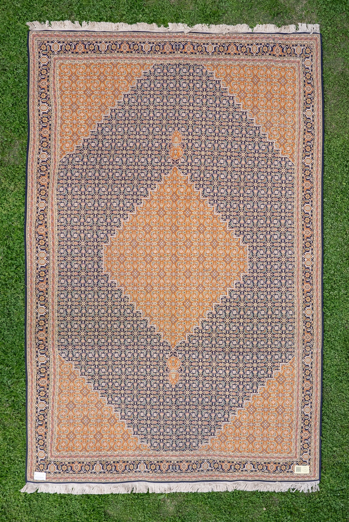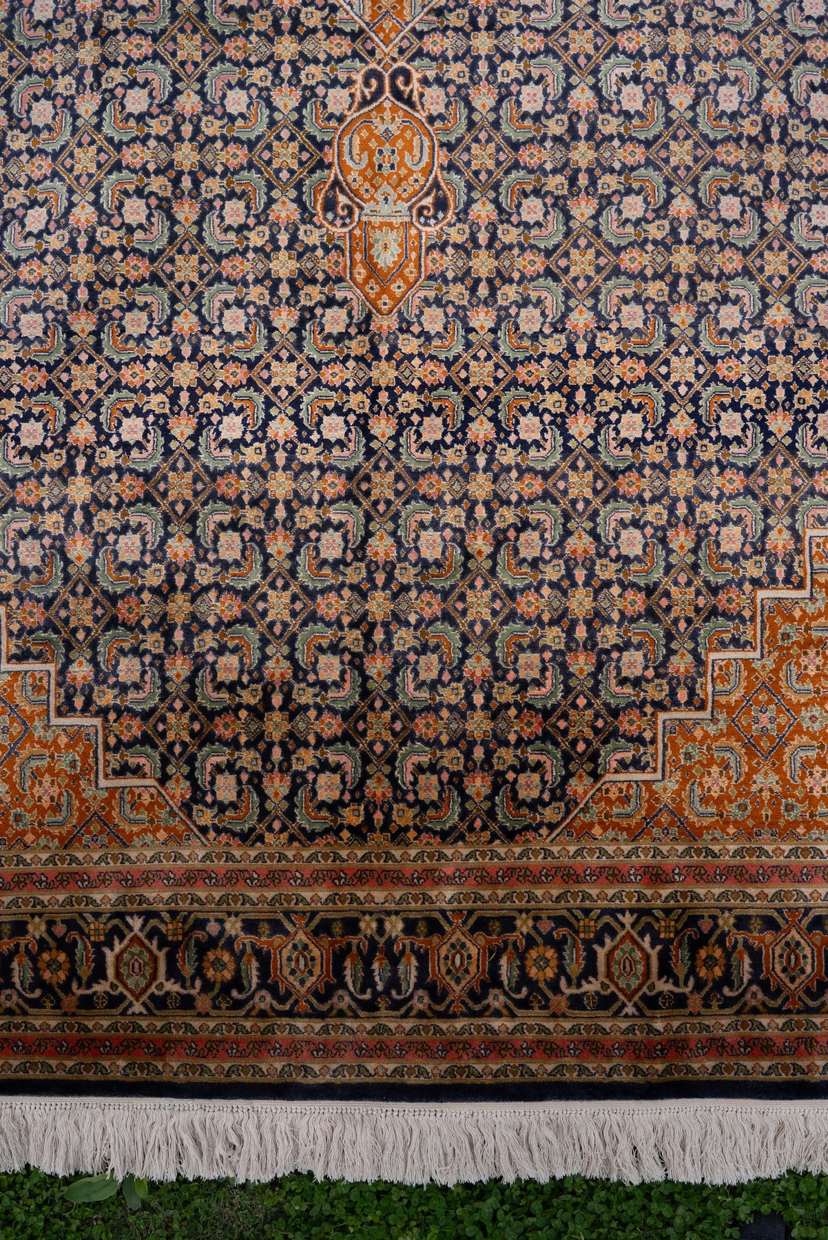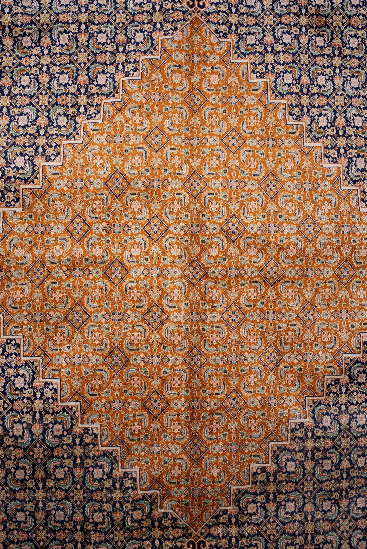 Crafted from pure mulberry silk on silk, the carpet offers a smooth, radiant surface that enhances its intricate detailing. Its warm tones and refined geometry make it a versatile piece, equally suited for contemporary and traditional settings.
