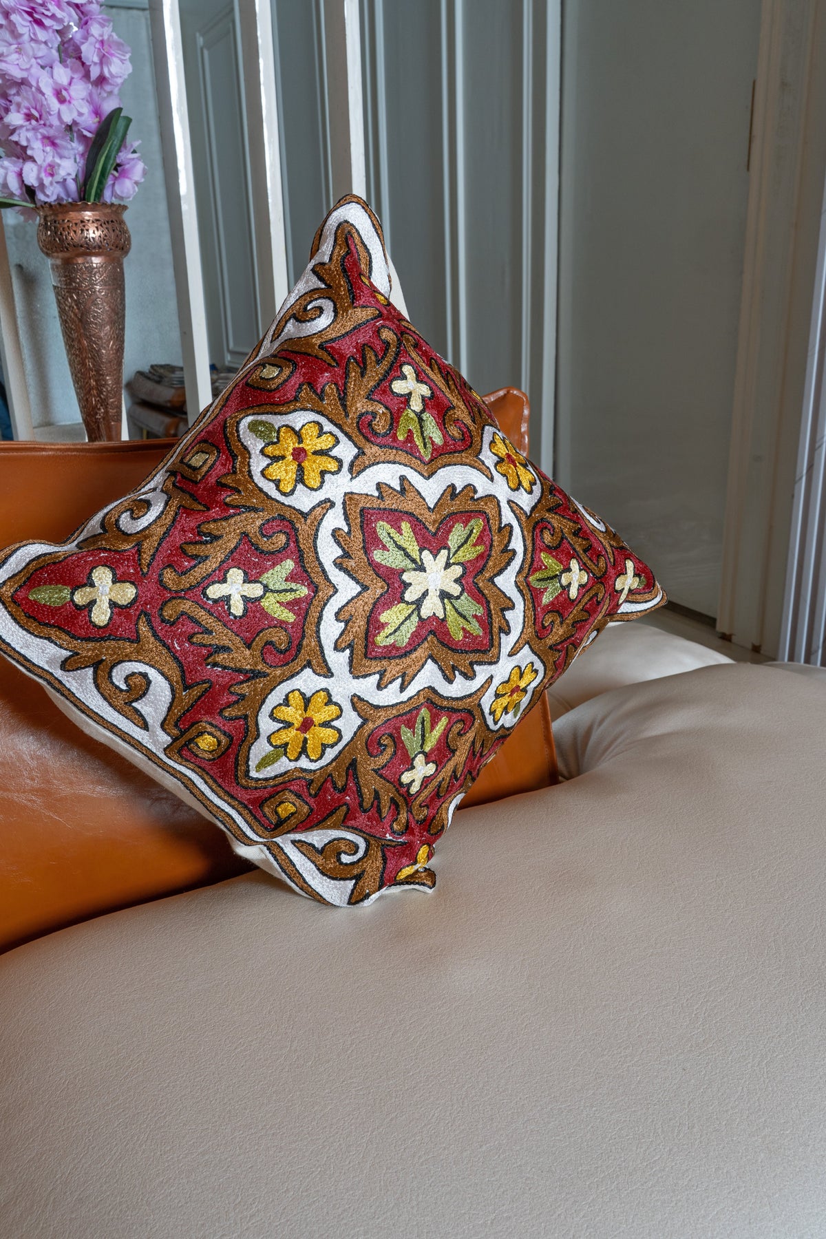 This pillow cover hand embroidered on cotton presents a classic floral medallion in shades of red, ivory, green, and golden yellow. The intricate vine detailing and bold central motif give it a rich, heritage inspired appeal.