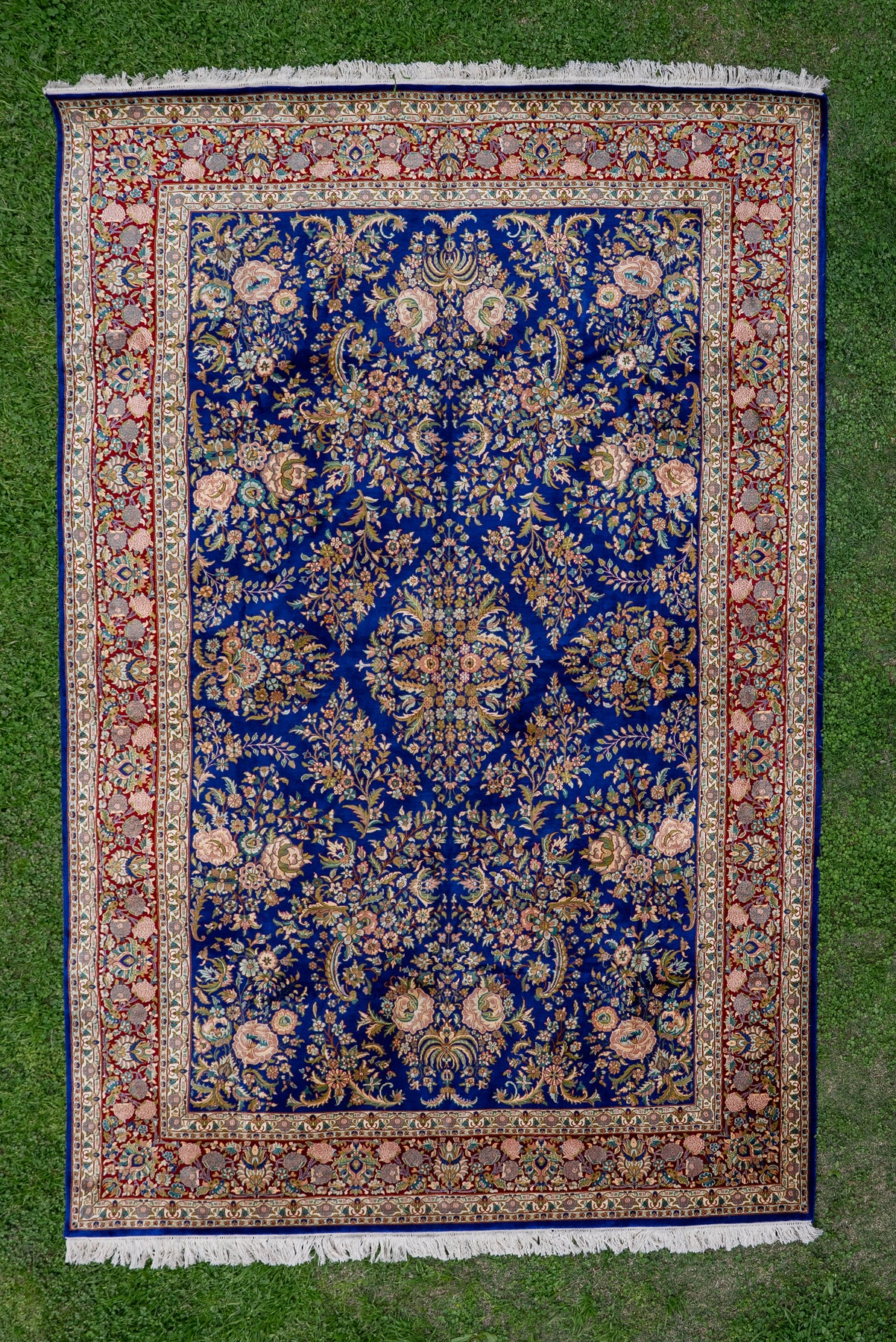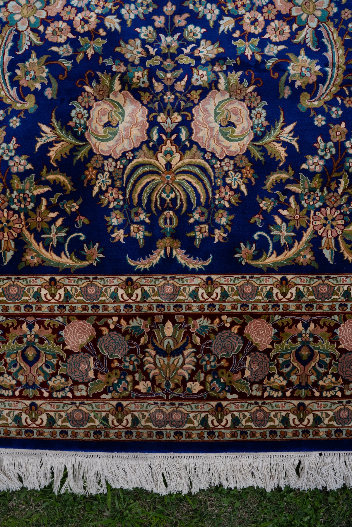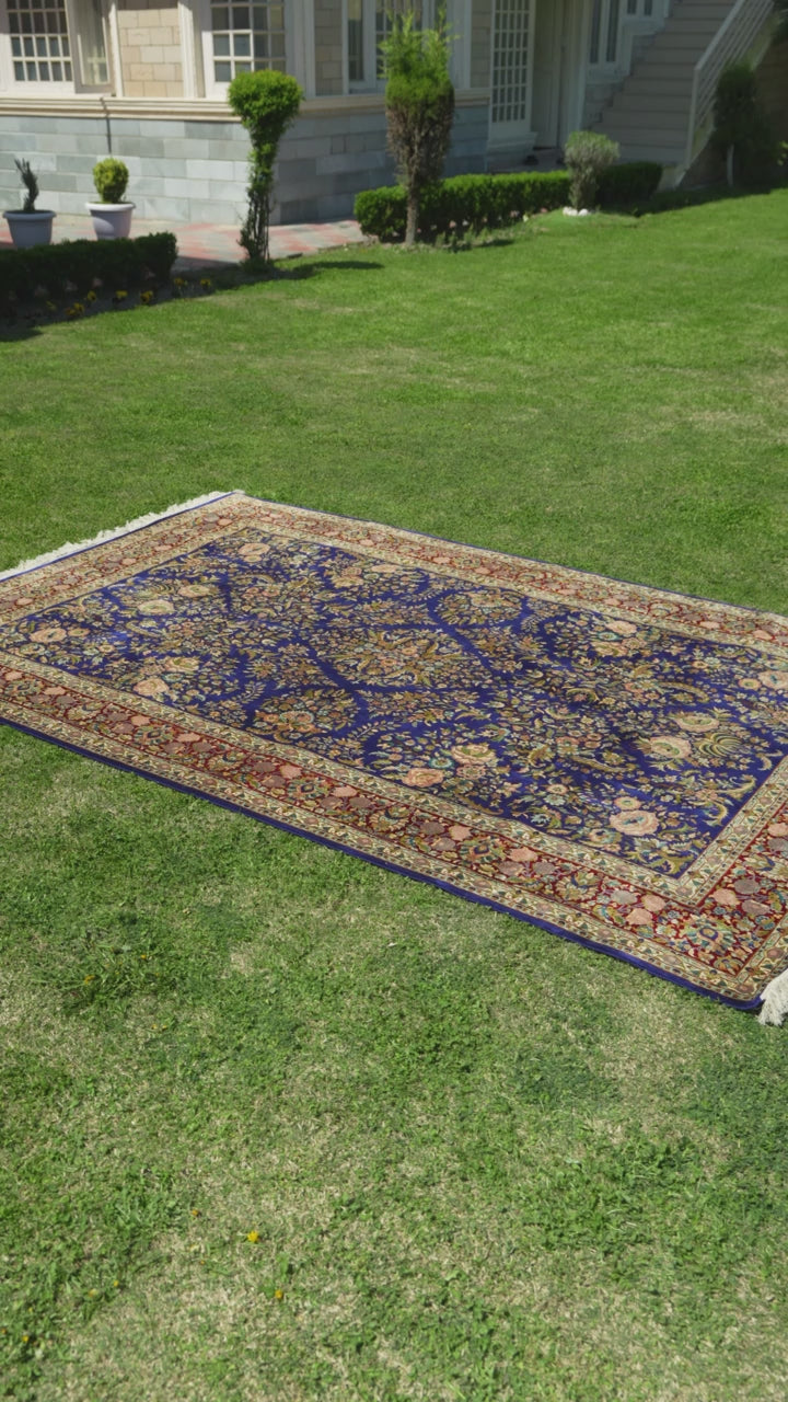 9ft x 6ft: Sapphire Blossom Garden: Hand Knotted Mulberry silk on silk Kashmiri Carpet