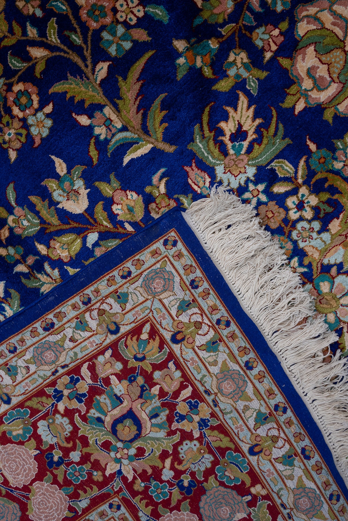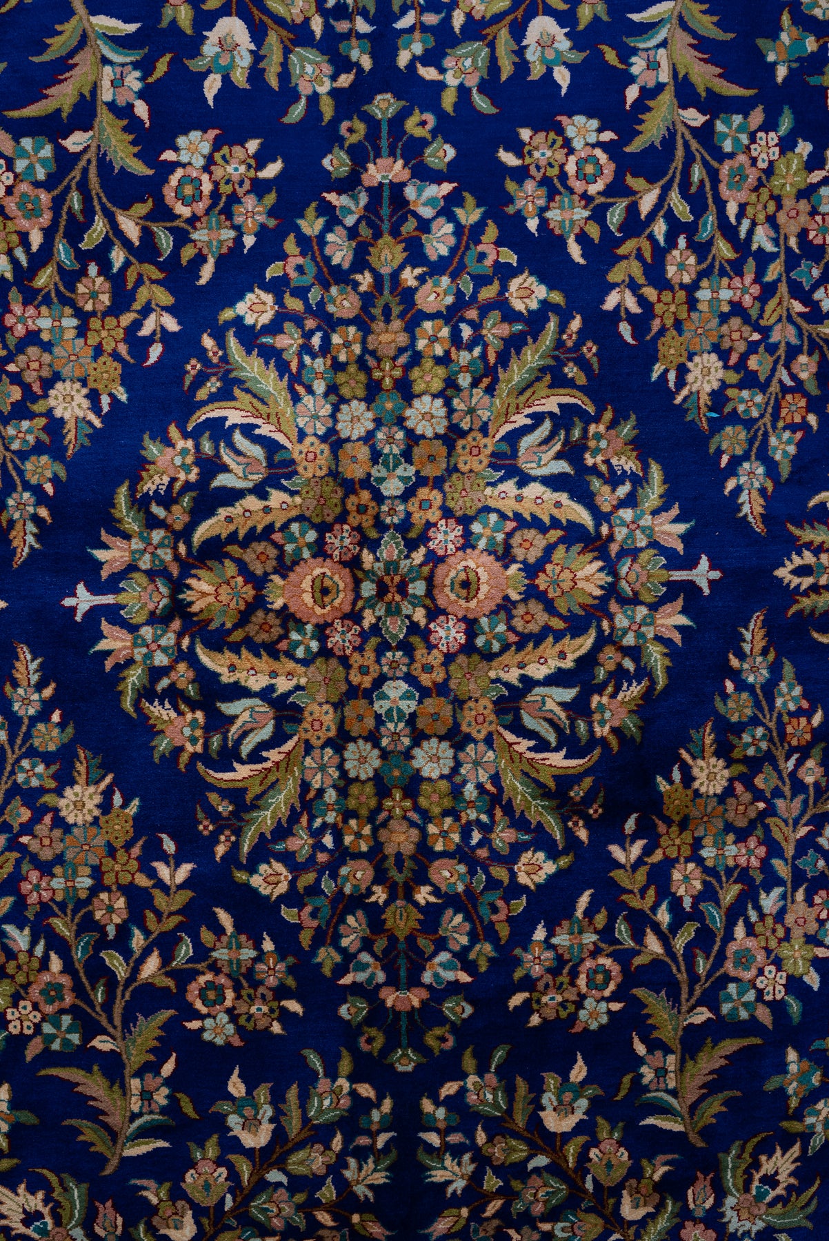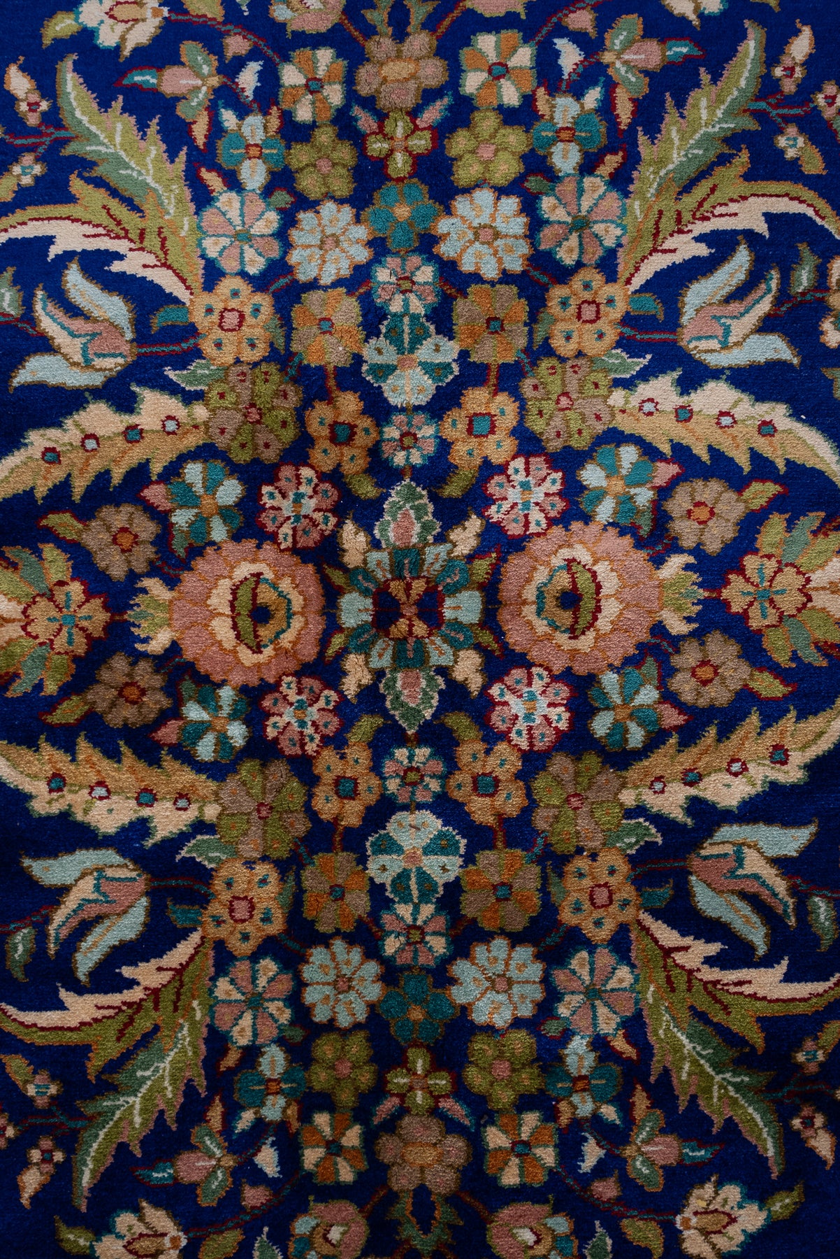 Set against a striking sapphire blue field, this carpet blossoms with an array of finely detailed floral motifs arranged in perfect balance. The vibrant border complements the rich center, creating a visual rhythm that feels both lively and elegant.