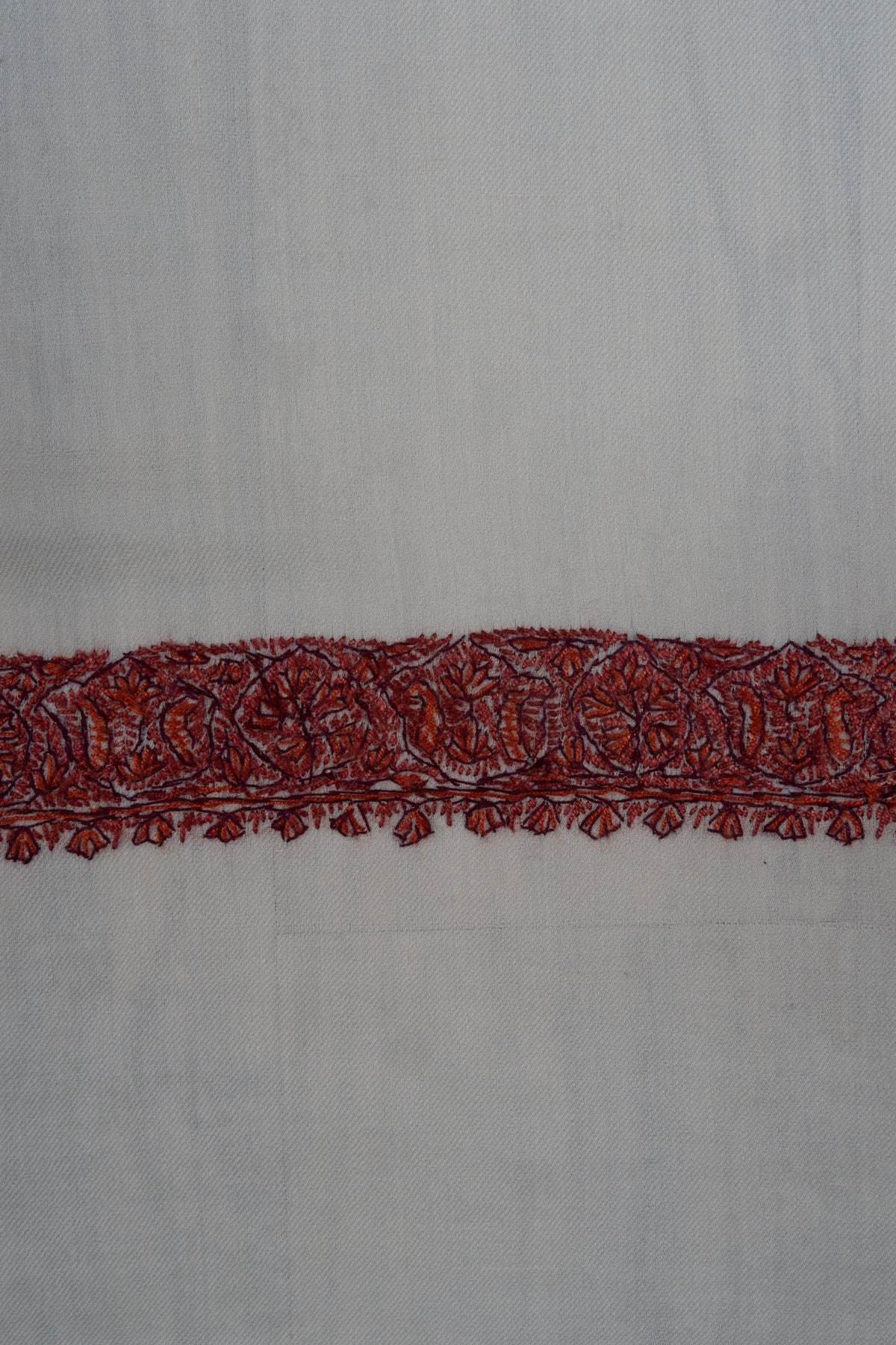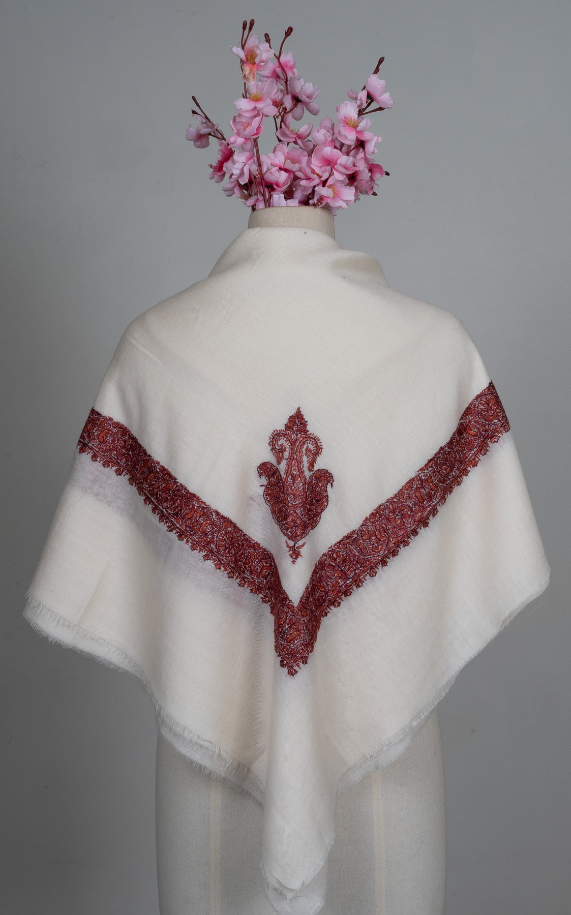 The embroidery is Sozni, the most intricate of Kashmiri needlework, executed entirely by hand. A rich crimson chevron border and ornate central paisley bloom across a pristine snow white base, creating a striking balance of purity and passion. This piece pairs effortlessly with neutral, bridal, and ceremonial ensembles with timeless elegance.