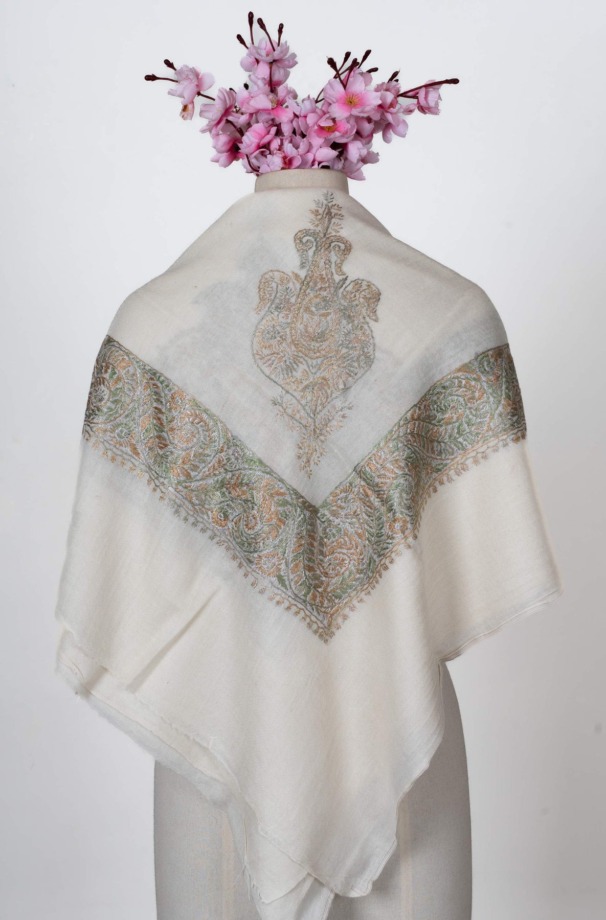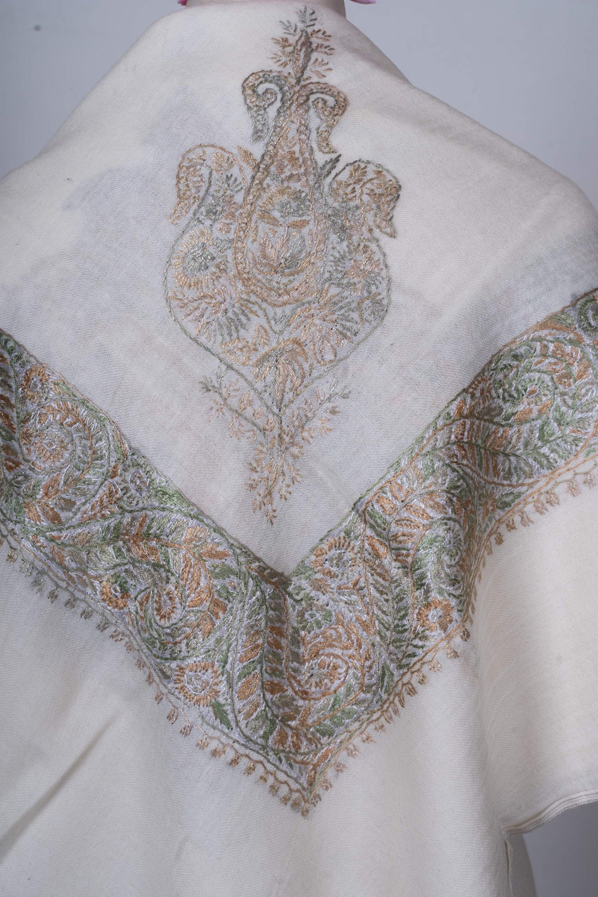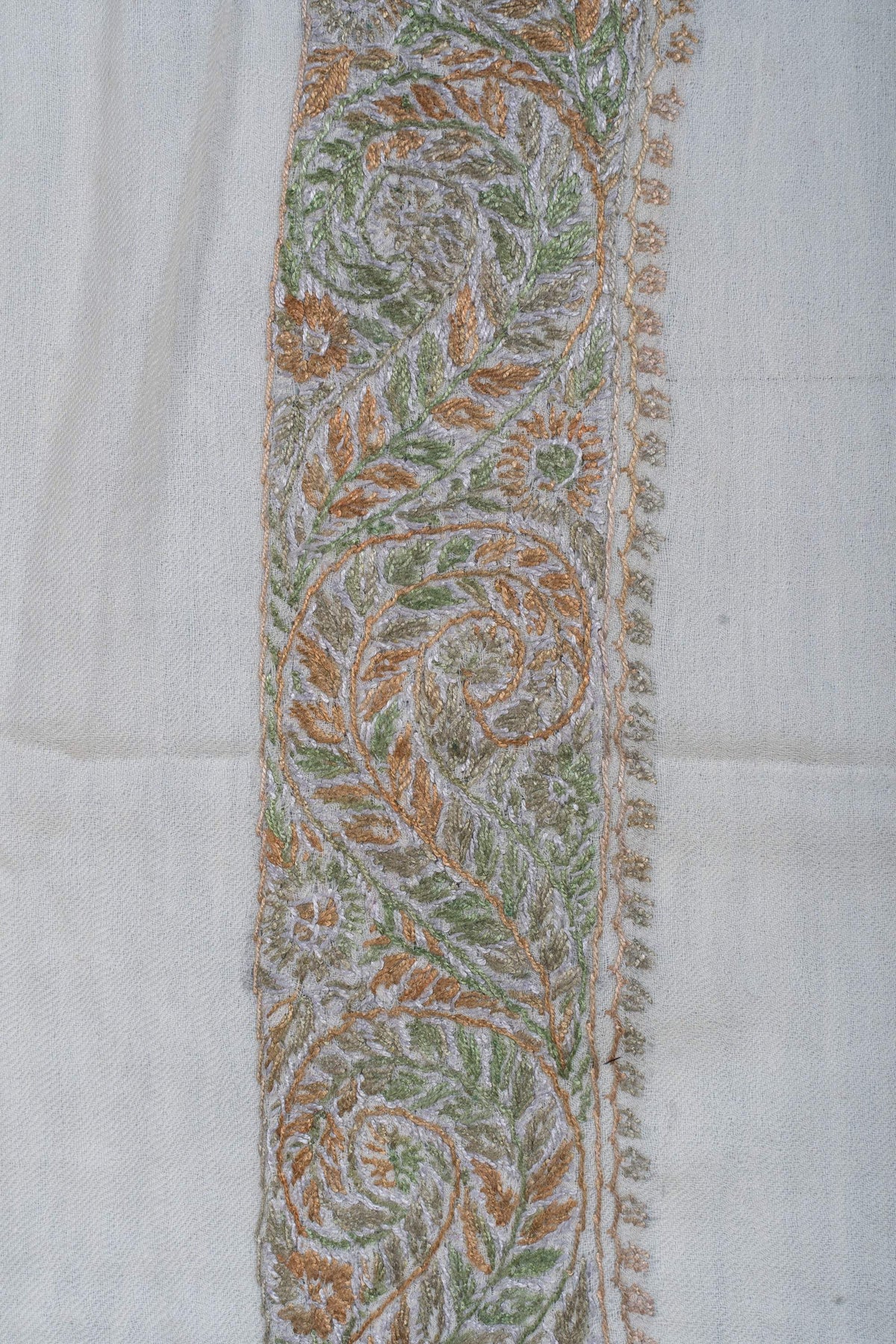 The embroidery is Sozni, executed entirely by hand in a muted palette of sage green, soft beige, and pale silver. Flowing paisleys and delicate leaf motifs form a harmonious border, while the central motif adds quiet depth. Subtle and timeless, this Rumal reflects the calm sophistication of Kashmiri artistry.