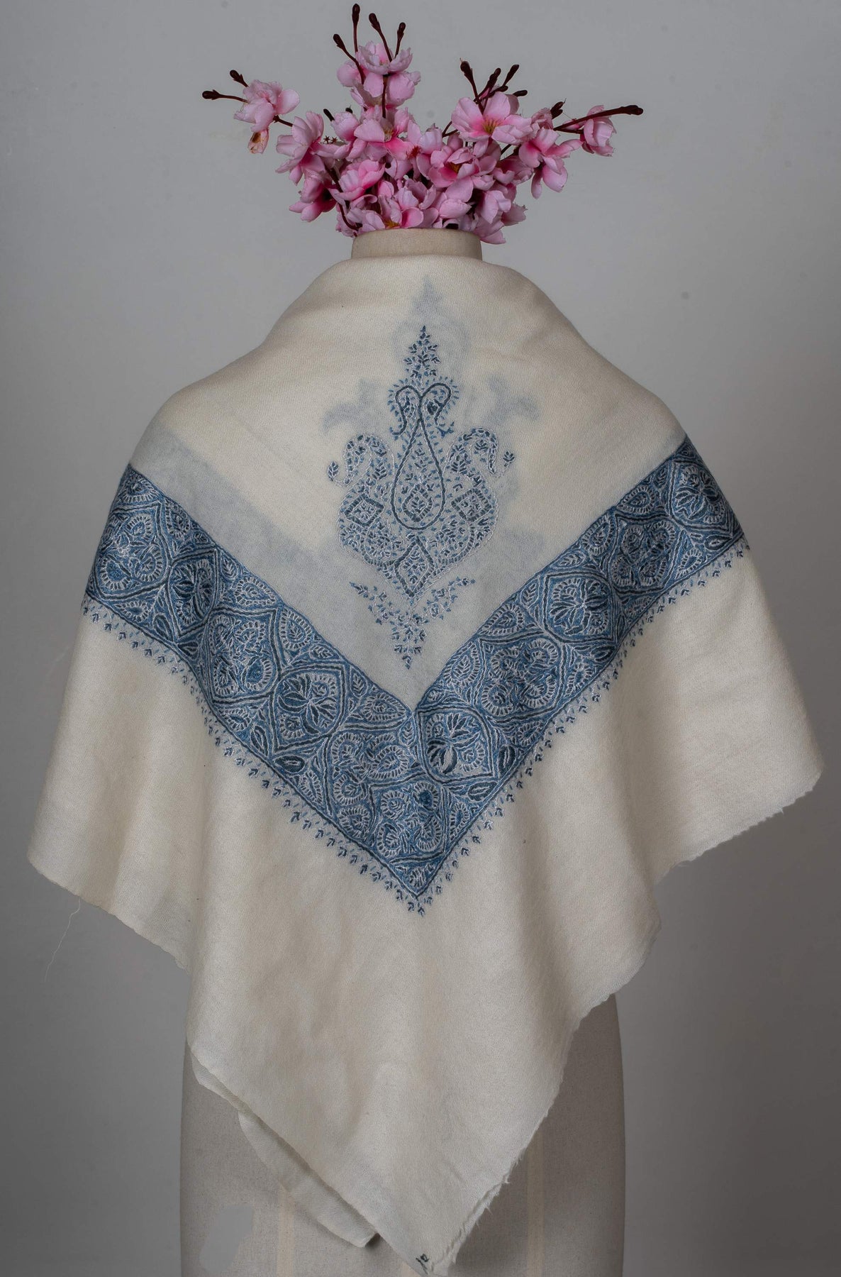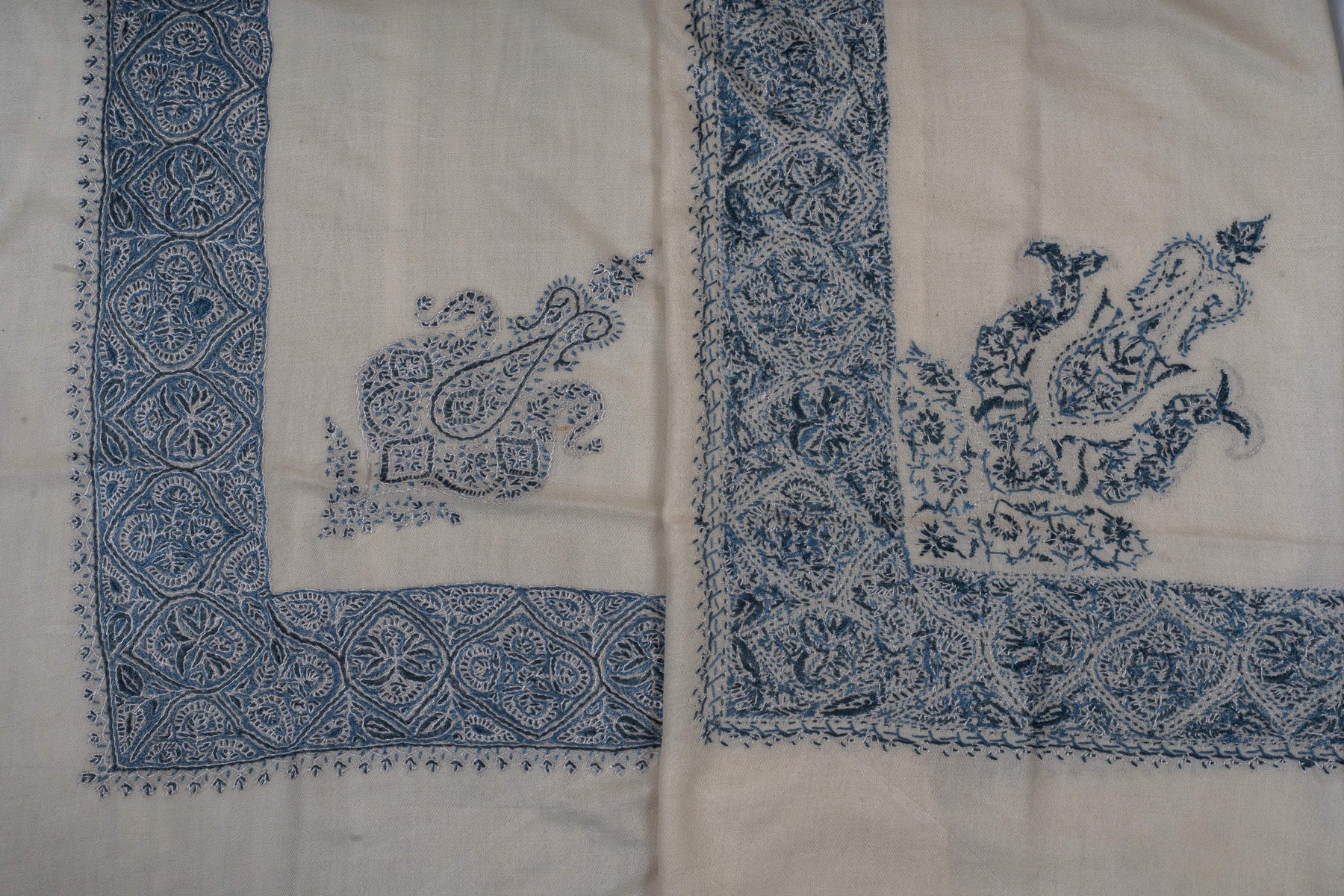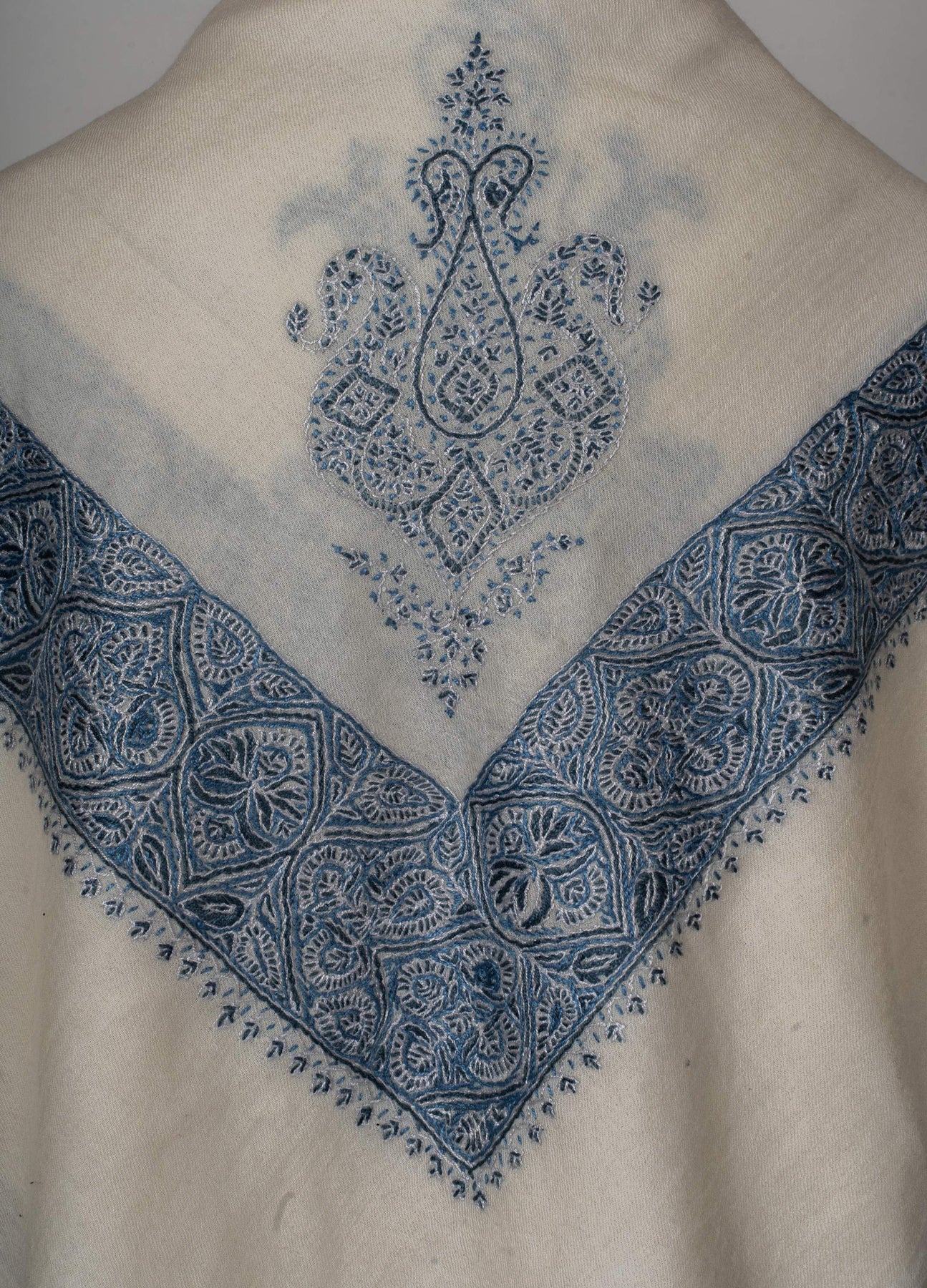 The embroidery is Sozni, executed entirely by hand in layered shades of indigo blue over a soft ivory base. A refined paisley-inspired central motif rises above a densely embroidered border, creating a calm yet striking visual rhythm. Timeless and composed, this Rumal reflects the quiet sophistication of Kashmiri craftsmanship.