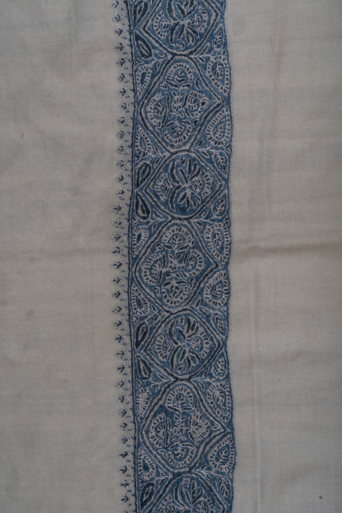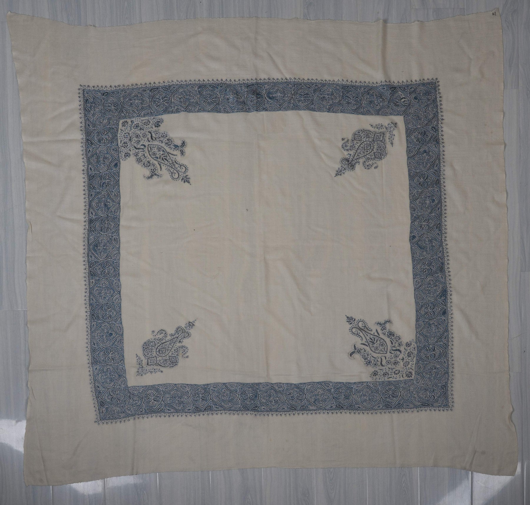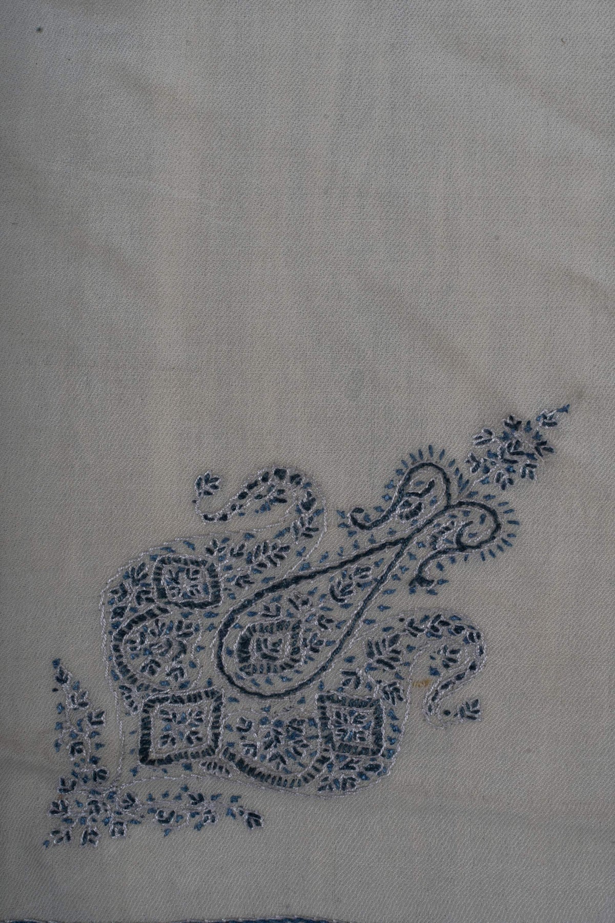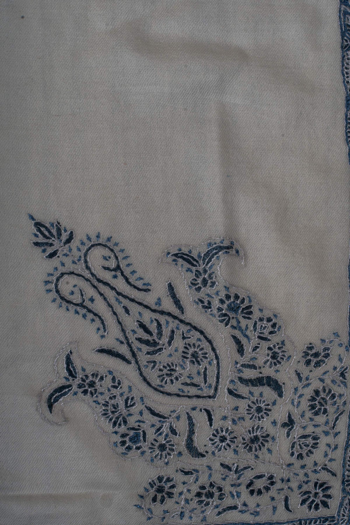 The embroidery is Sozni, executed entirely by hand in layered shades of indigo blue over a soft ivory base. A refined paisley-inspired central motif rises above a densely embroidered border, creating a calm yet striking visual rhythm. Timeless and composed, this Rumal reflects the quiet sophistication of Kashmiri craftsmanship.