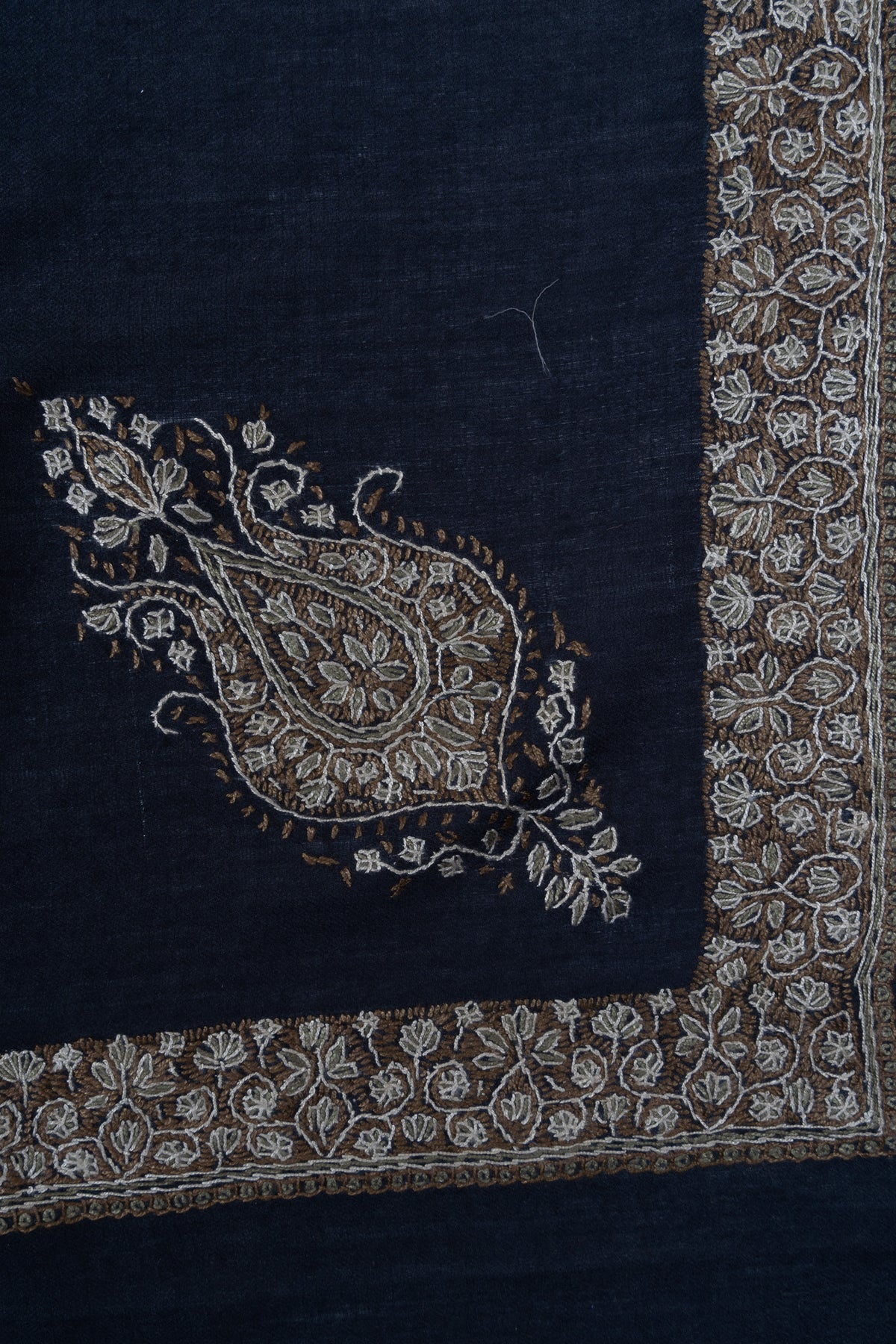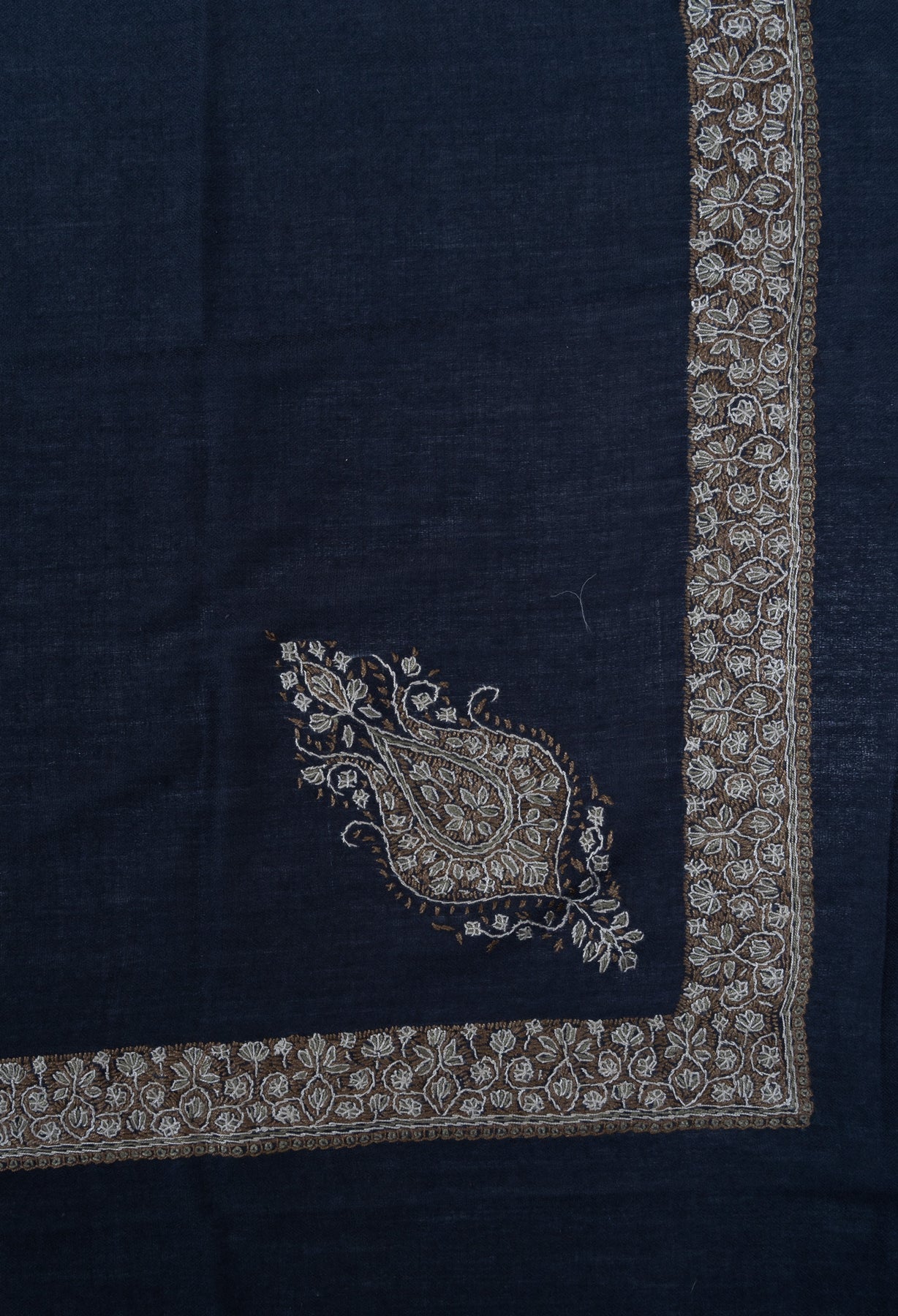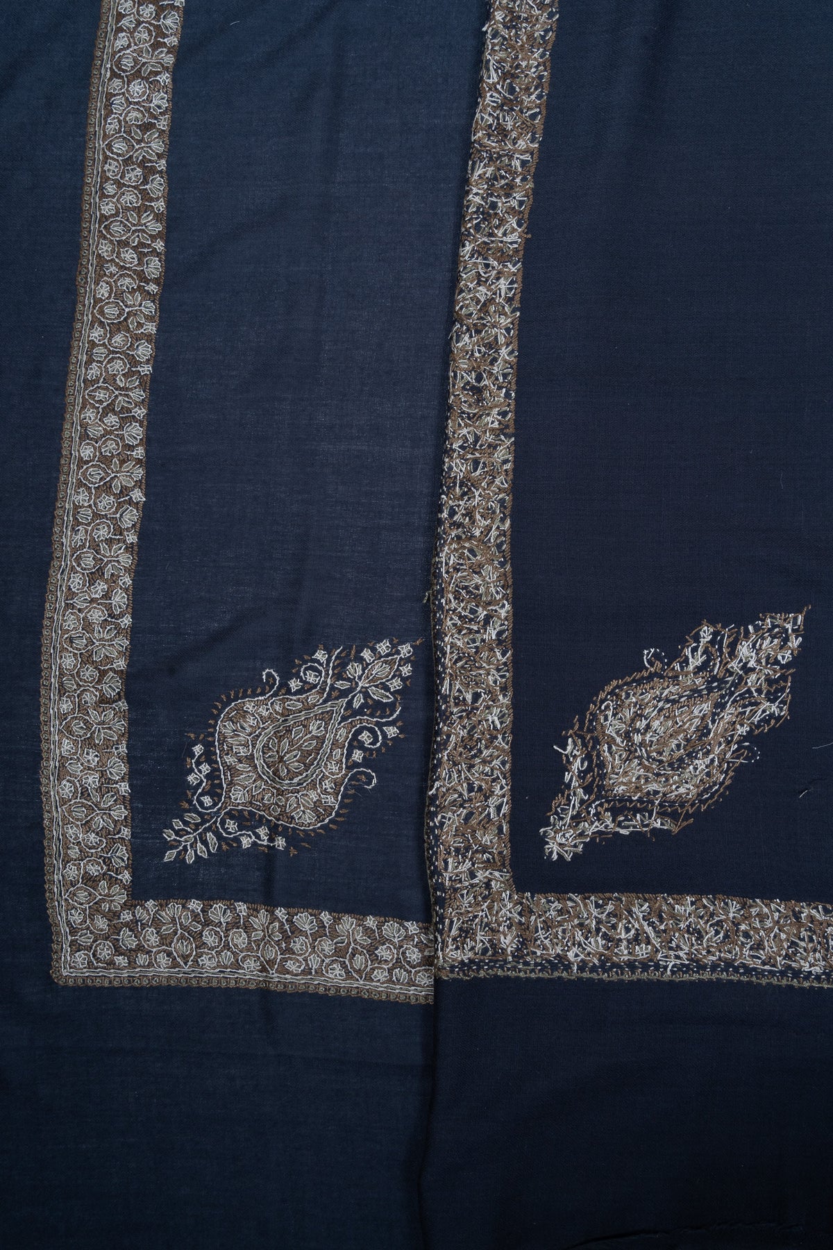 The embroidery is Sozni, the most intricate of Kashmiri needlework, executed entirely by hand. Antique gold and soft ivory threads form an elaborate border lattice and a regal central paisley motif over a deep midnight navy base. The contrast lends this Rumal a stately elegance, making it ideal for evening wear and formal winter ensembles.