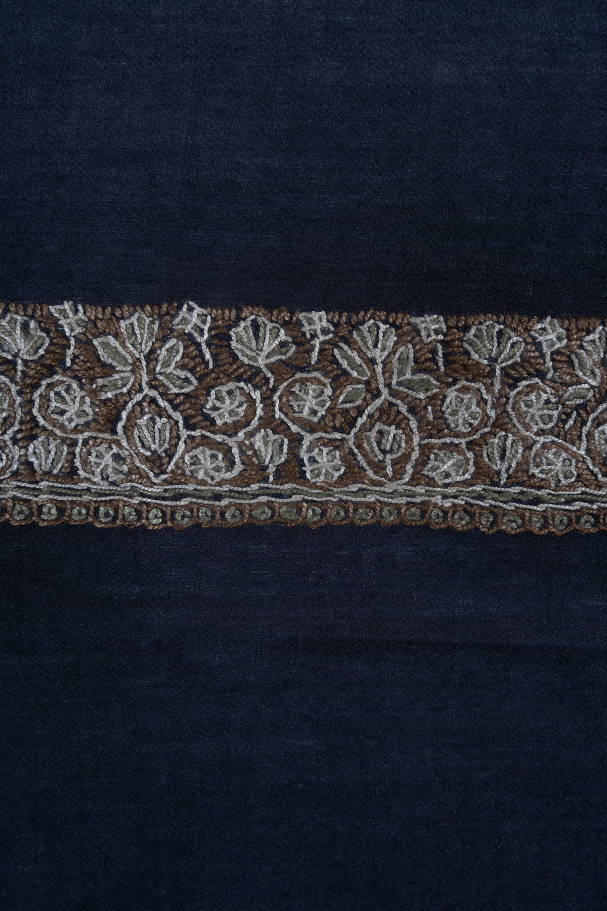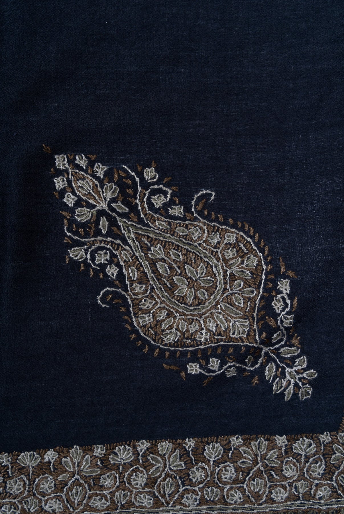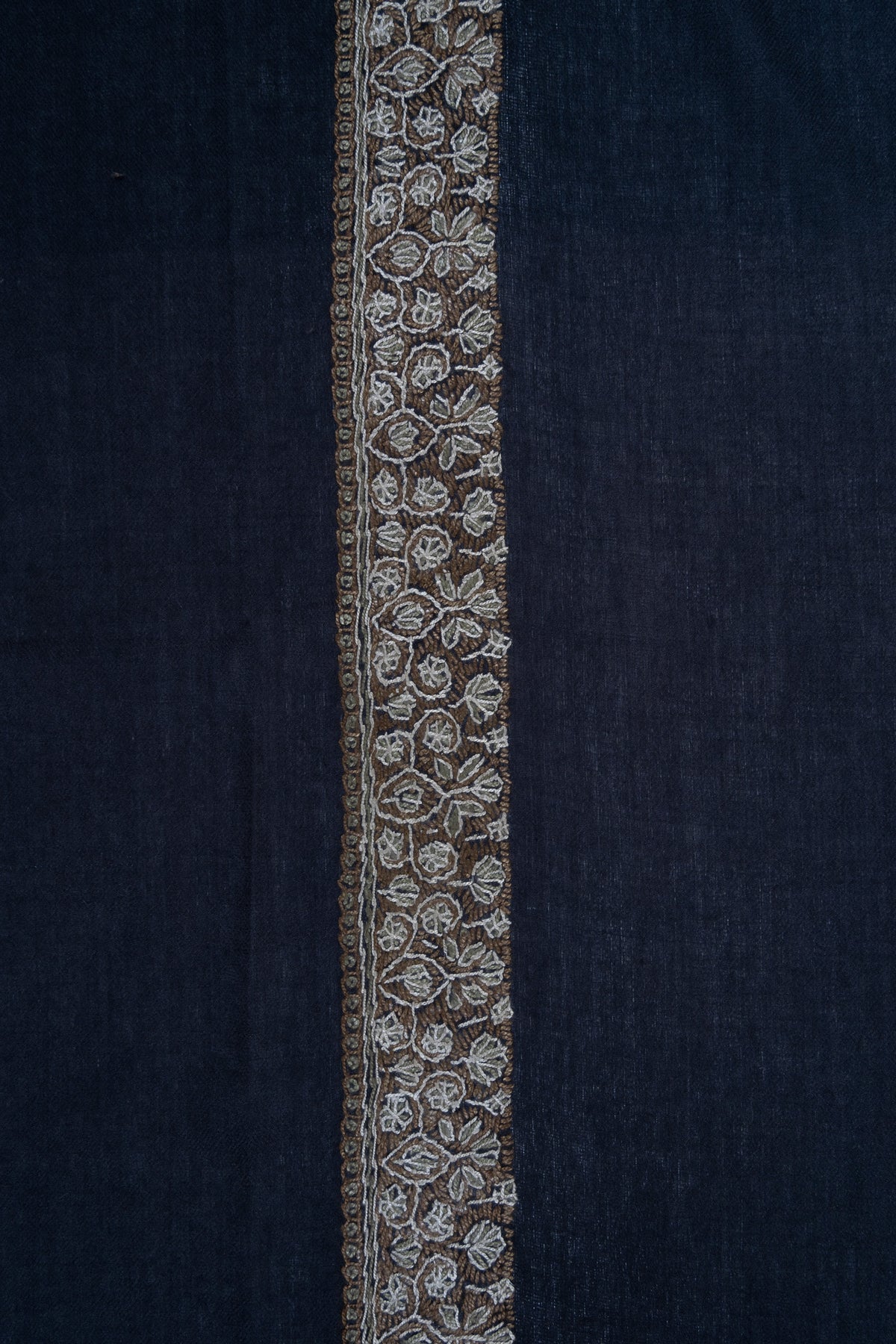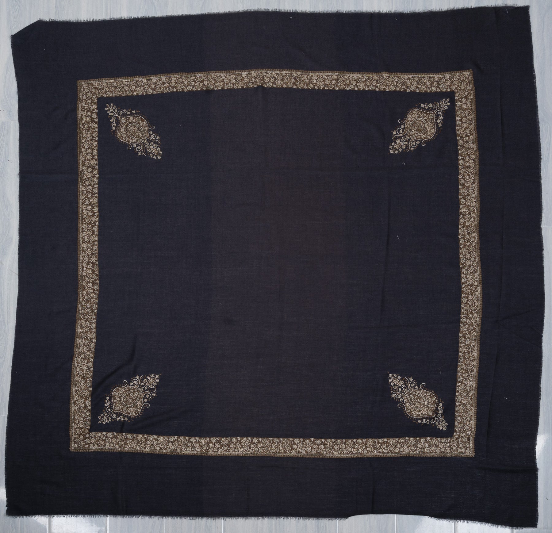 The embroidery is Sozni, the most intricate of Kashmiri needlework, executed entirely by hand. Antique gold and soft ivory threads form an elaborate border lattice and a regal central paisley motif over a deep midnight navy base. The contrast lends this Rumal a stately elegance, making it ideal for evening wear and formal winter ensembles.