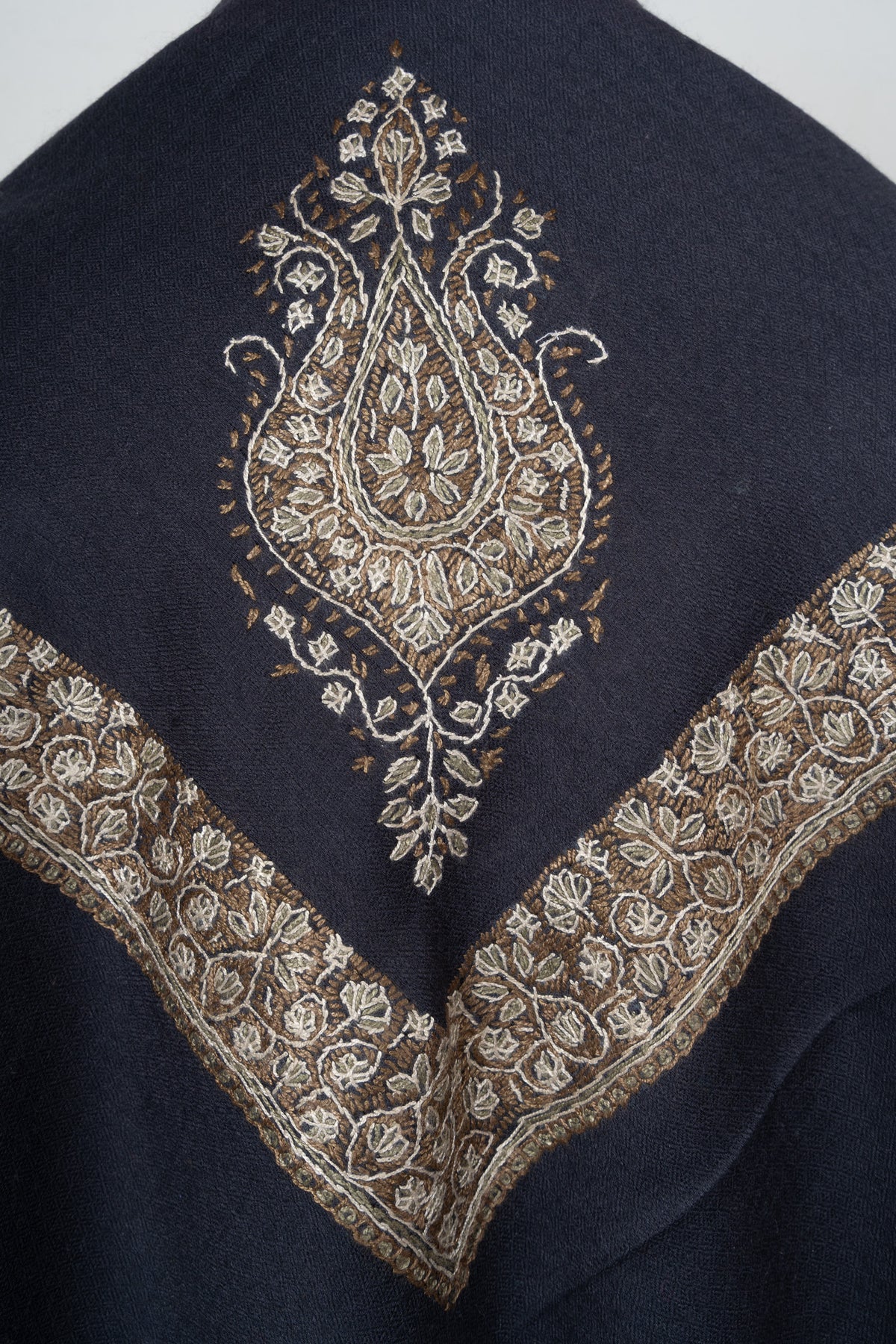 Wrap yourself in the elegance of Kashmir with the Midnight Crest Rumal — Sozni Hand Embroidered, a hand-embroidered masterpiece designed for both tradition and modern grace. Crafted from ultra-fine 120-count merino wool, this Rumal is feather-light, breathable, and soft against the skin. Measuring 54 x 54 inches square, it is the perfect size for styling as a tarha/hijab, shoulder wrap, or a refined layering piece.