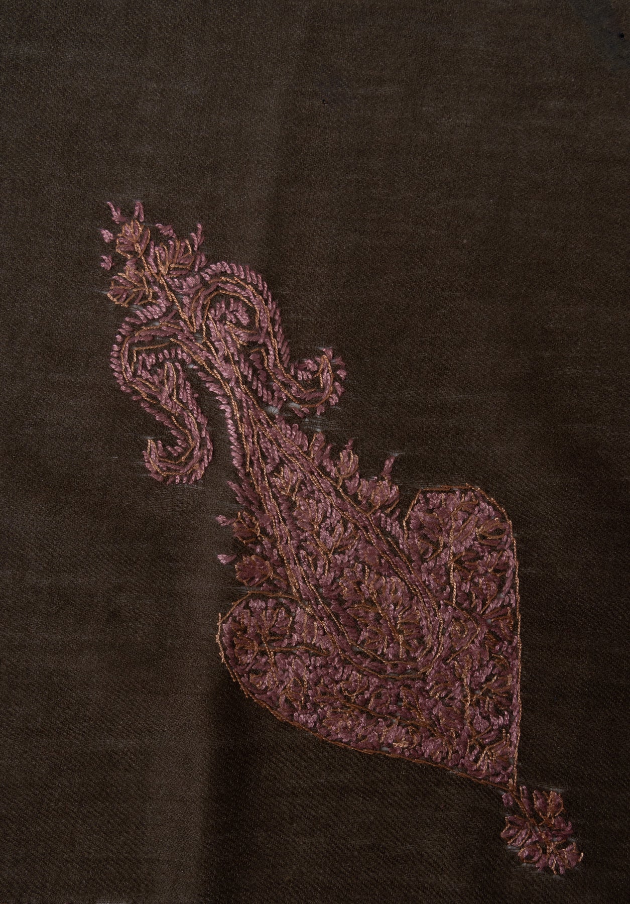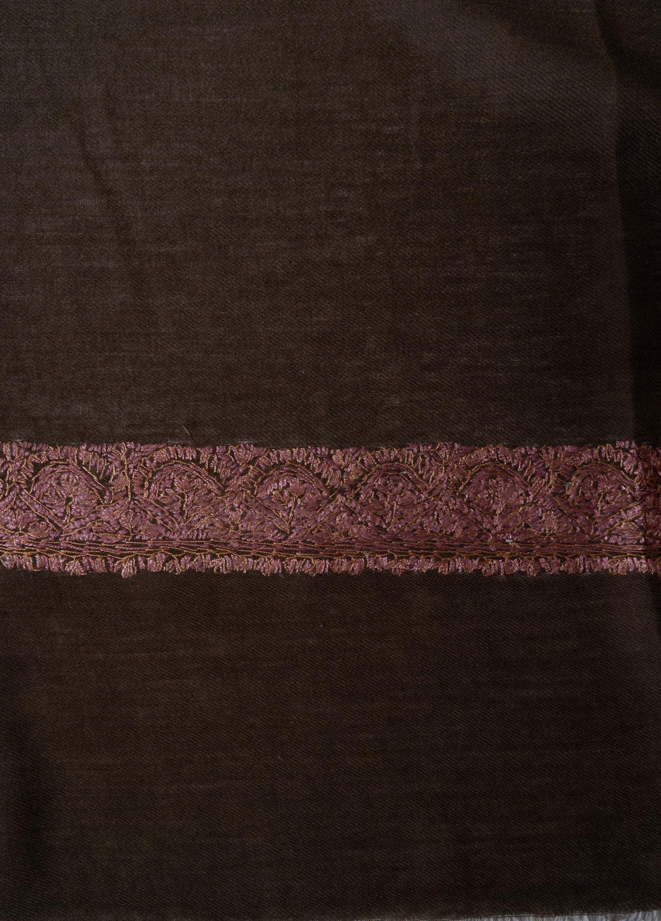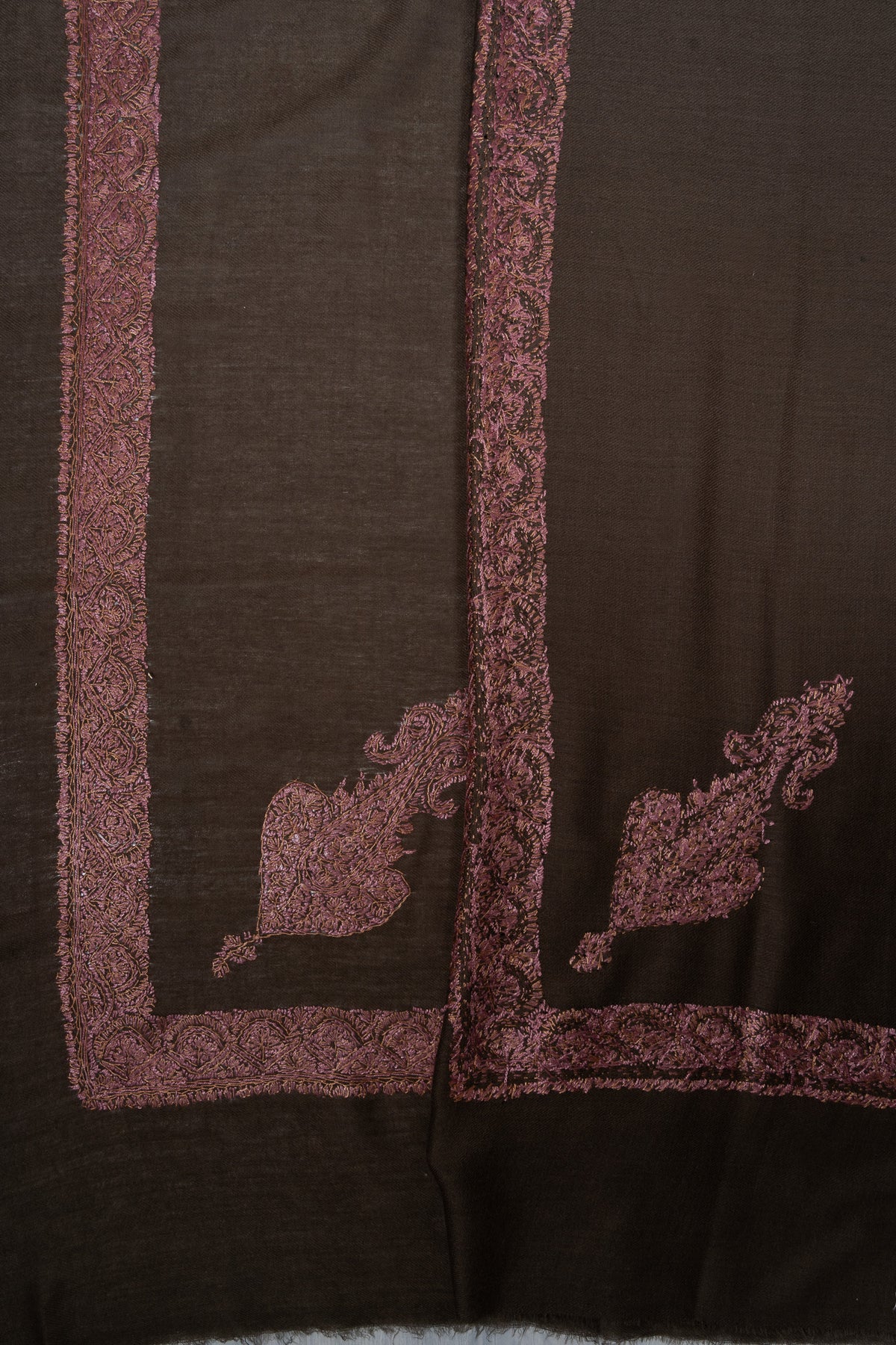 The embroidery is Sozni, showcasing a richly detailed border and an elaborate central paisley motif stitched entirely by hand. Warm rose-gold and muted bronze threads shimmer against a deep charcoal-brown base, creating a dramatic yet elegant piece that reflects the timeless soul of Kashmiri craftsmanship.