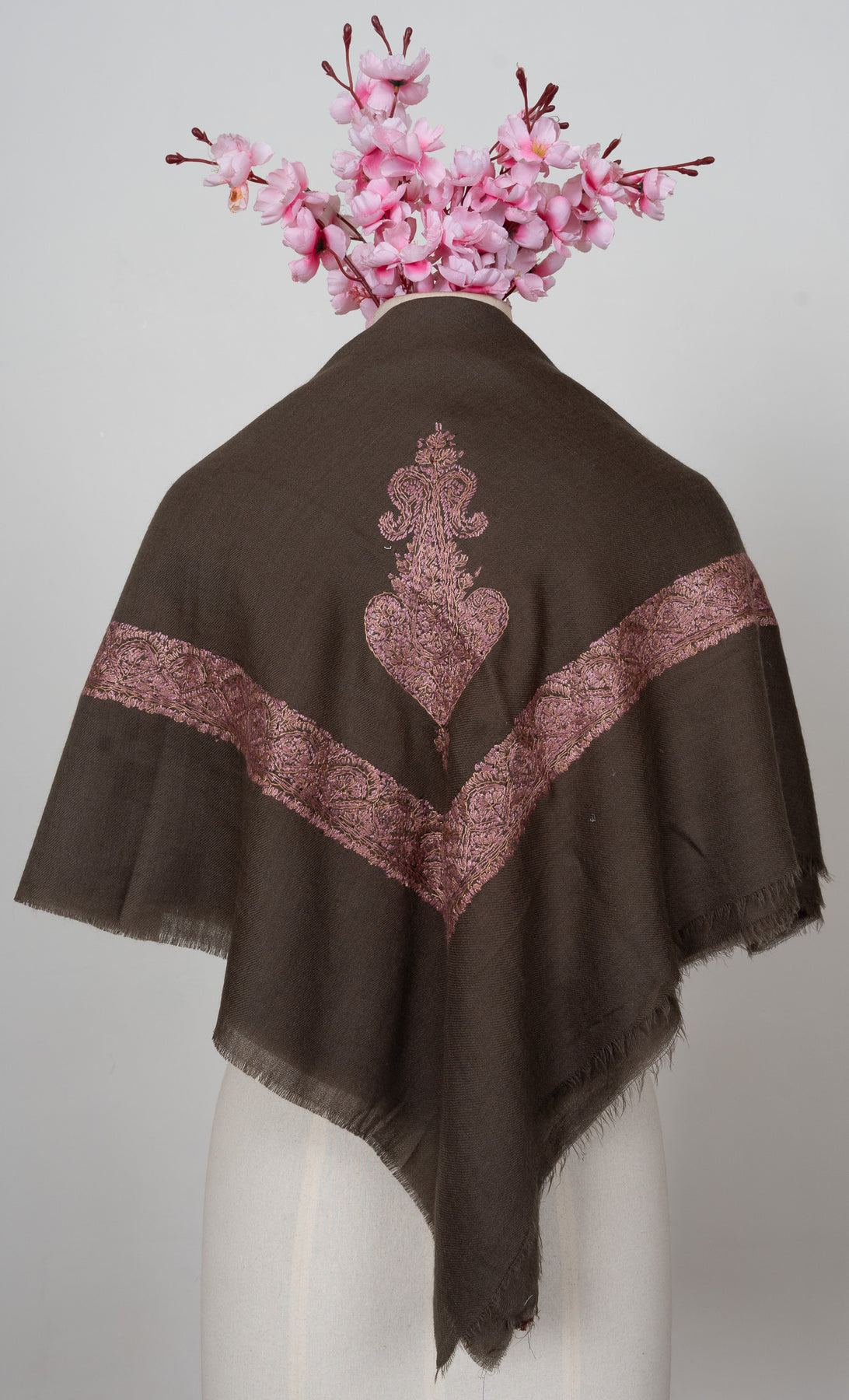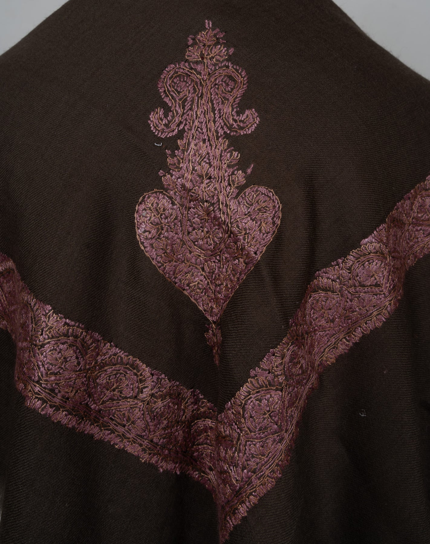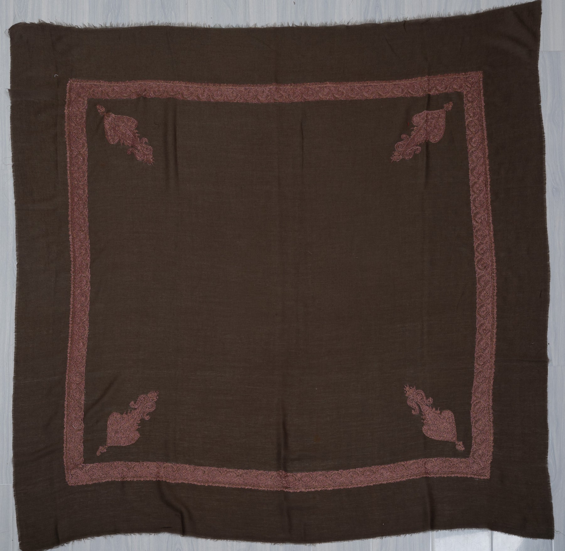 The embroidery is Sozni, showcasing a richly detailed border and an elaborate central paisley motif stitched entirely by hand. Warm rose-gold and muted bronze threads shimmer against a deep charcoal-brown base, creating a dramatic yet elegant piece that reflects the timeless soul of Kashmiri craftsmanship.