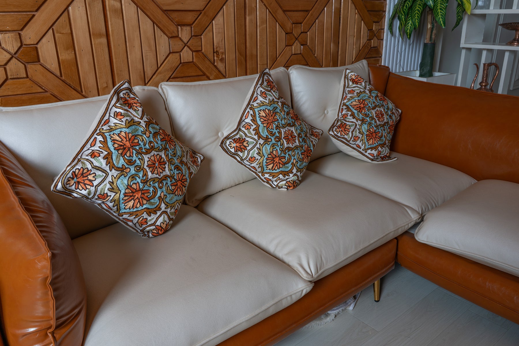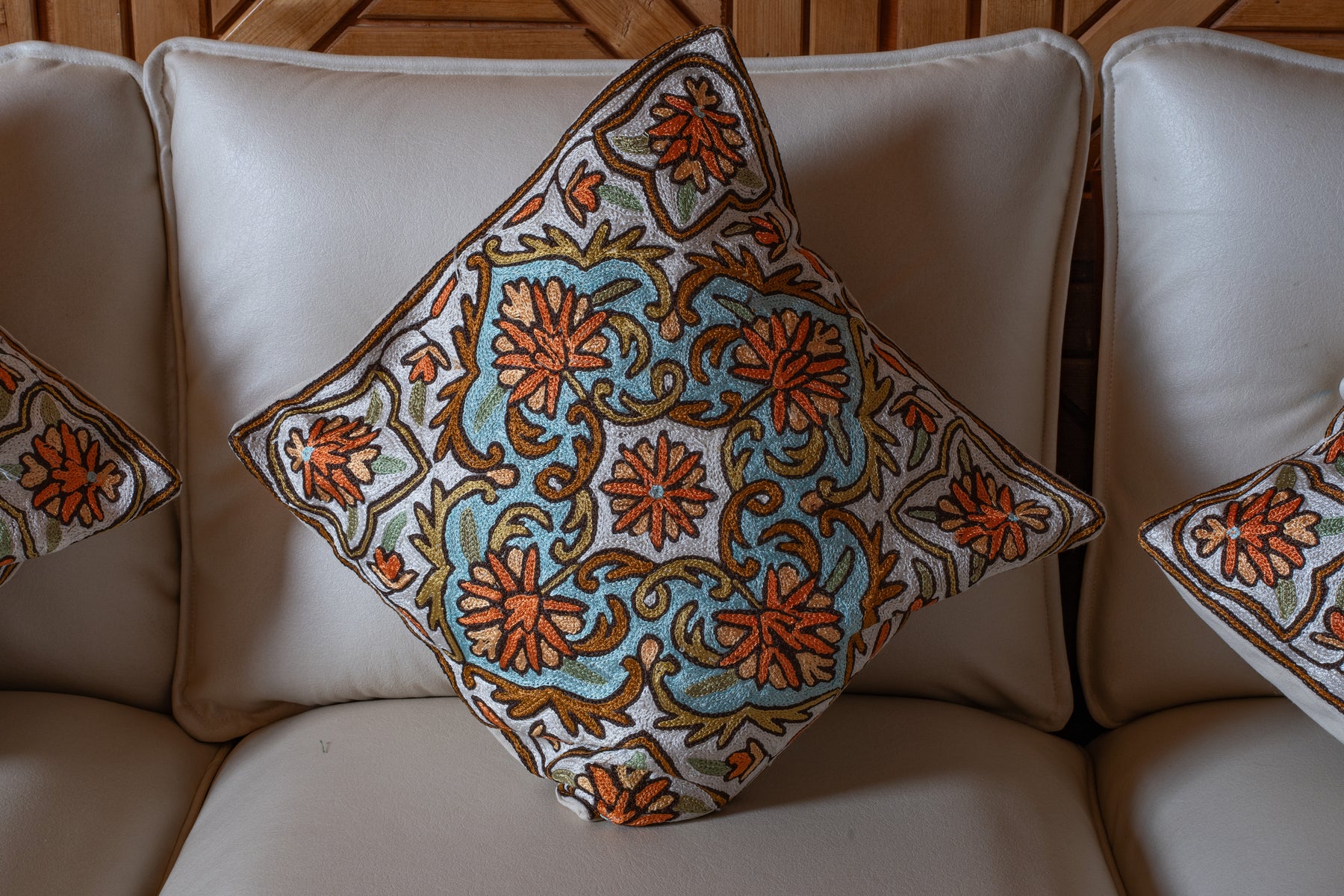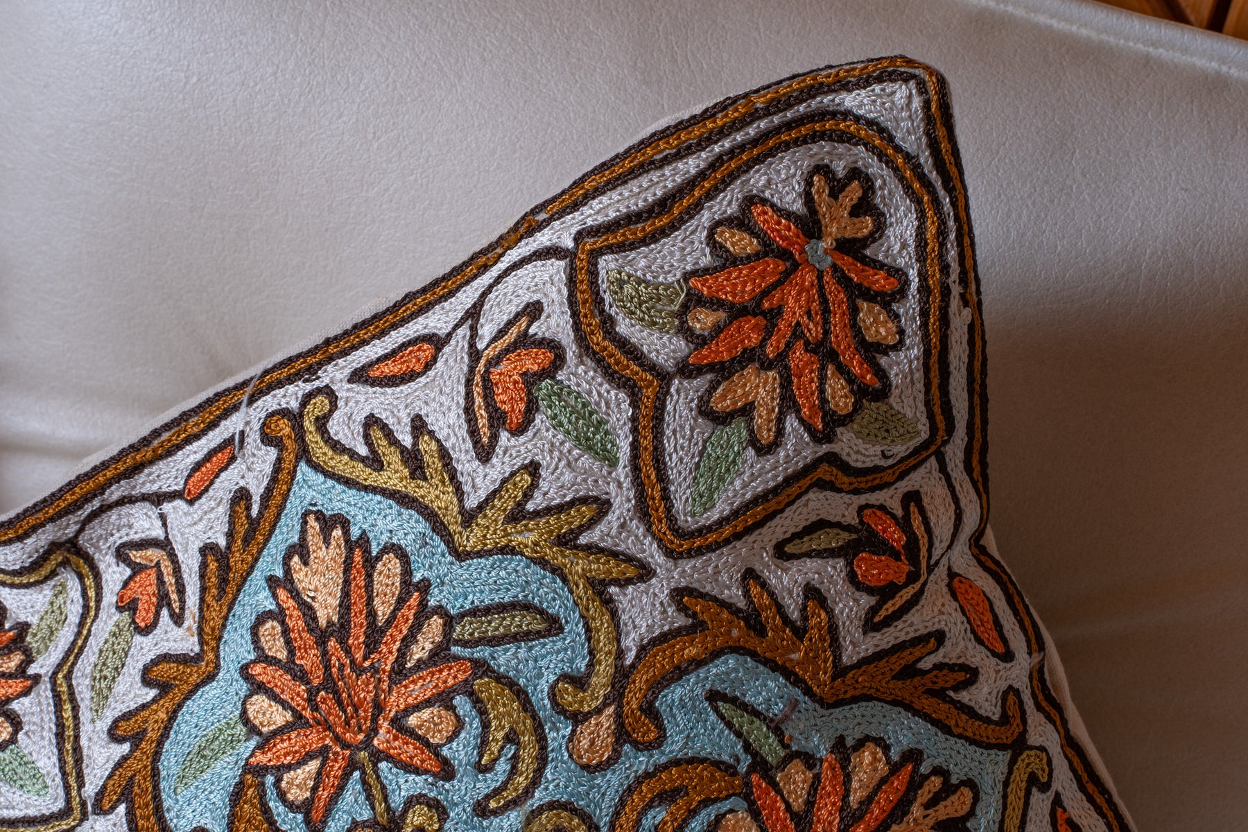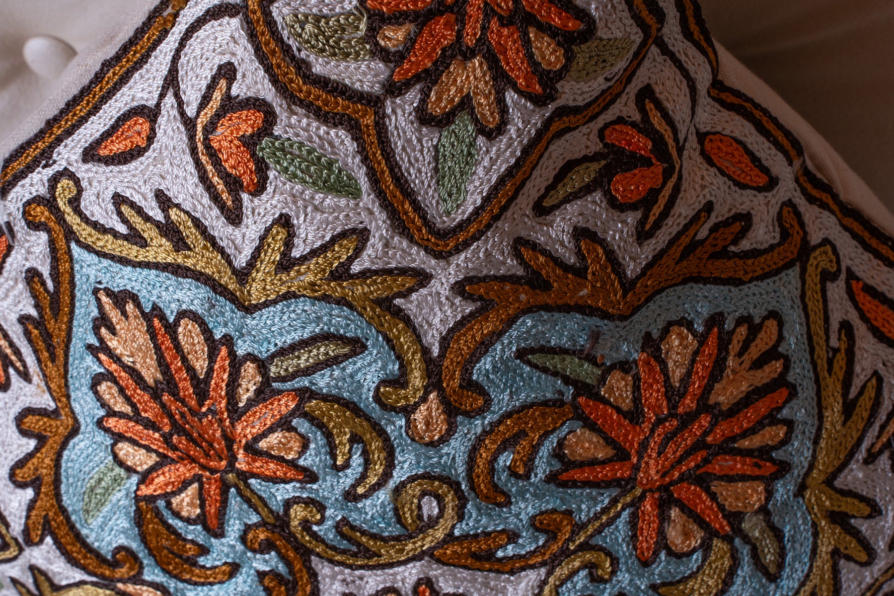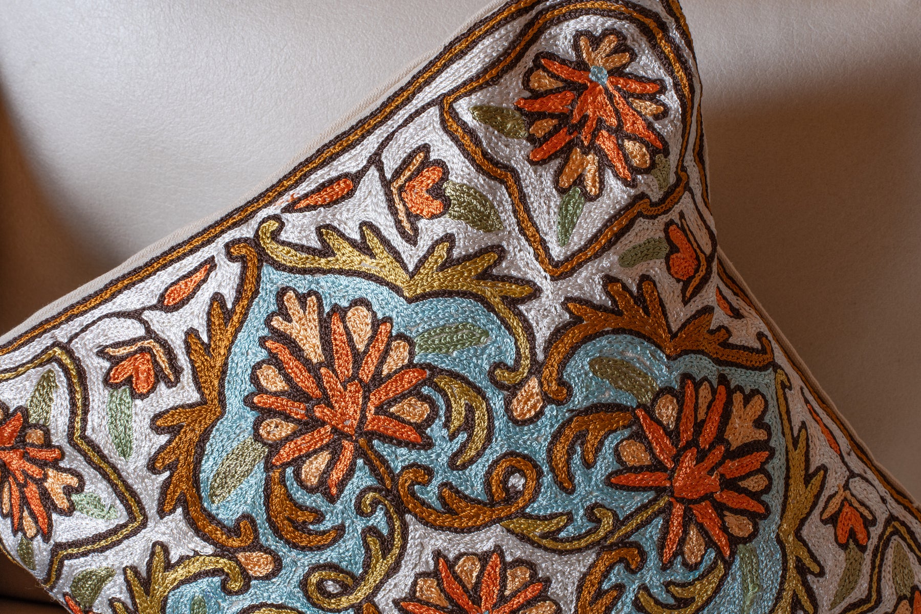 This pillow cover hand embroidered on cotton presents a soothing blend of earthy orange florals and soft teal scrollwork set against an ivory base. The flowing vine motifs create a sense of movement, while the symmetrical layout keeps the design structured and refined.