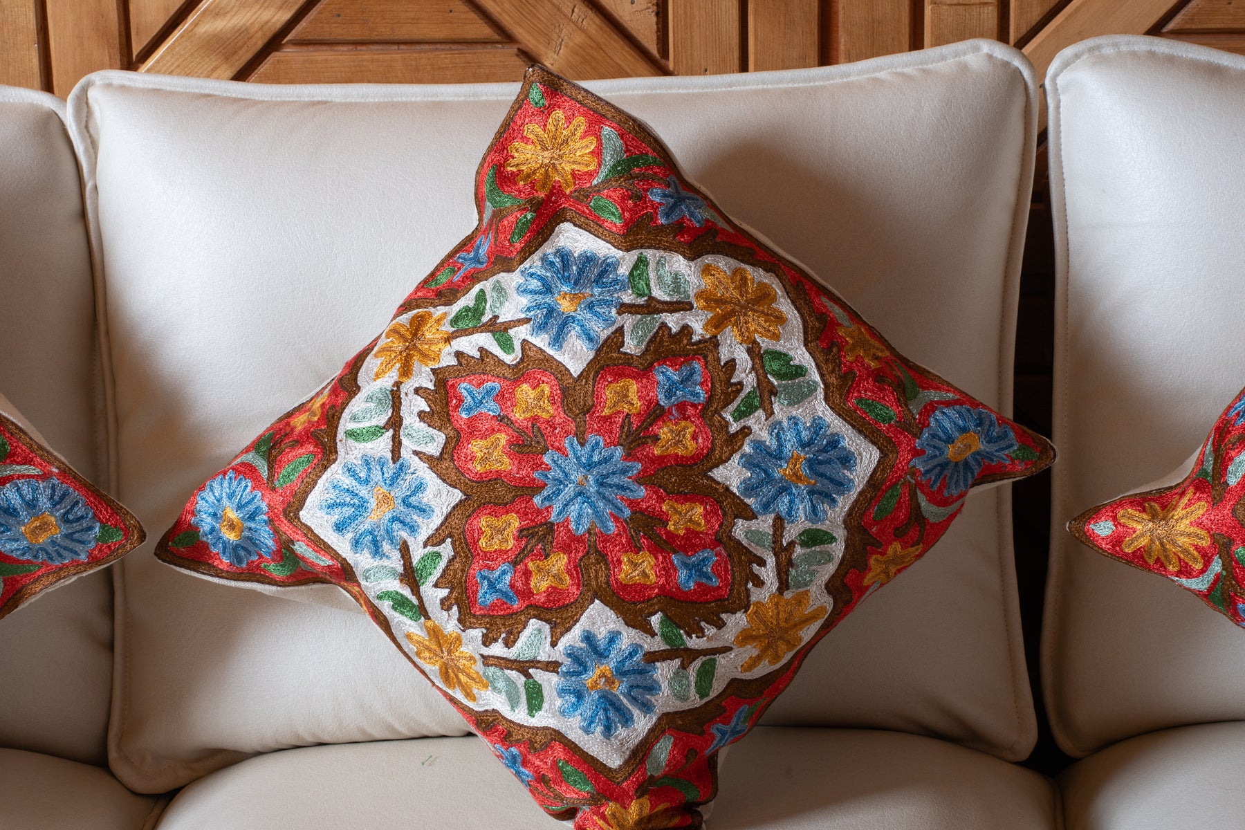 This pillow cover hand embroidered on cotton base features a vibrant red background adorned with bright blue blossoms and golden floral accents. The layered petals and leafy details create a lively yet balanced design that feels cheerful and inviting.