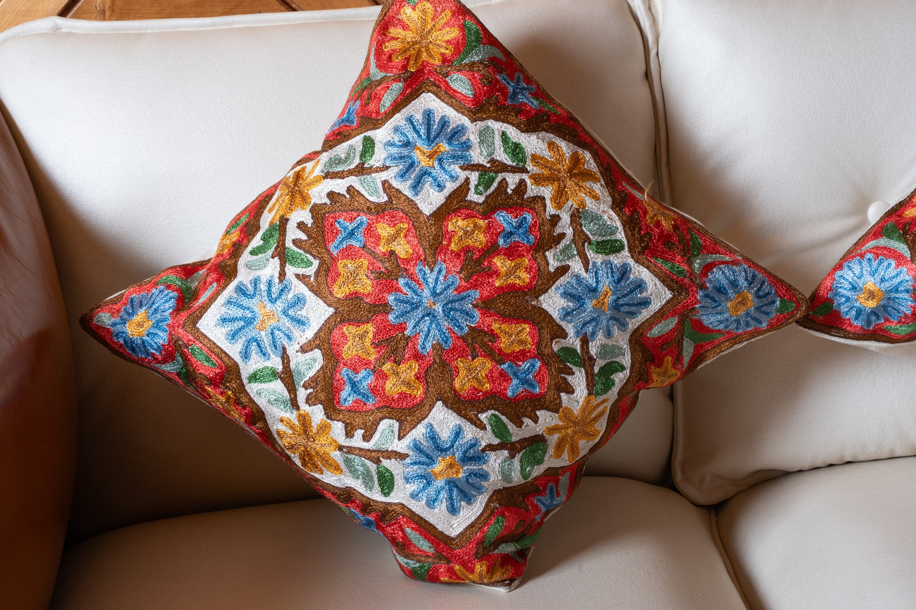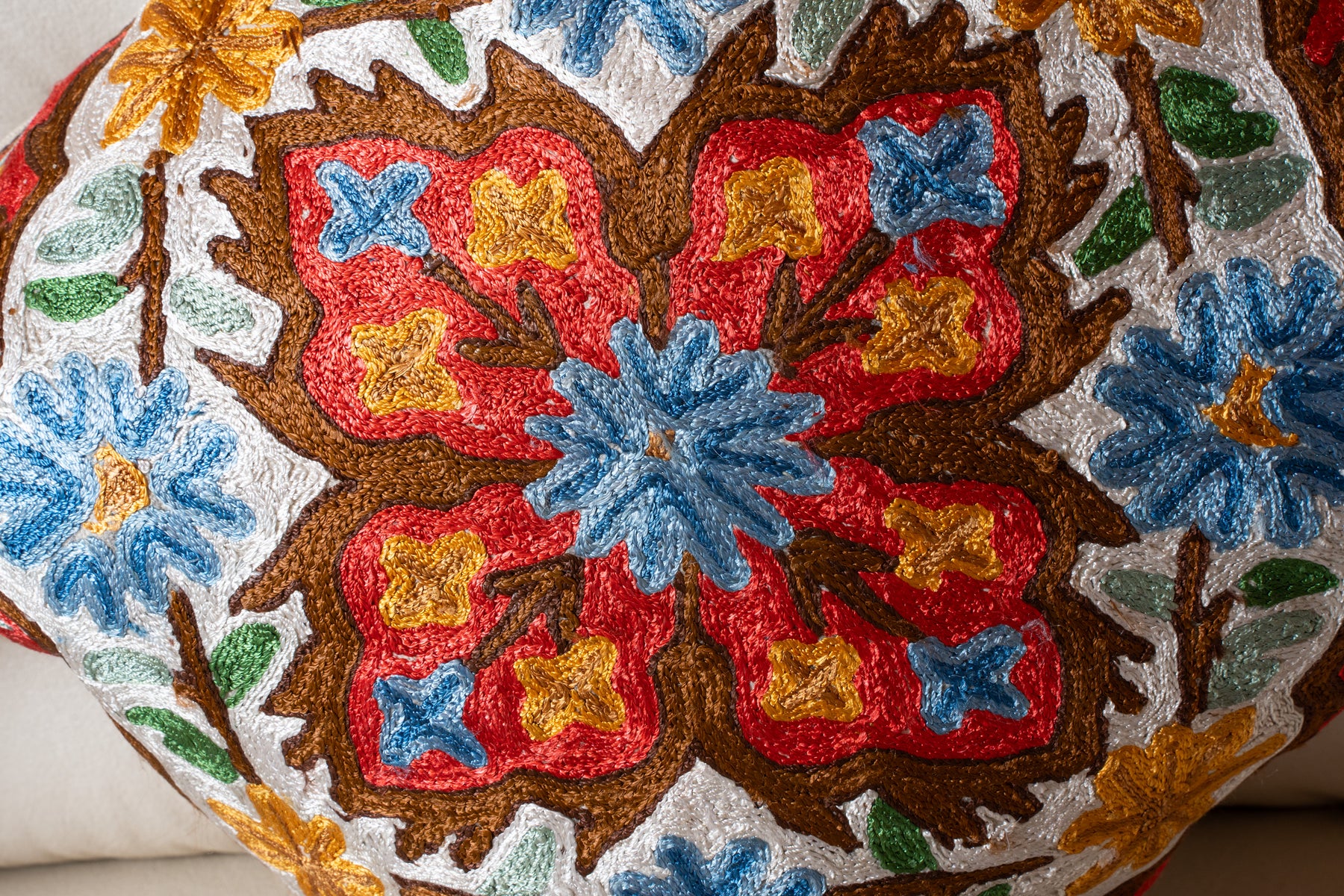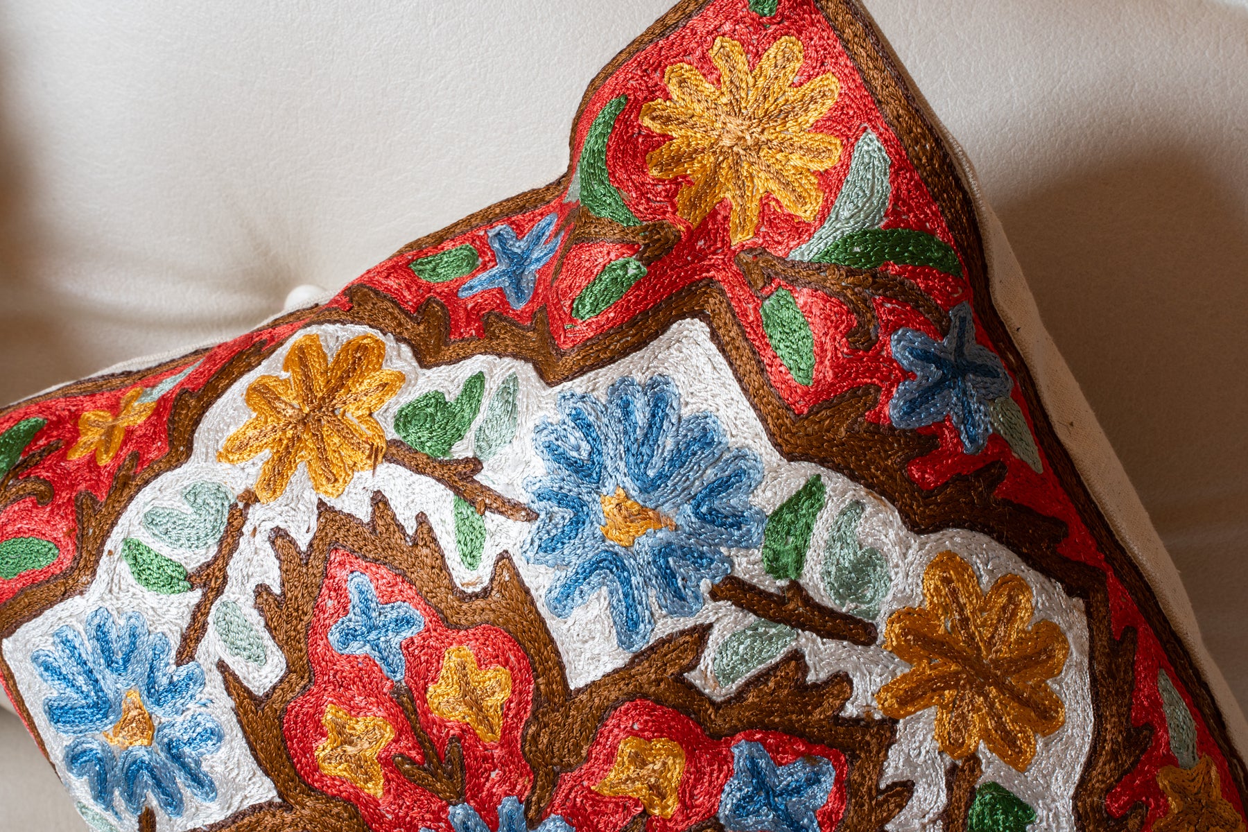 Crimson Meadow Bloom pillow cover hand embroidered 16x16 inches