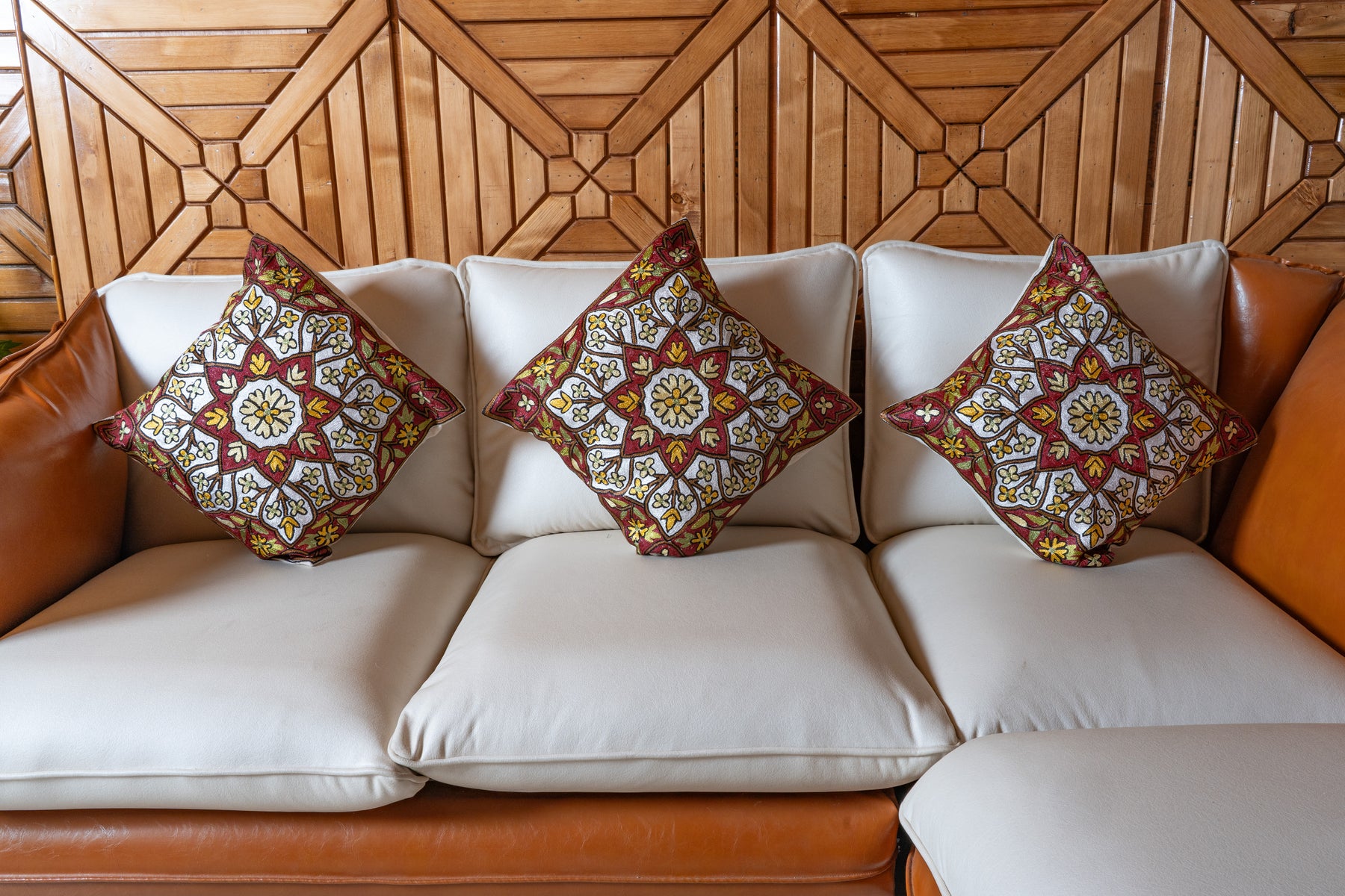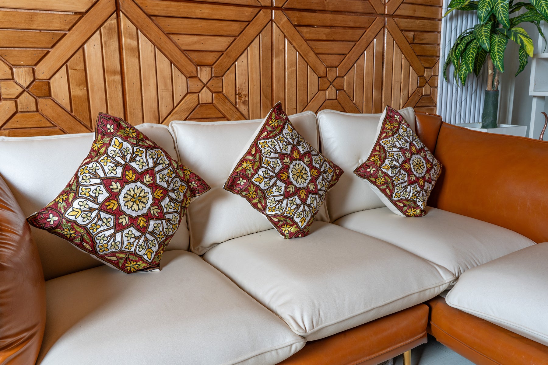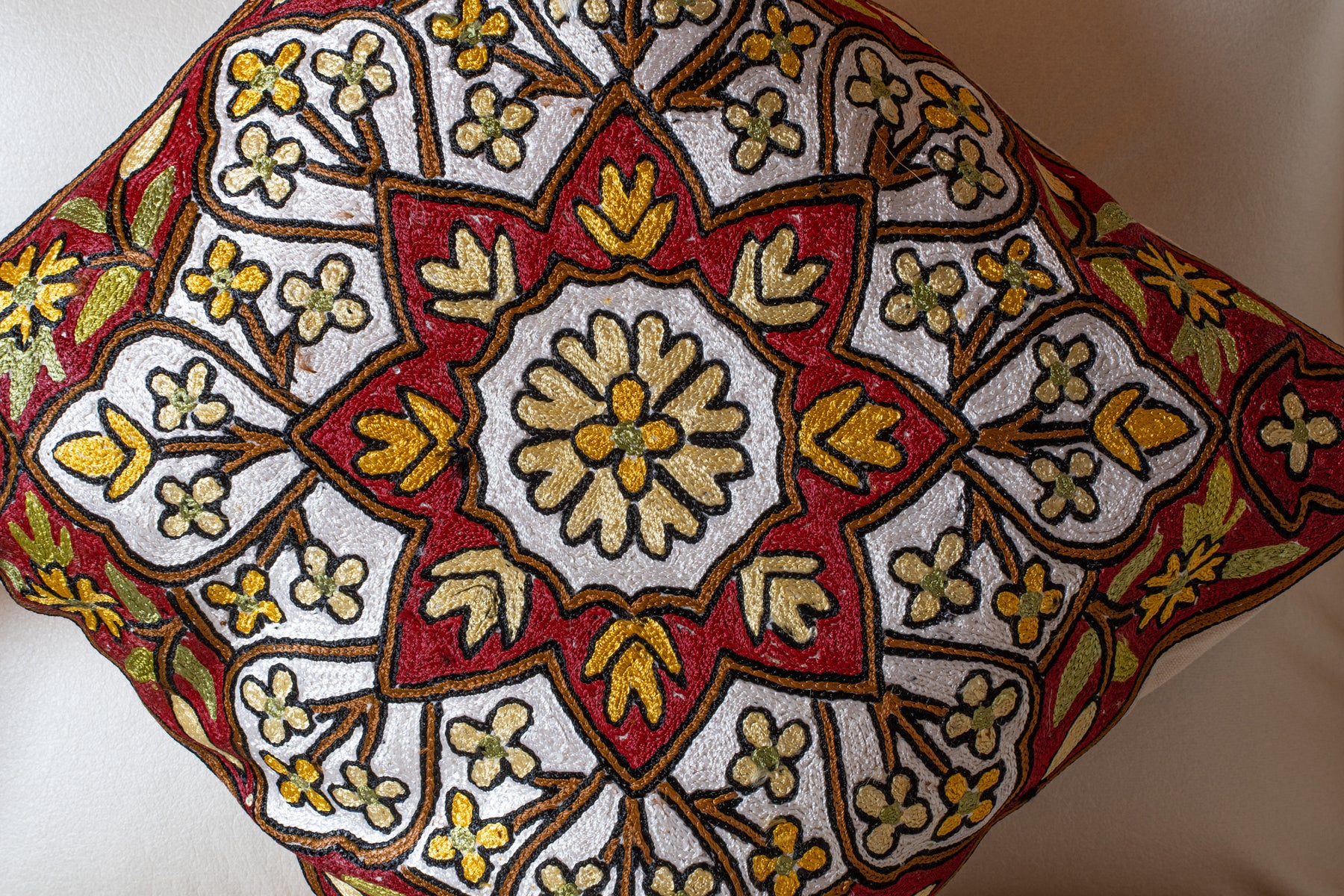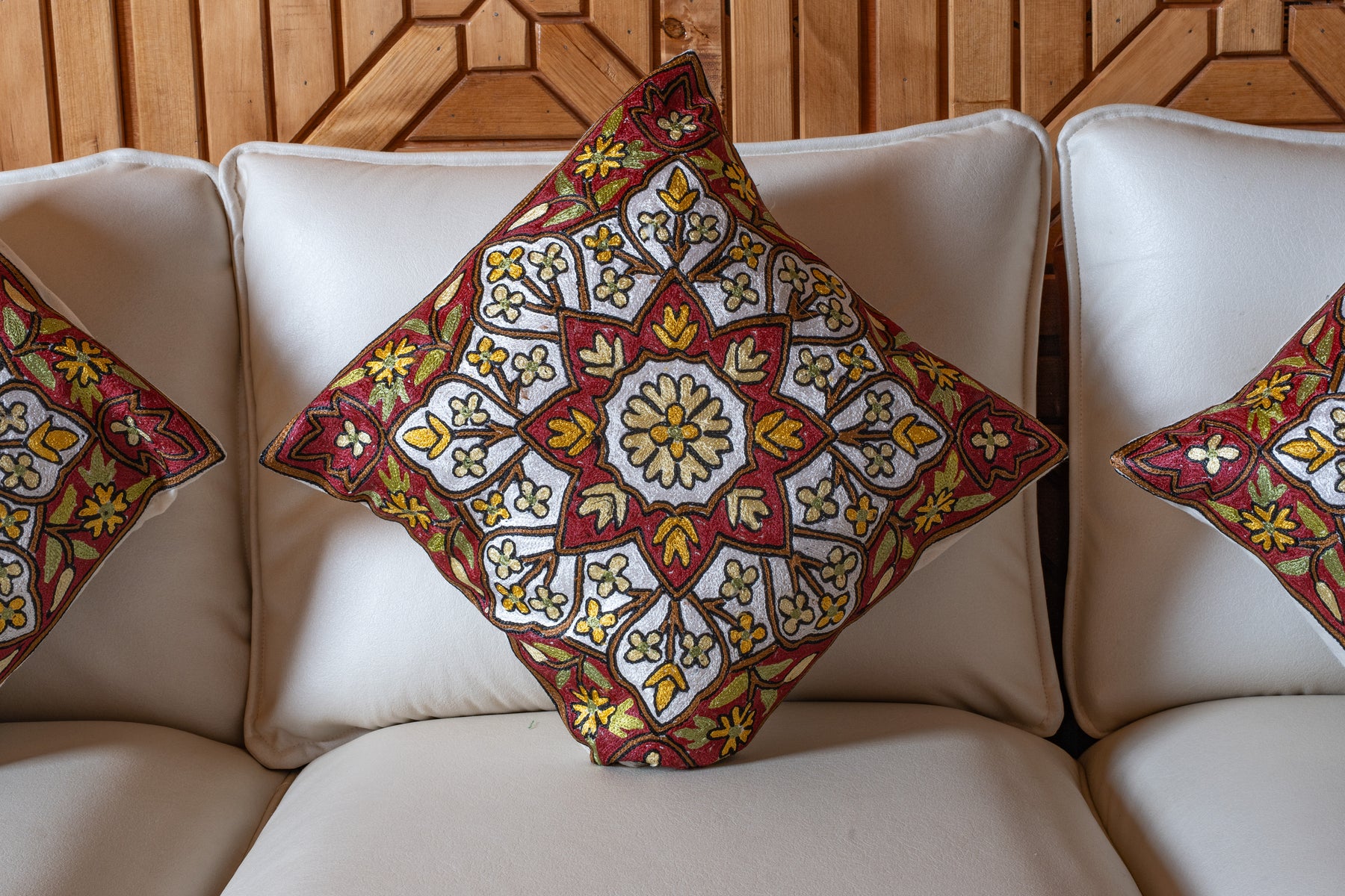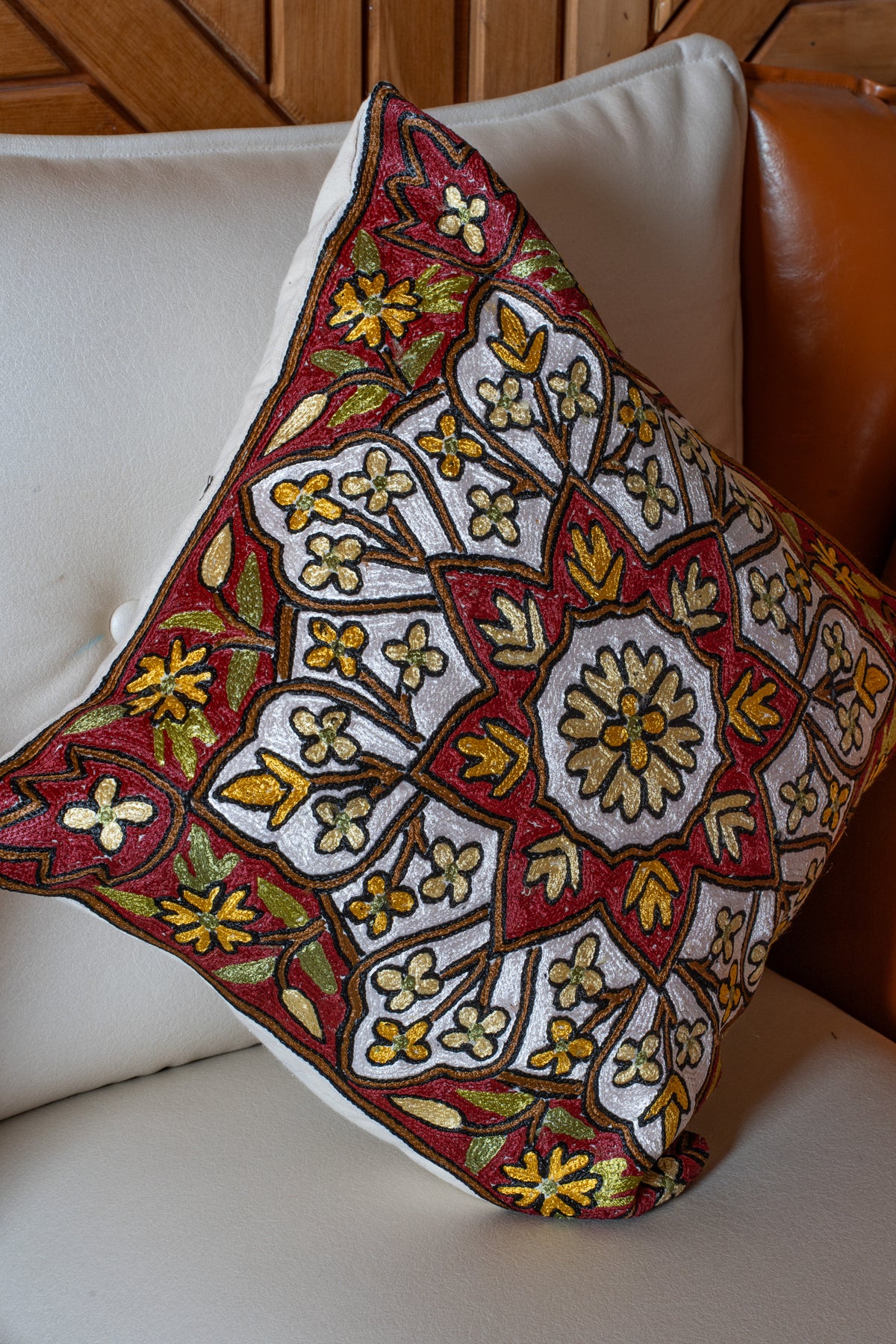 This pillow cover hand embroidered on cotton showcases an intricate medallion pattern in deep red, ivory, mustard, and soft green. The detailed floral motifs radiate outward from the center, forming a harmonious composition inspired by traditional artistry.