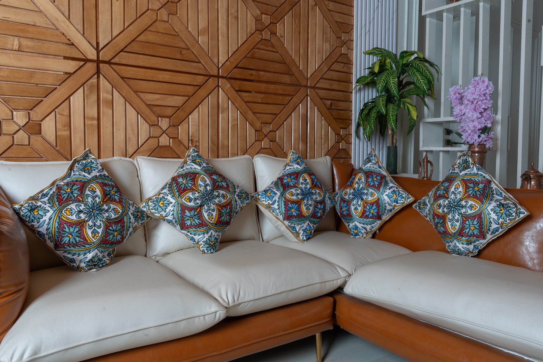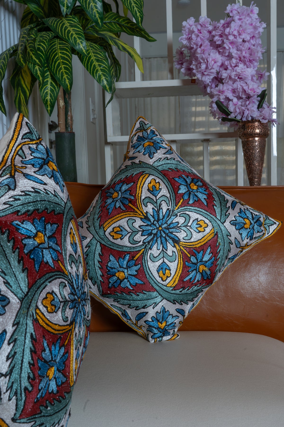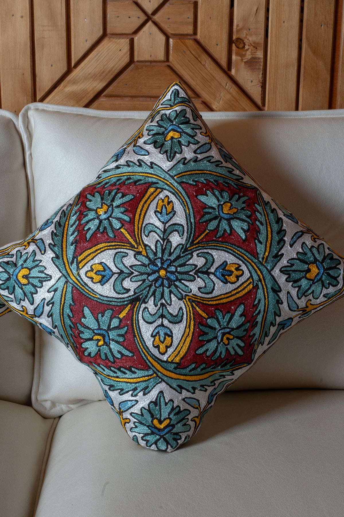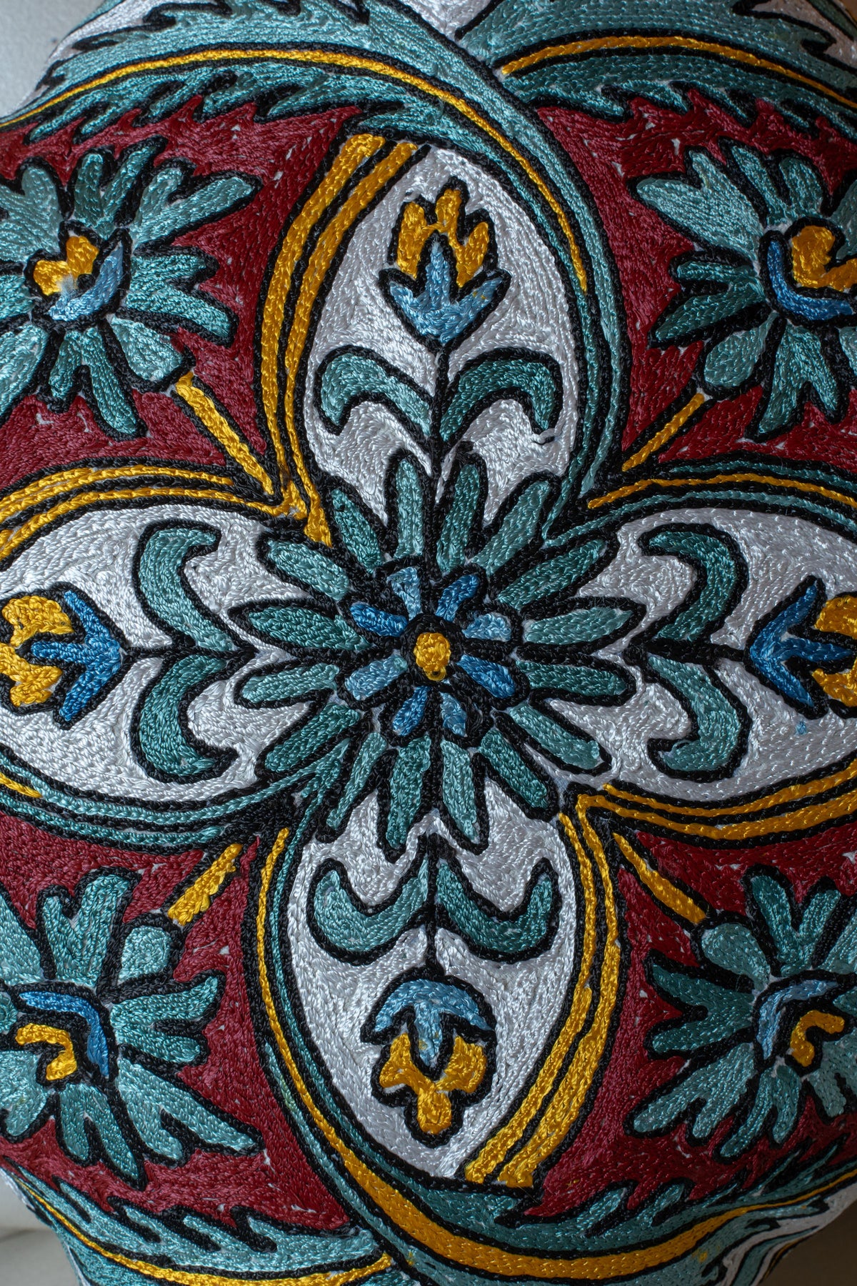 This pillow cover features a refined medallion motif hand embroidered on a soft cotton base. Shades of teal, burgundy, and ivory come together in a balanced composition that feels elegant yet visually striking.