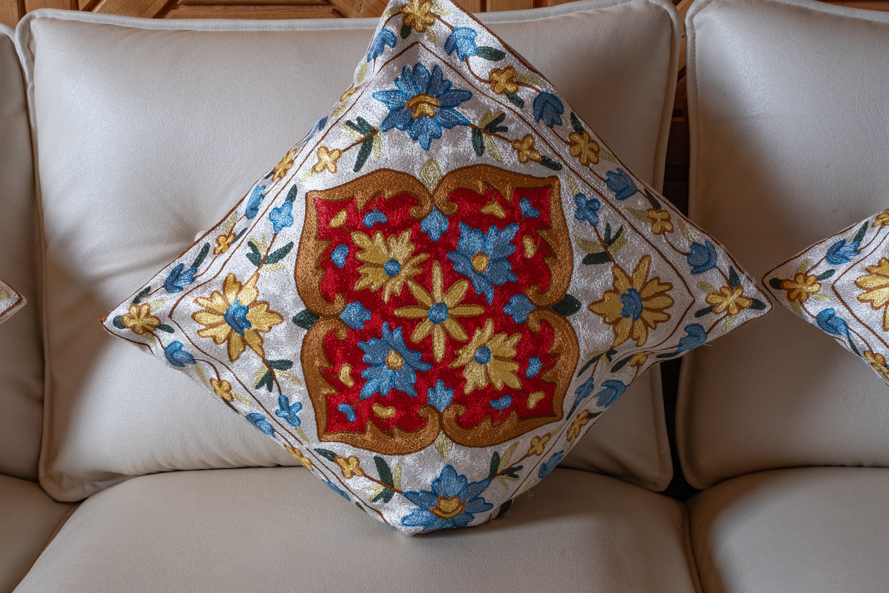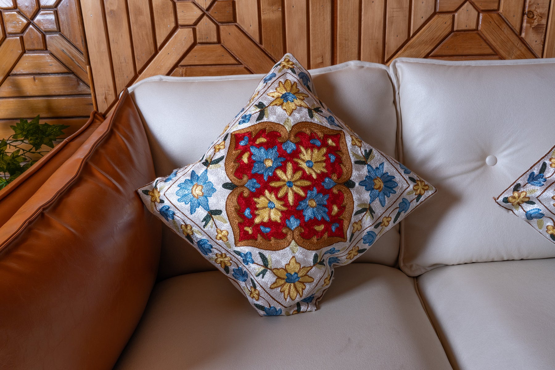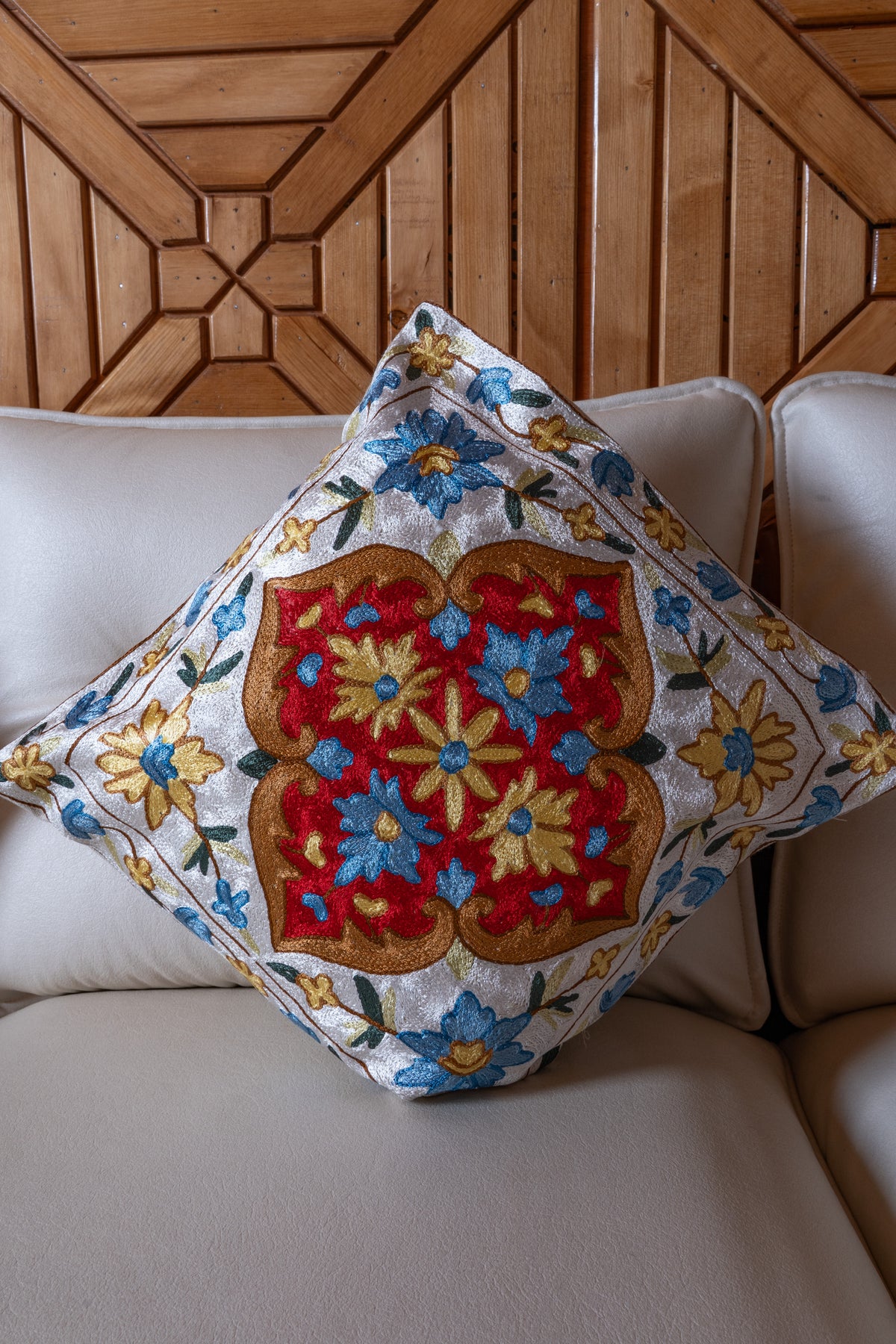 This pillow cover hand embroidered on cotton base features a striking scarlet center framed by warm golden borders and delicate blue and yellow florals. The symmetrical layout creates a bold focal point, while the surrounding floral vines soften the design with graceful movement and charm.
