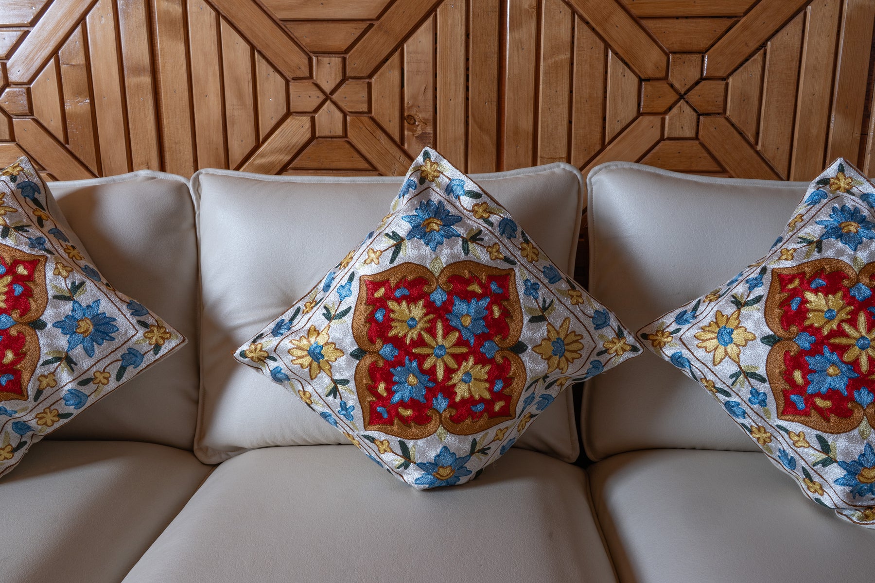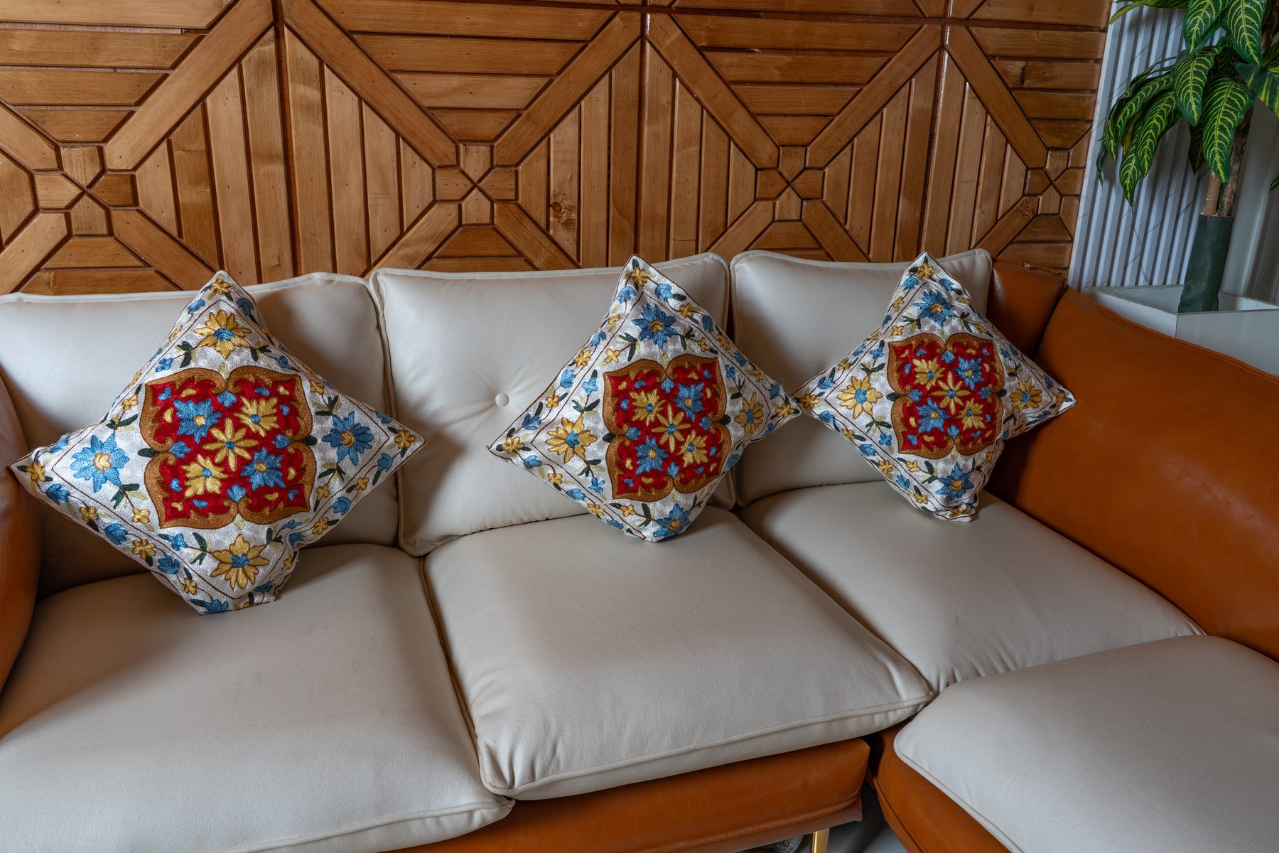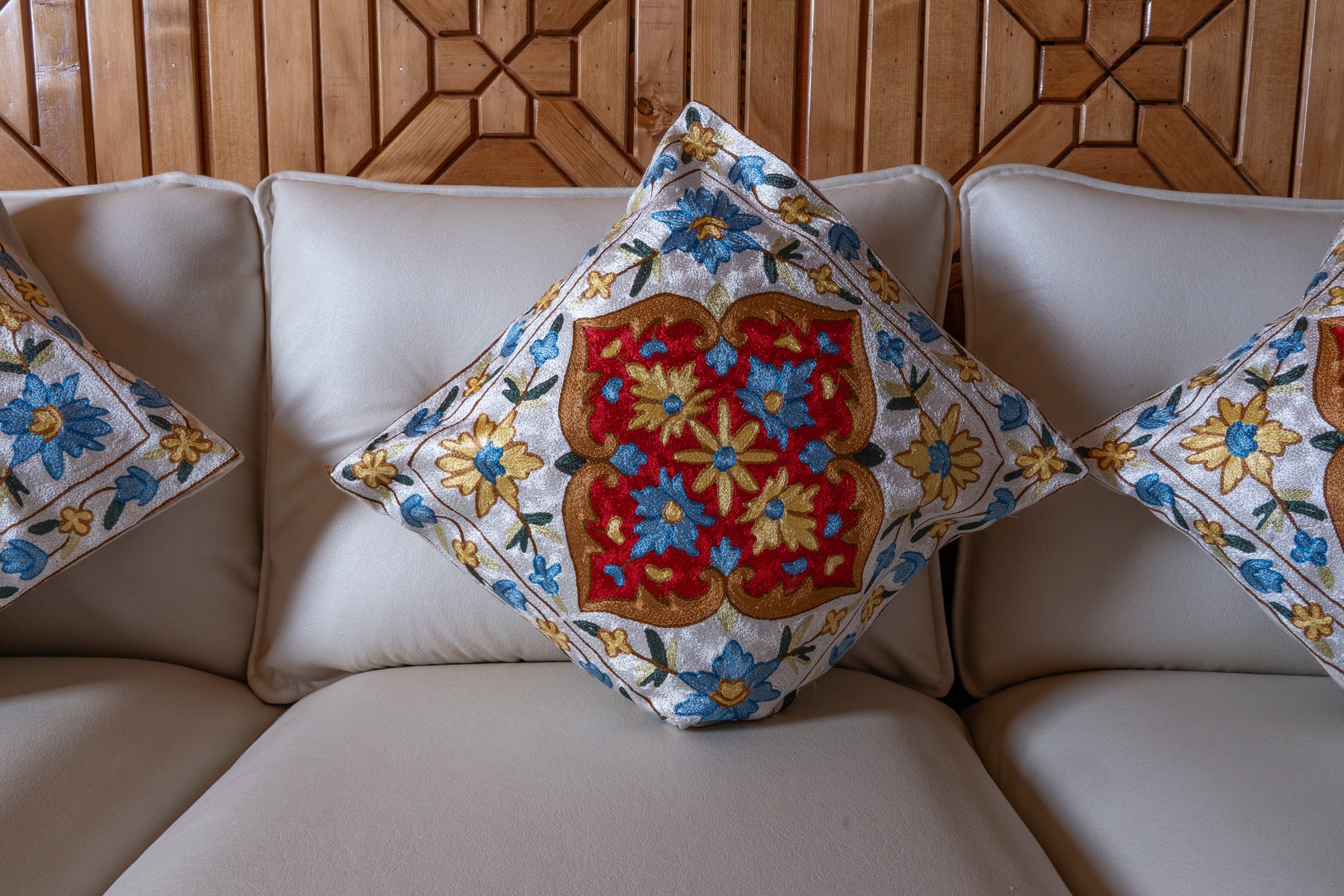 This pillow cover hand embroidered on cotton base features a striking scarlet center framed by warm golden borders and delicate blue and yellow florals. The symmetrical layout creates a bold focal point, while the surrounding floral vines soften the design with graceful movement and charm.