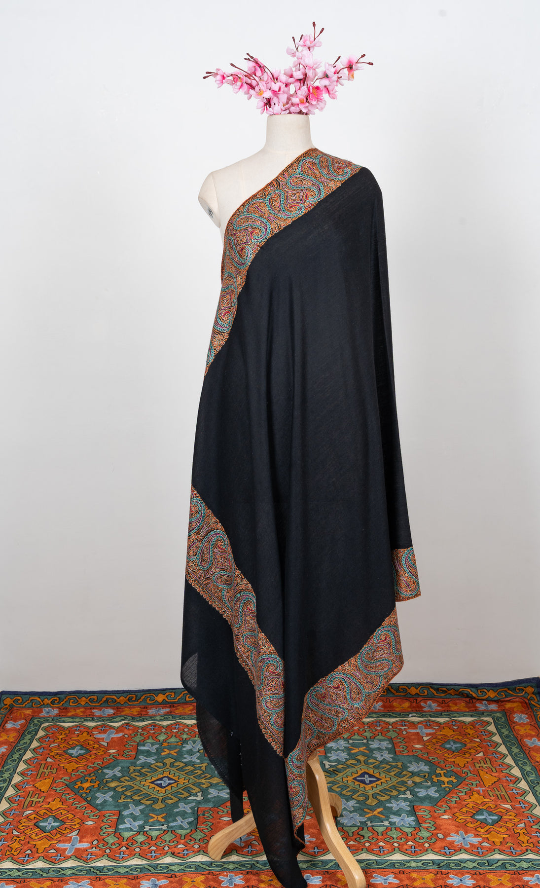 This 2.5 Yards Sozni Hand Embroidered Shawl is woven from fine merino wool and showcases a deep midnight black base framed with vibrant multitone Sozni paisley embroidery. The richly detailed borders introduce warmth and movement, creating a bold yet balanced expression of Kashmiri heritage.
