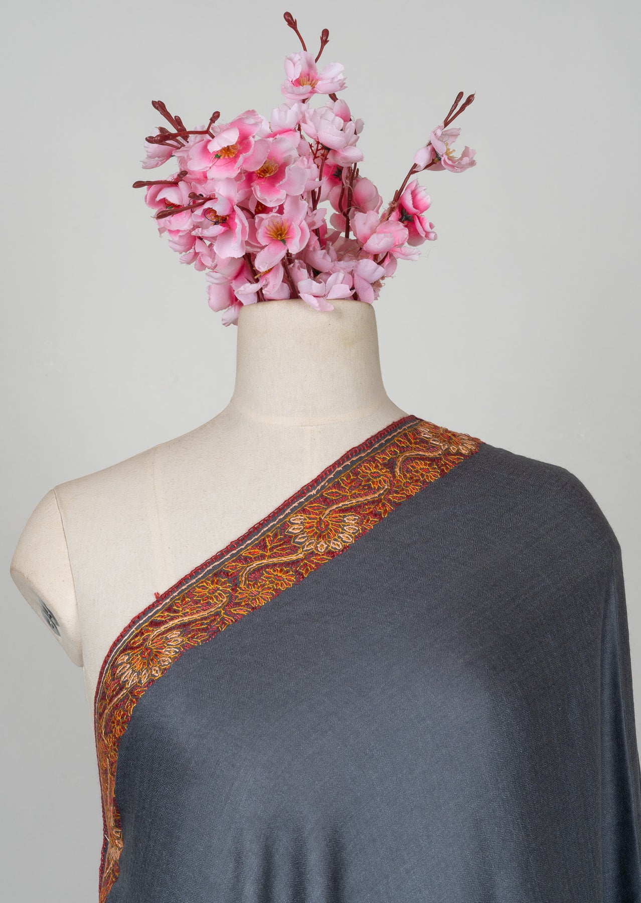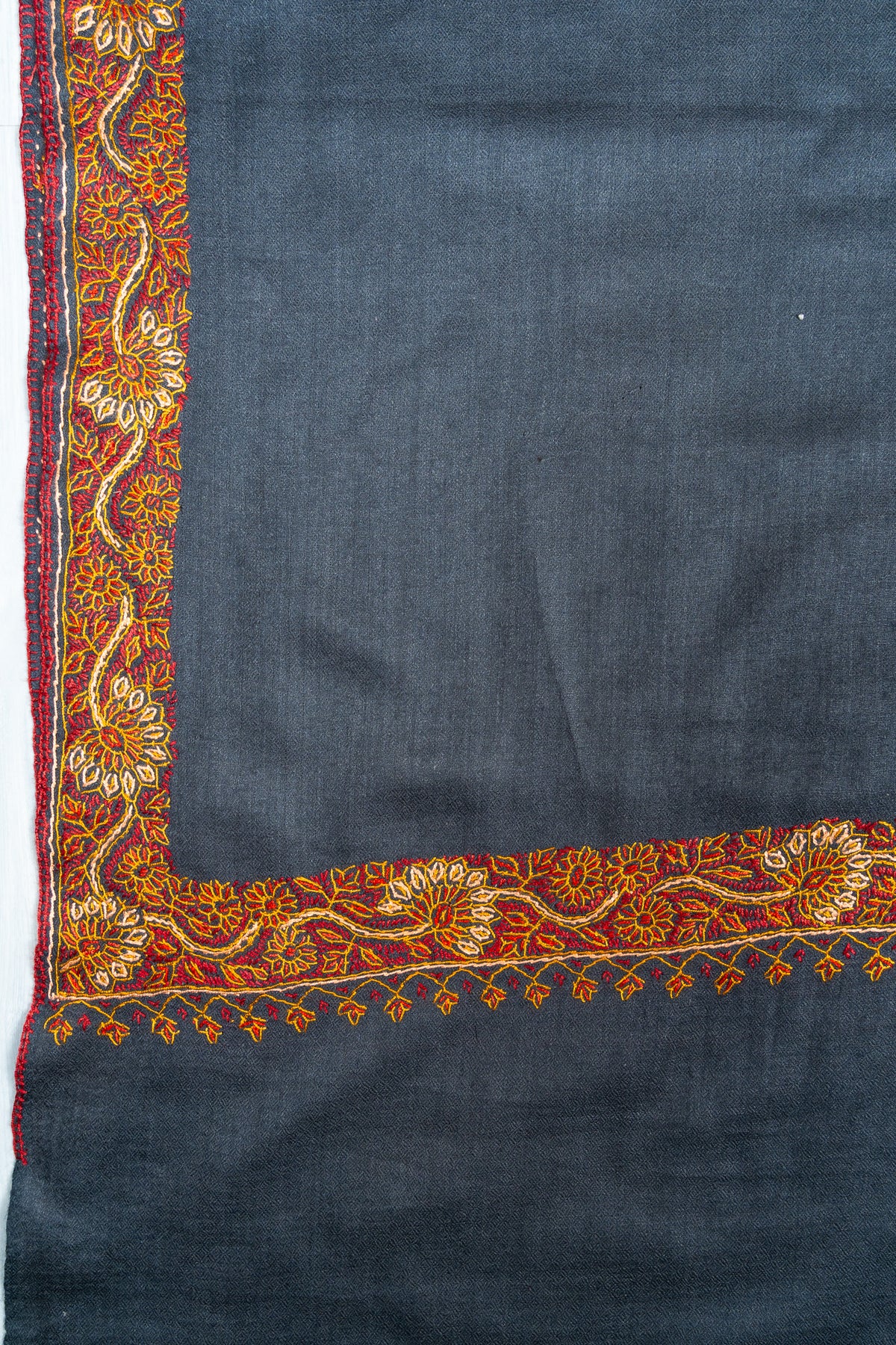 This 2.5 yards Sozni Hand Embroidered Shawl features a rich deep teal base framed with vibrant red, mustard, and ivory floral border embroidery. The intricate edging creates a striking contrast against the solid body, giving the shawl a bold yet elegant presence.