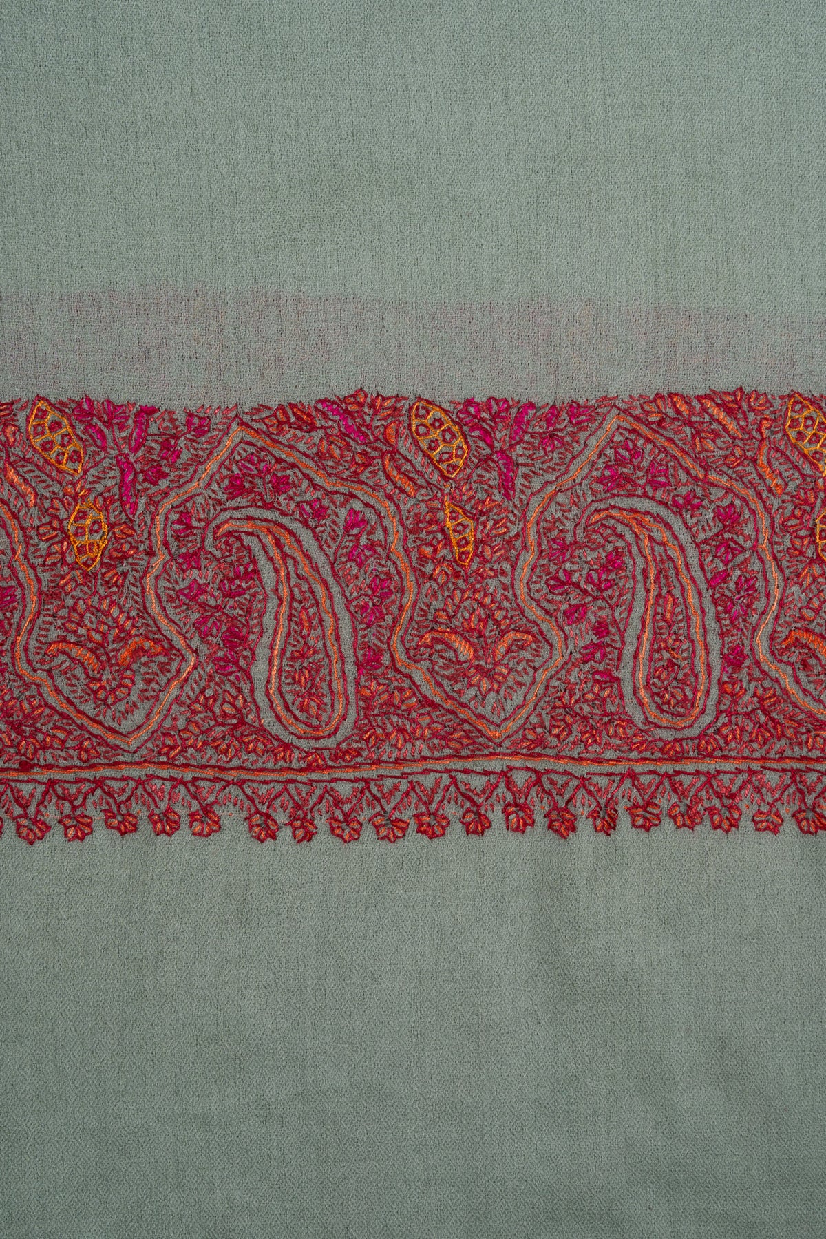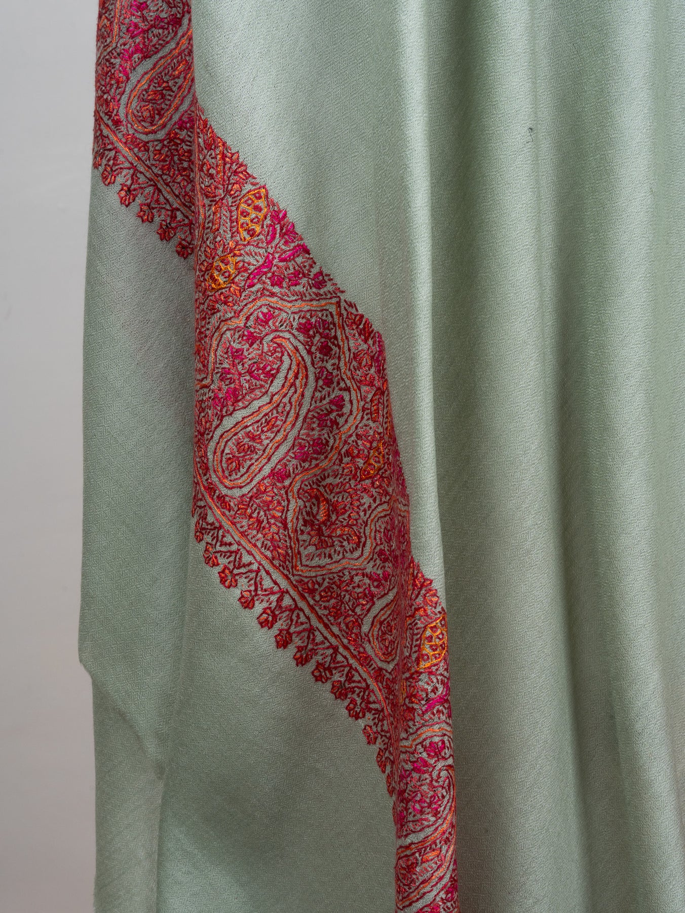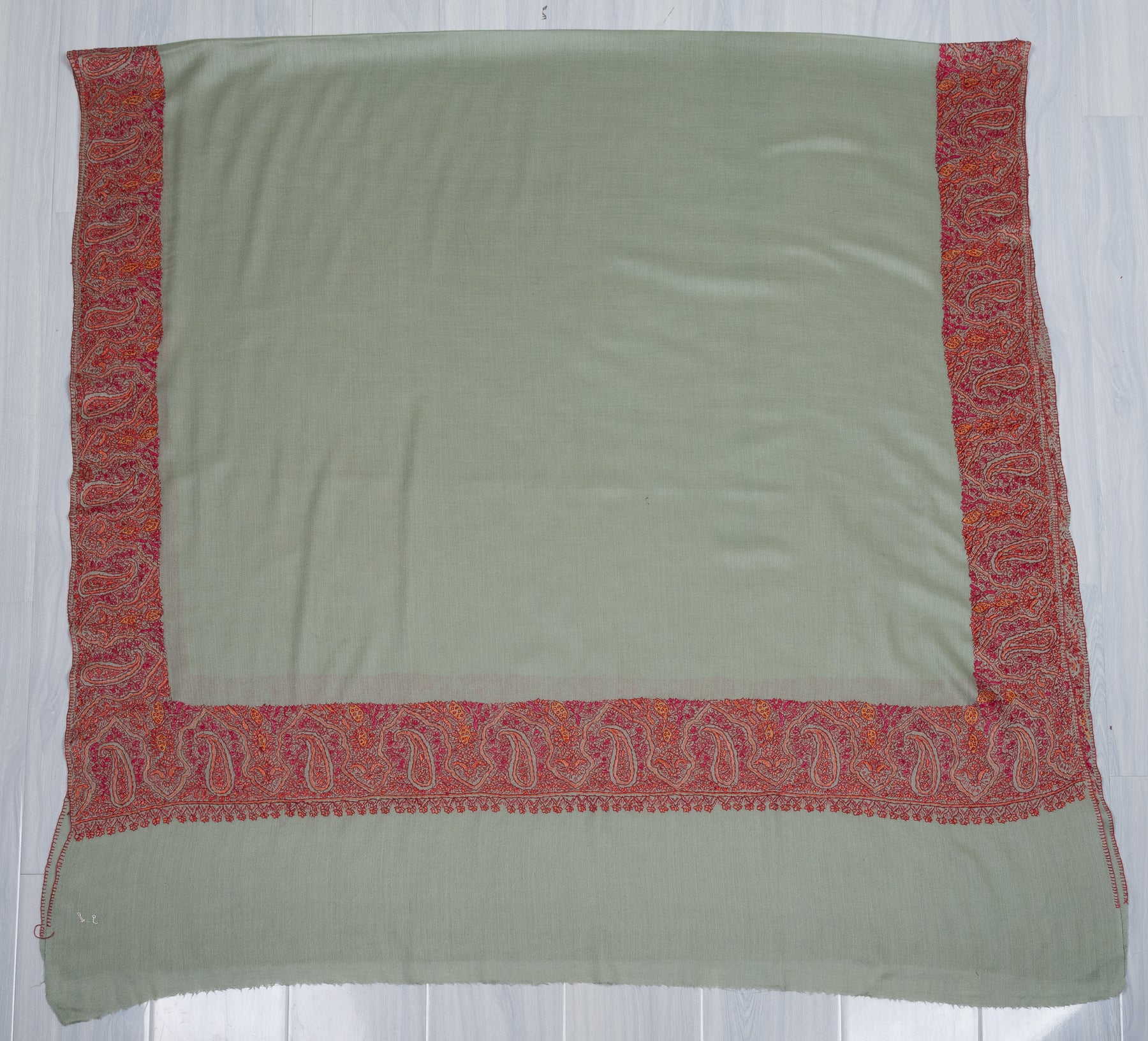 2.5 Yards Sozni Hand Embroidered Shawl in Sage Green with Maroon Paisley Border