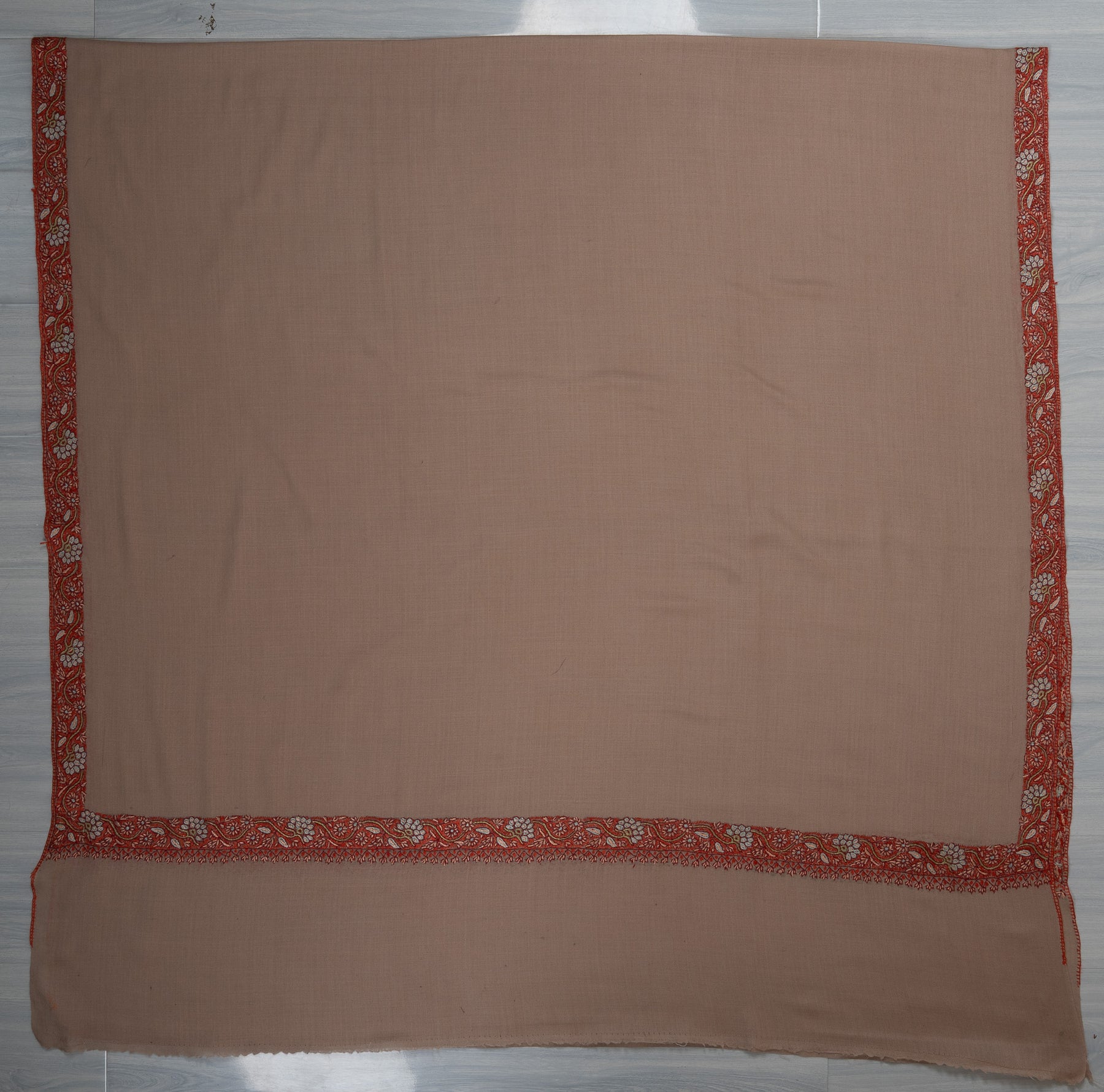 Subtle yet striking, the Almond Blush shawl radiates warmth through its soft nude undertone adorned with a delicately detailed Sozni border. The graceful red embroidery brings a vibrant charm to its gentle hue, embodying a perfect harmony of minimalism and tradition.