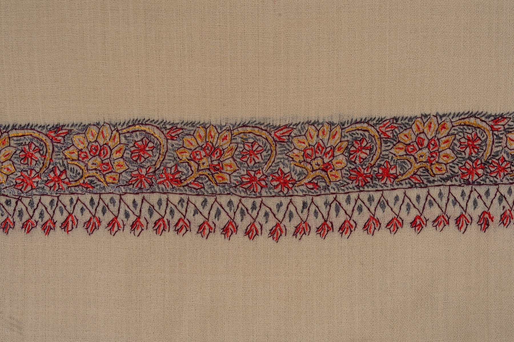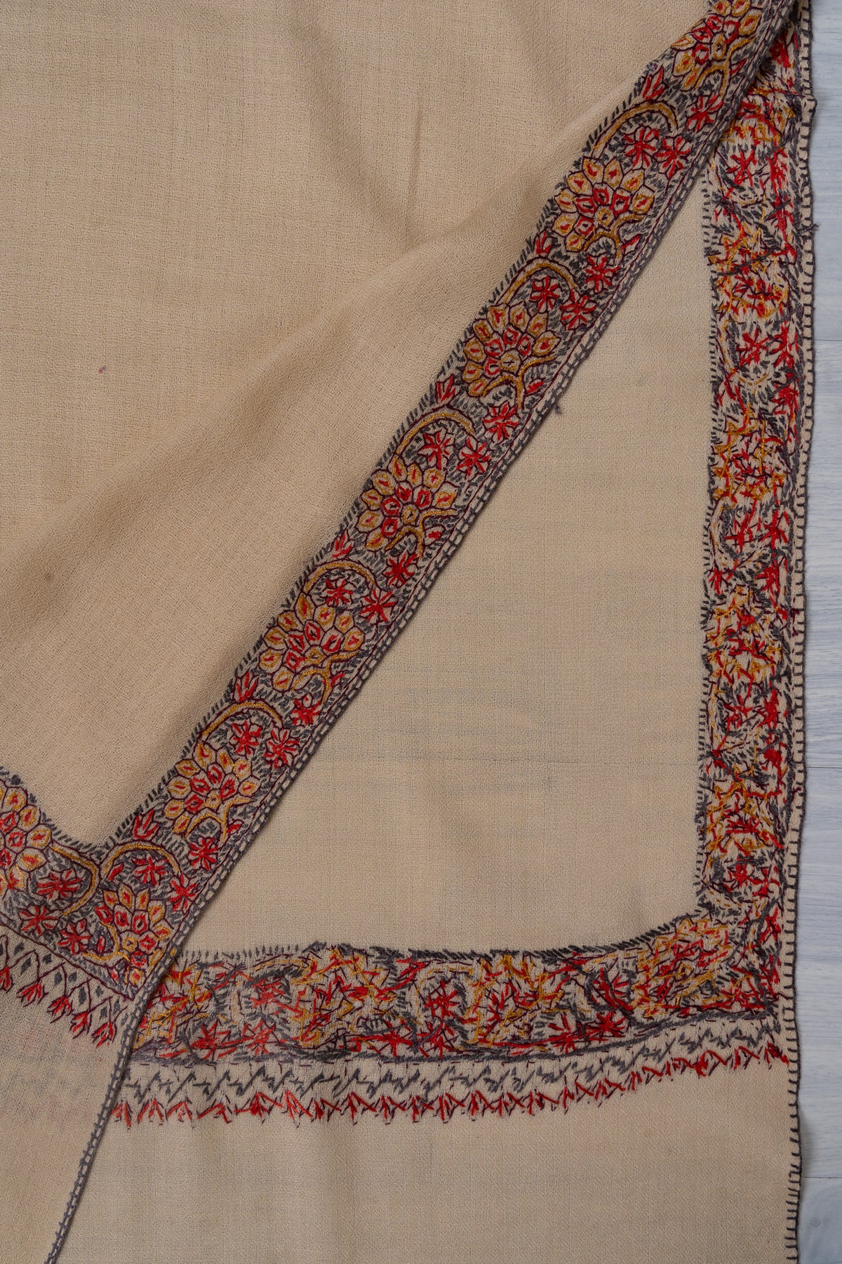 Golden Dusk captures the subtle glow of twilight in its rich beige tone and intricate Sozni borders in shades of red and gold. Its minimalist design highlights the mastery of Kashmiri craftsmanship, offering understated opulence.