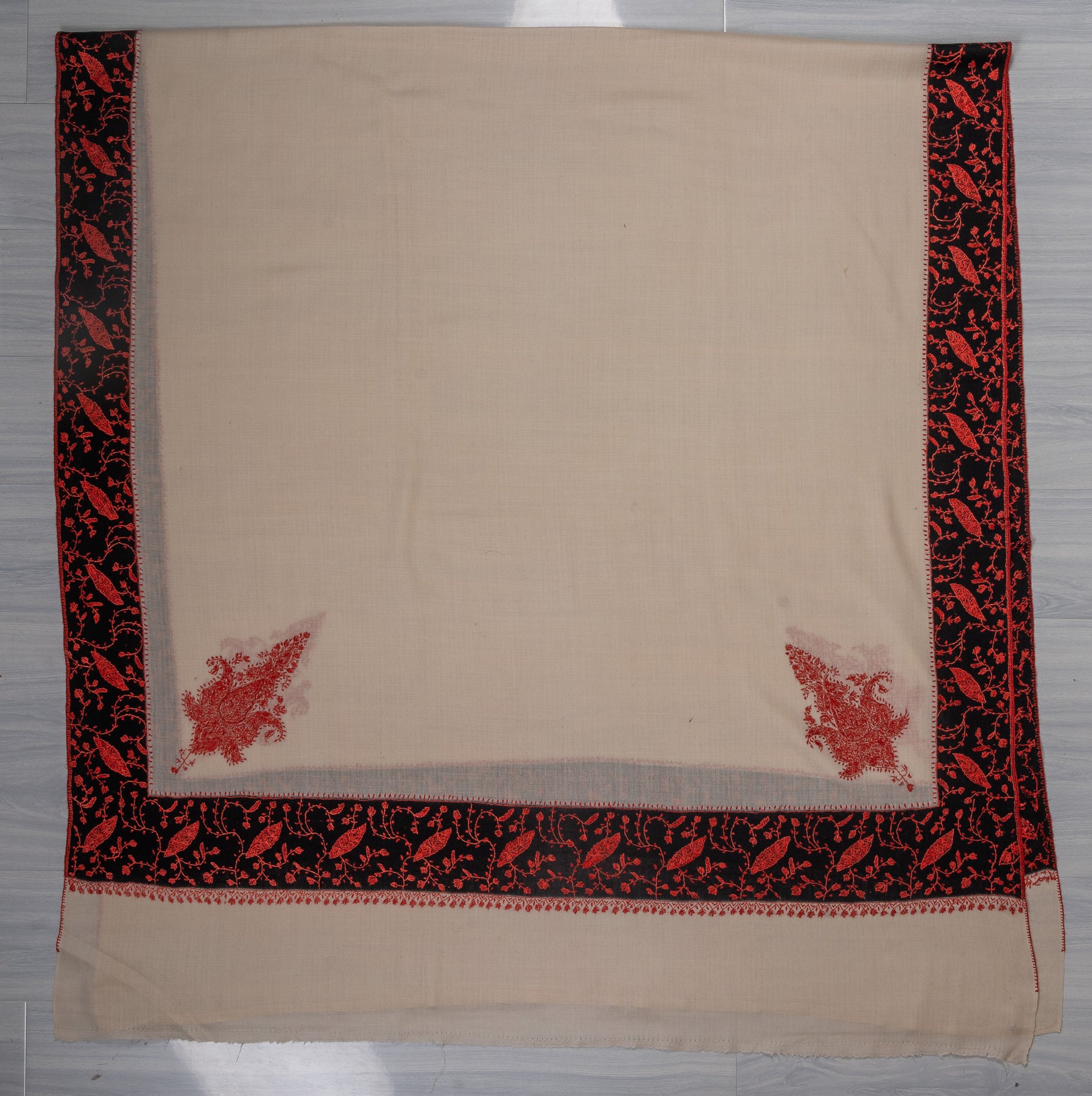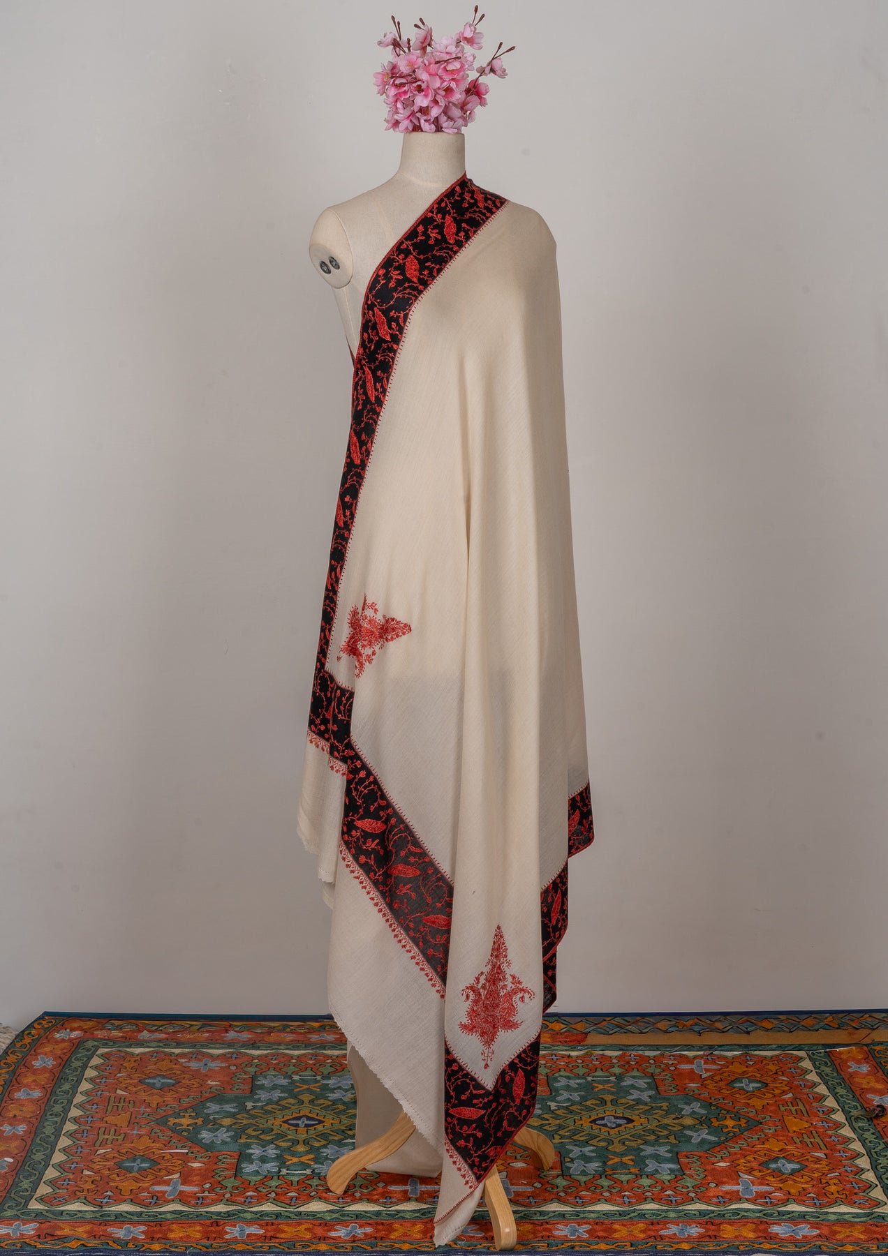 A masterpiece of contrast, the Ivory Flame shawl radiates warmth through its soft cream canvas enriched with bold red-and-black Sozni embroidery. The dramatic border and delicately placed paisley motifs evoke classic Kashmiri artistry reimagined for modern grace.