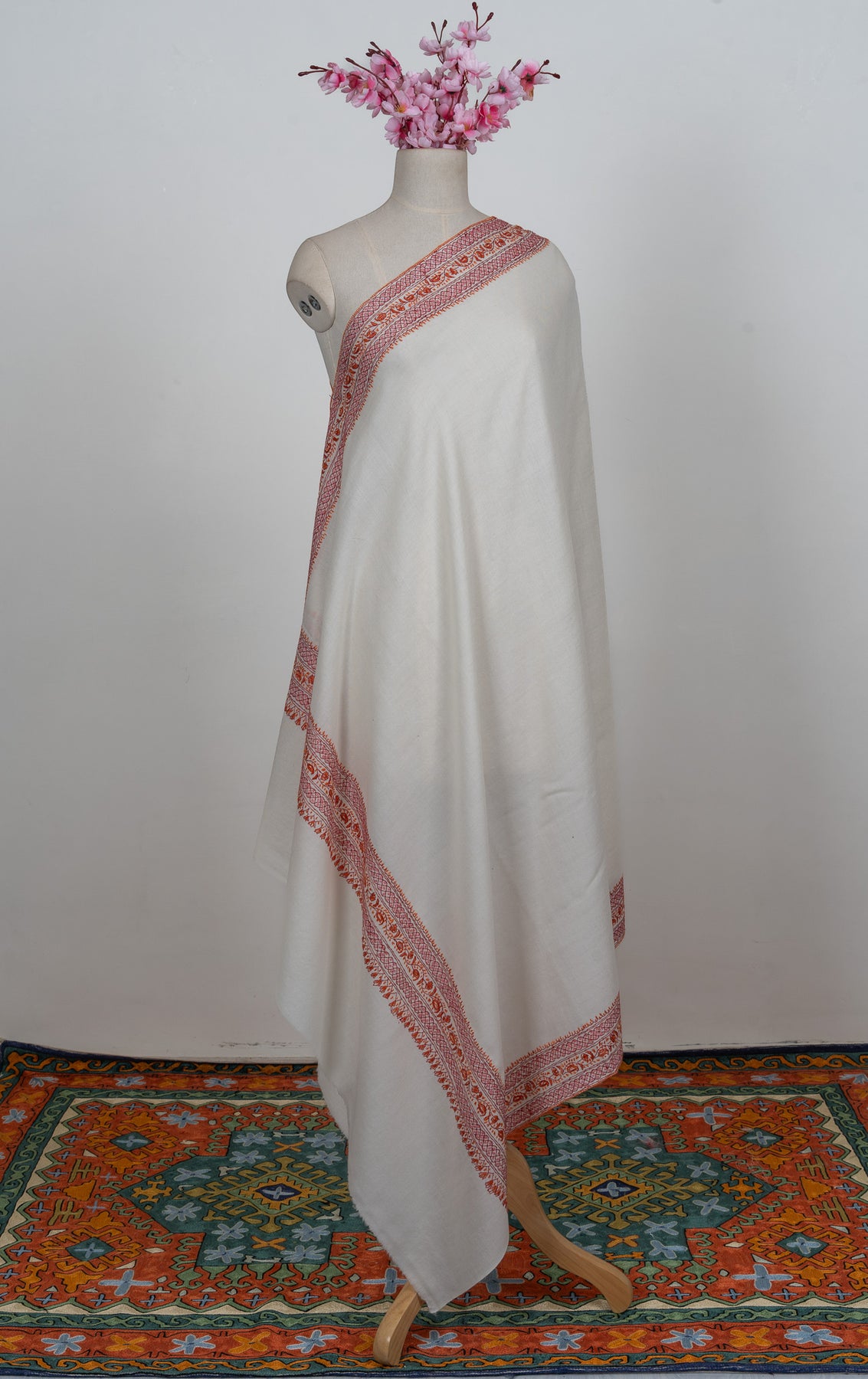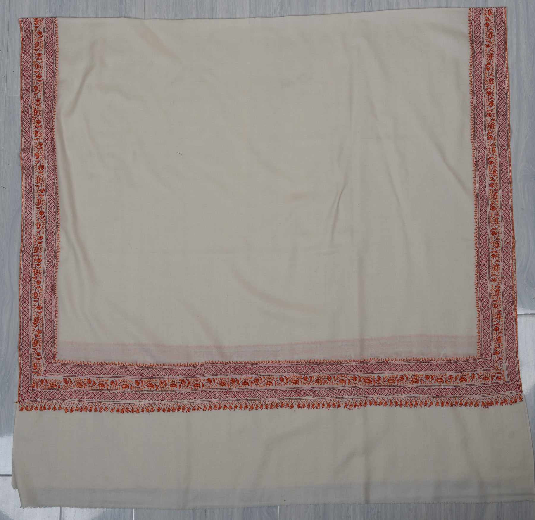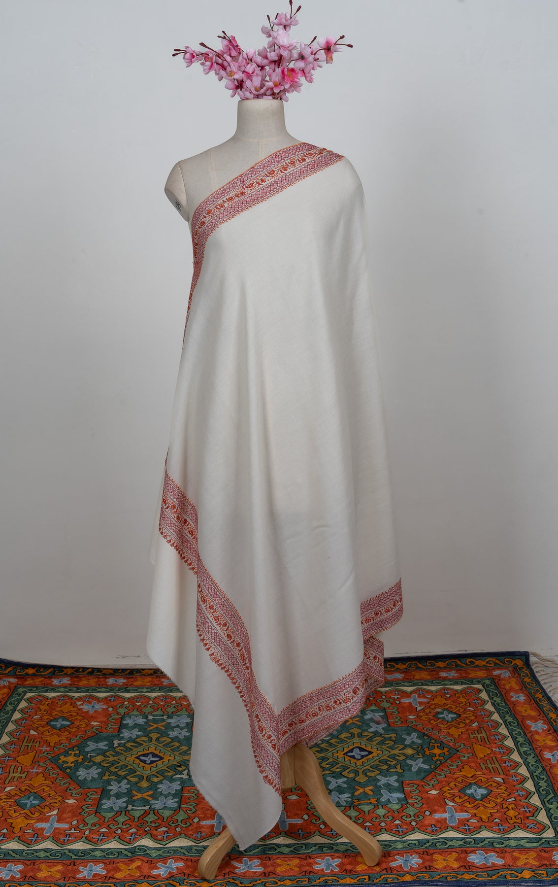 Understated and classic, this Sozni Hand Embroidered Merino Wool Shawl features a clean ivory canvas framed by richly detailed rust-toned embroidered borders. The restrained placement of embroidery lends the shawl a heritage-inspired elegance rooted in Kashmiri craftsmanship.