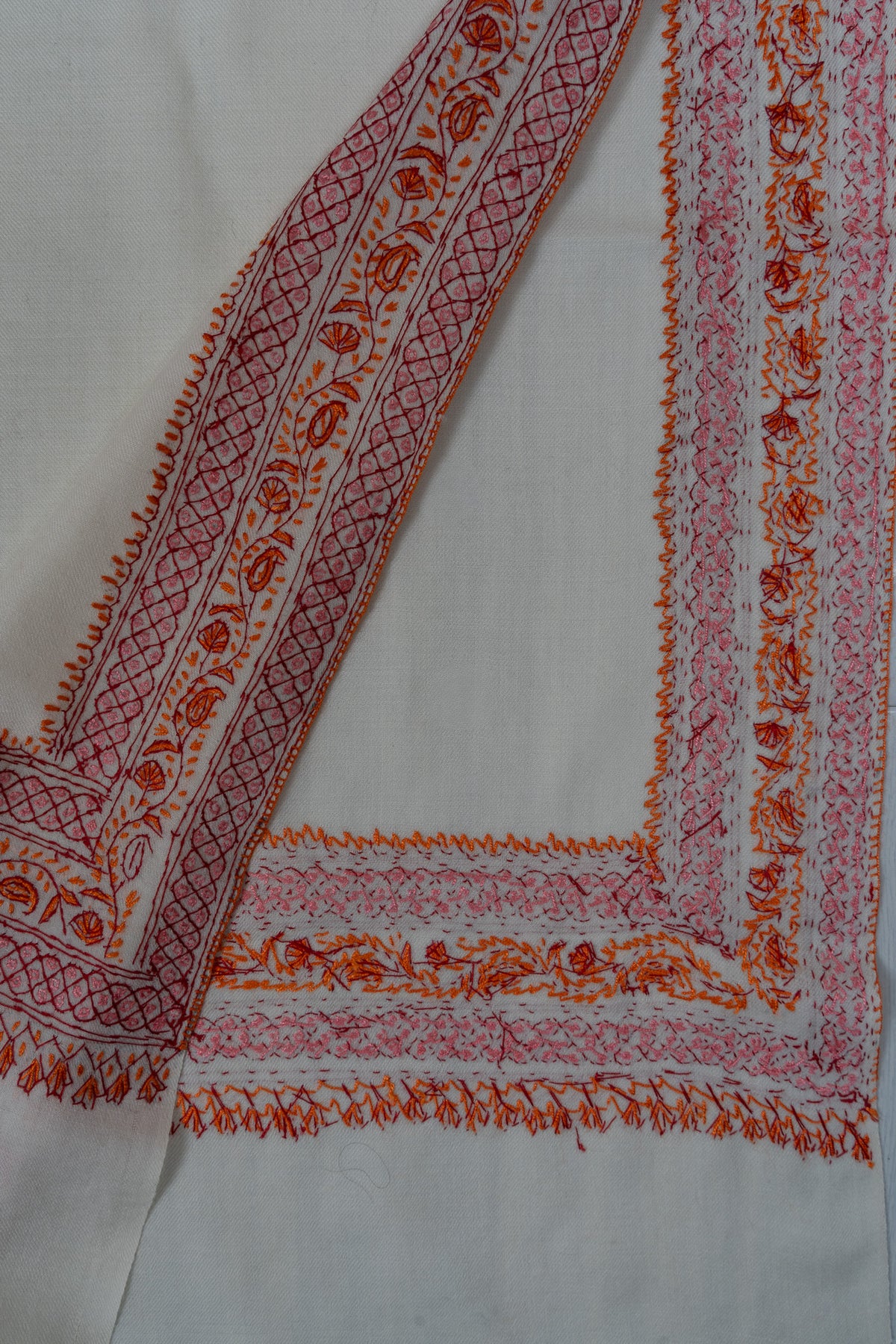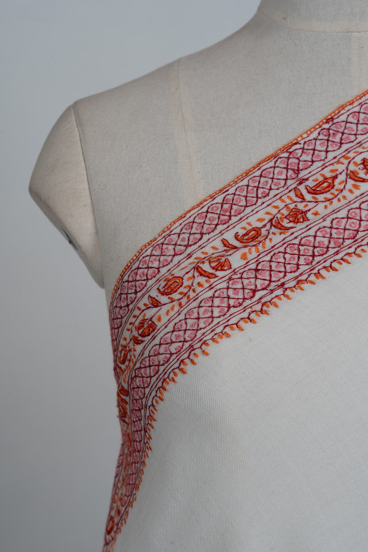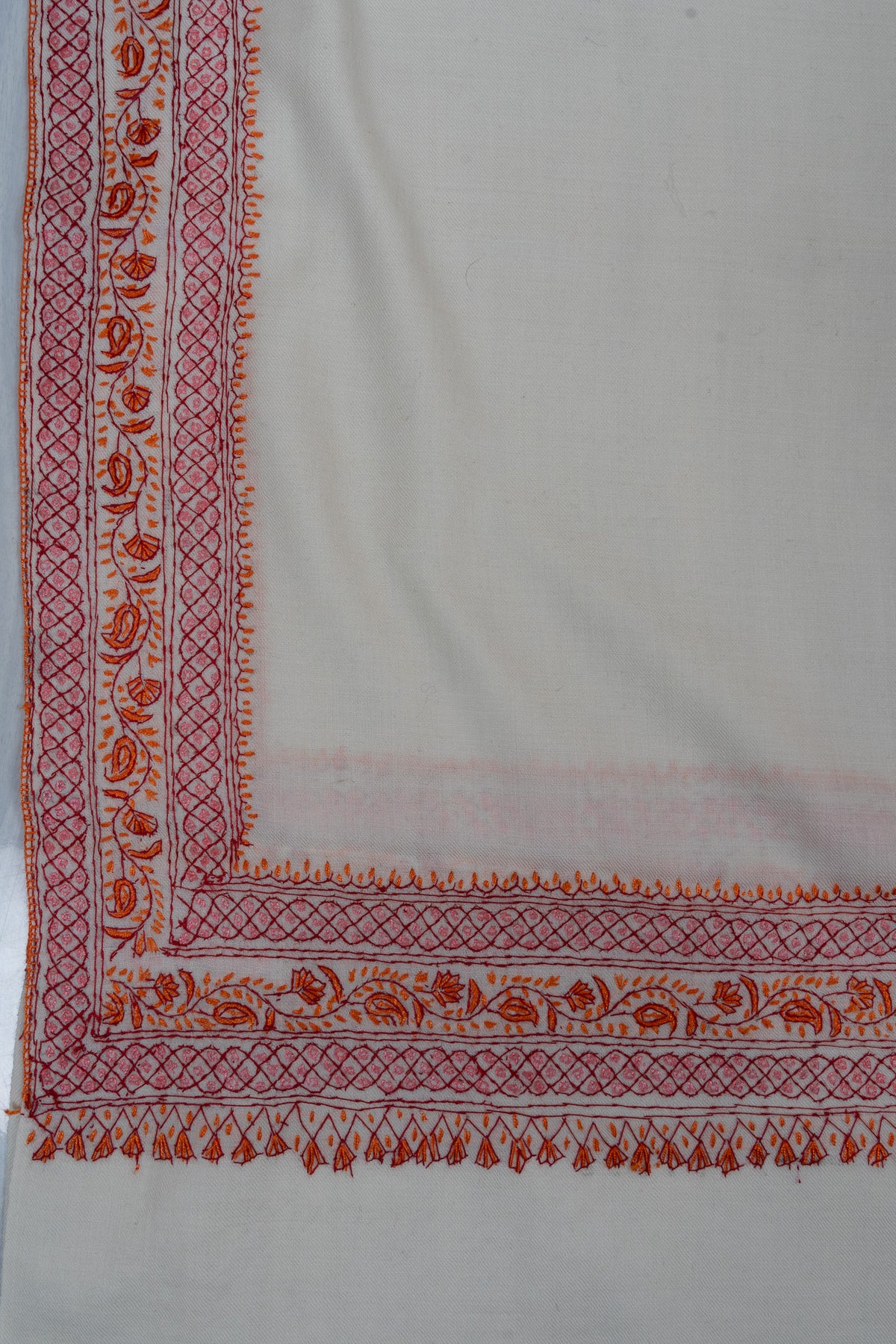 Understated and classic, this Sozni Hand Embroidered Merino Wool Shawl features a clean ivory canvas framed by richly detailed rust-toned embroidered borders. The restrained placement of embroidery lends the shawl a heritage-inspired elegance rooted in Kashmiri craftsmanship.