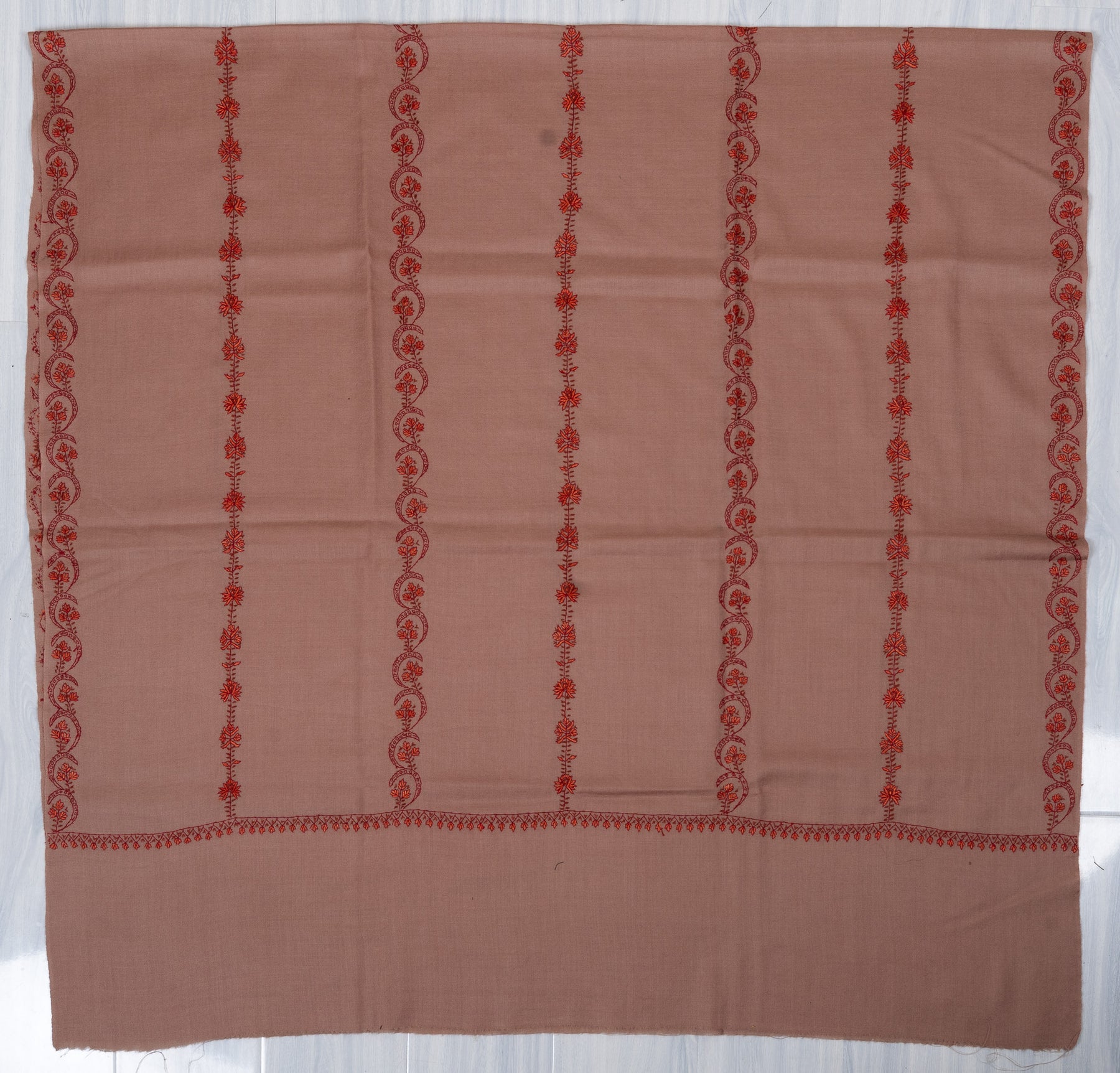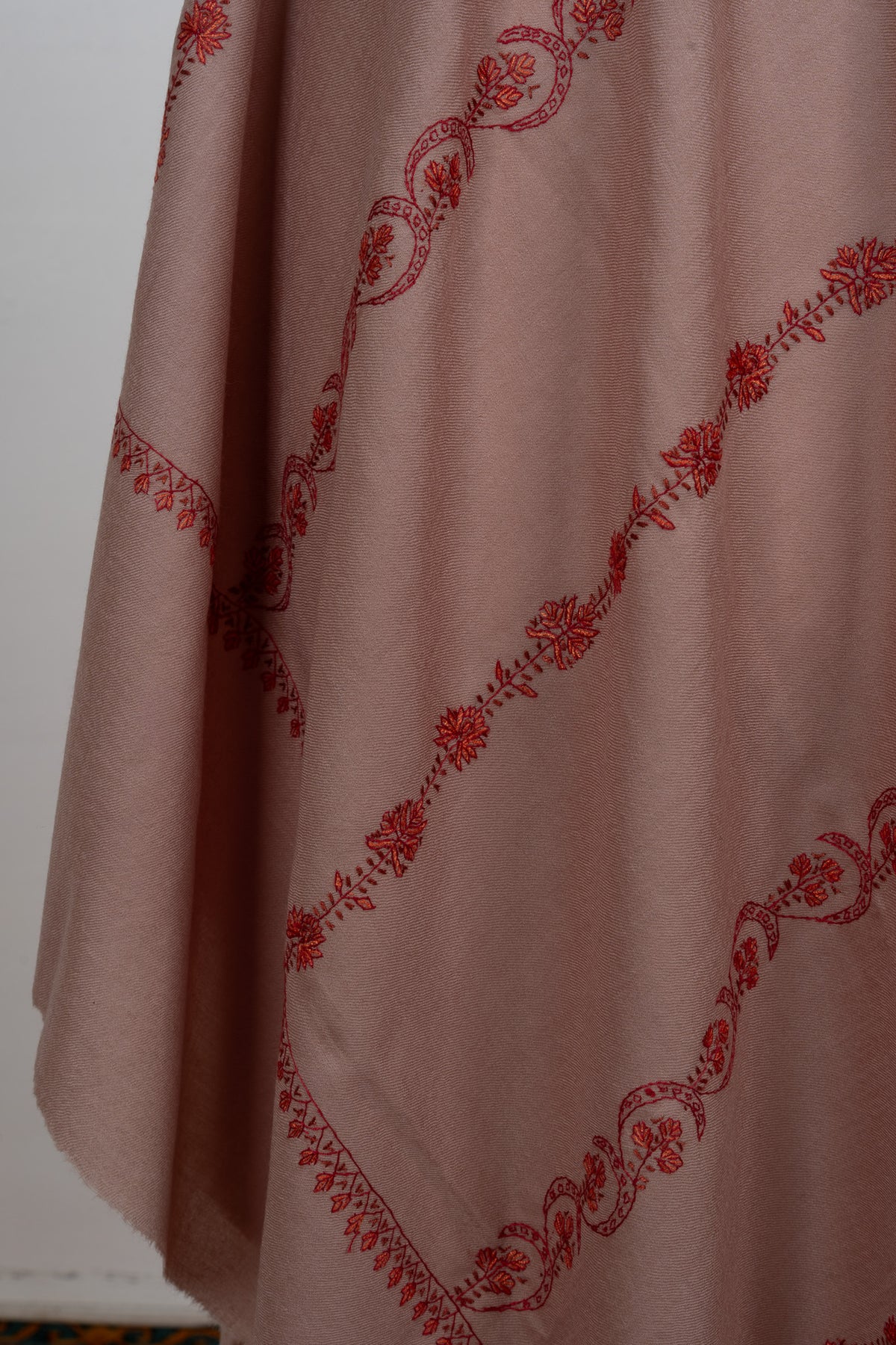 This Sozni Hand Embroidered Merino Wool Shawl is rendered in a warm blush-clay hue, enhanced with delicate diagonal embroidery in deeper contrasting tones. The gentle color palette and flowing pattern create a calm yet sophisticated aesthetic that feels both modern and rooted in heritage.