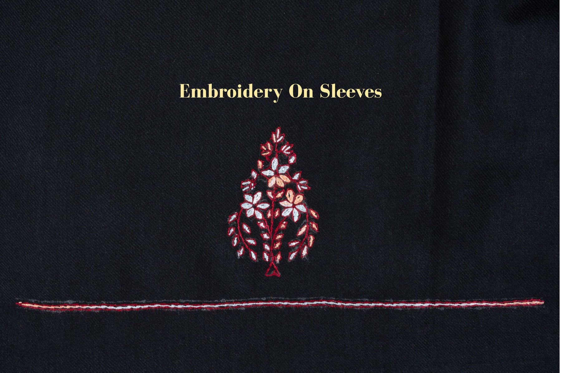 A timeless creation in jet black, this wool blend suit is adorned with intricate Sozni hand embroidery in hues of crimson and ivory. The detailed floral motifs exude regal elegance, while the refined neckline enhances its traditional allure.