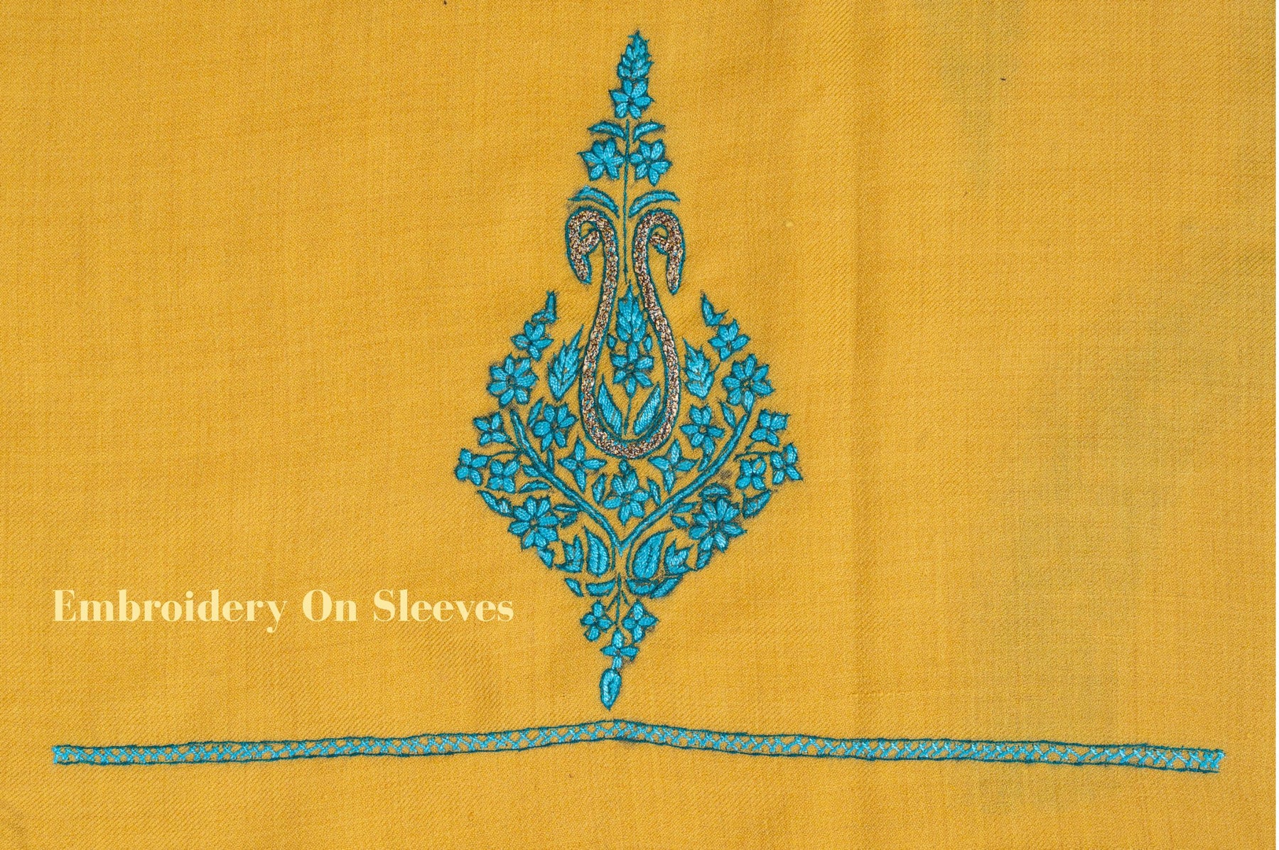 Infused with sunshine and tradition, this saffron yellow wool blend suit is elevated by turquoise Sozni hand embroidery. The contrasting hues create a radiant and refreshing look, while the intricate motifs lend a sense of refined artistry.