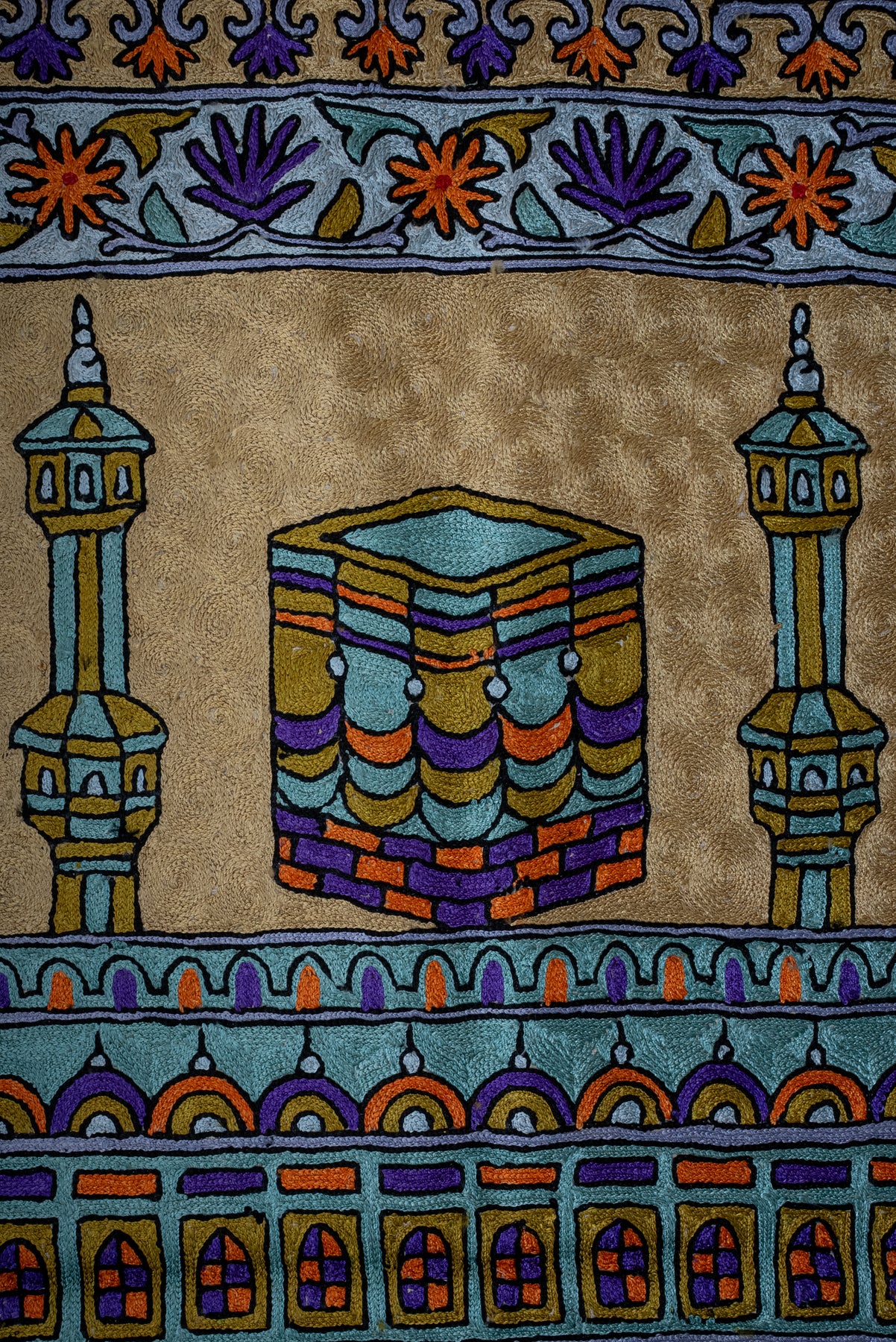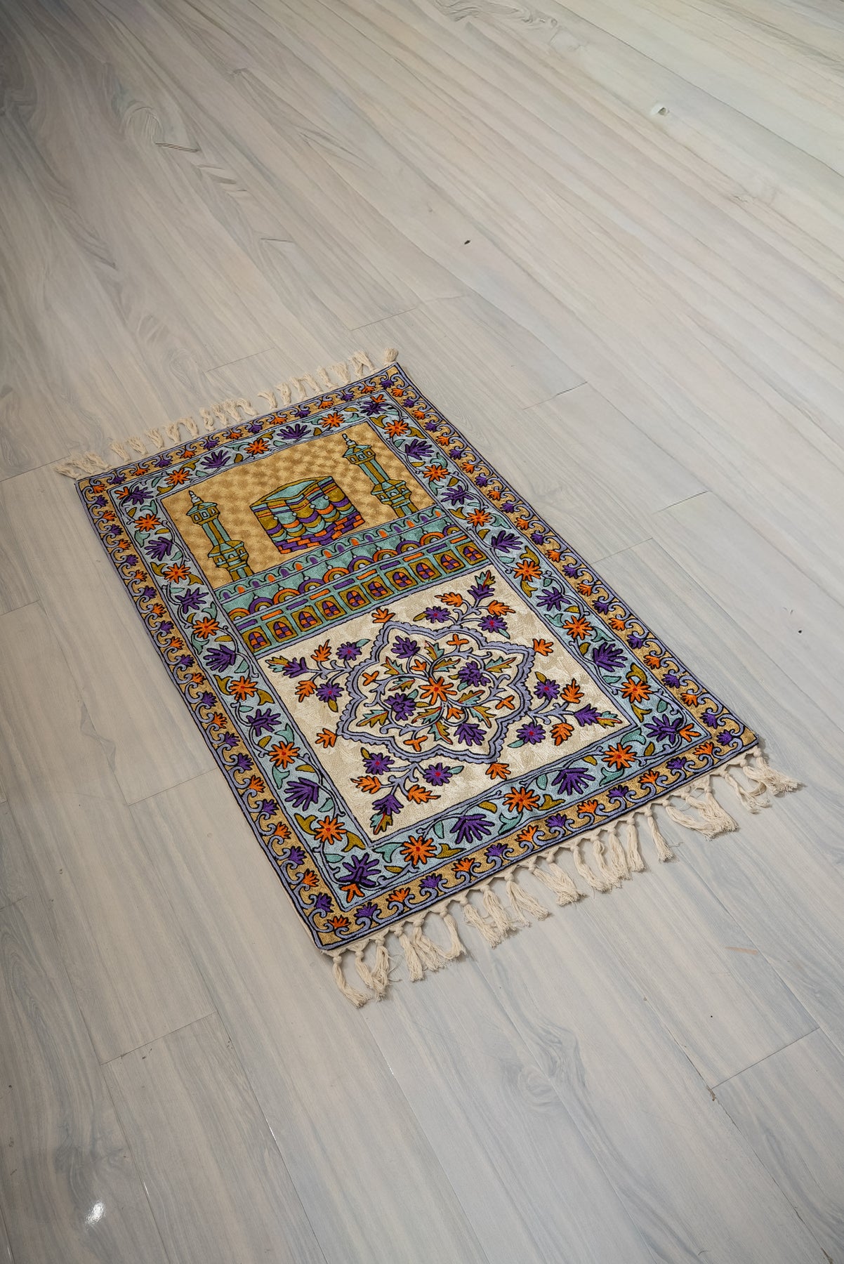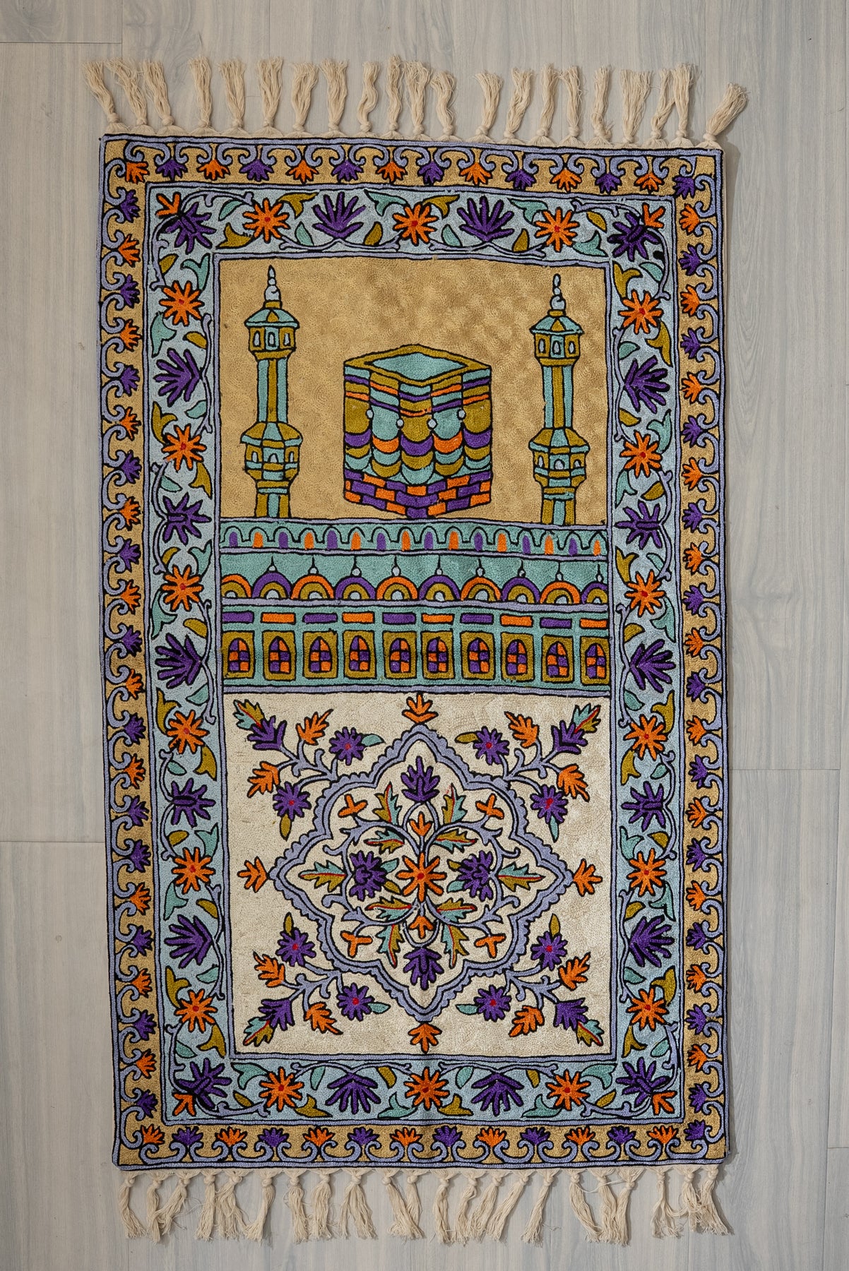 A striking display of symmetry and devotion, this Hand Embroidered Jainimaz (Prayer Mat) features the Kaaba framed by twin minarets, surrounded by a richly detailed floral border. The soft neutral base enhances the vibrant interplay of purples, oranges, and greens, creating a balanced yet eye-catching design.