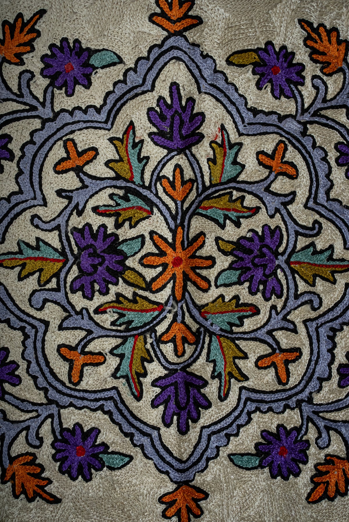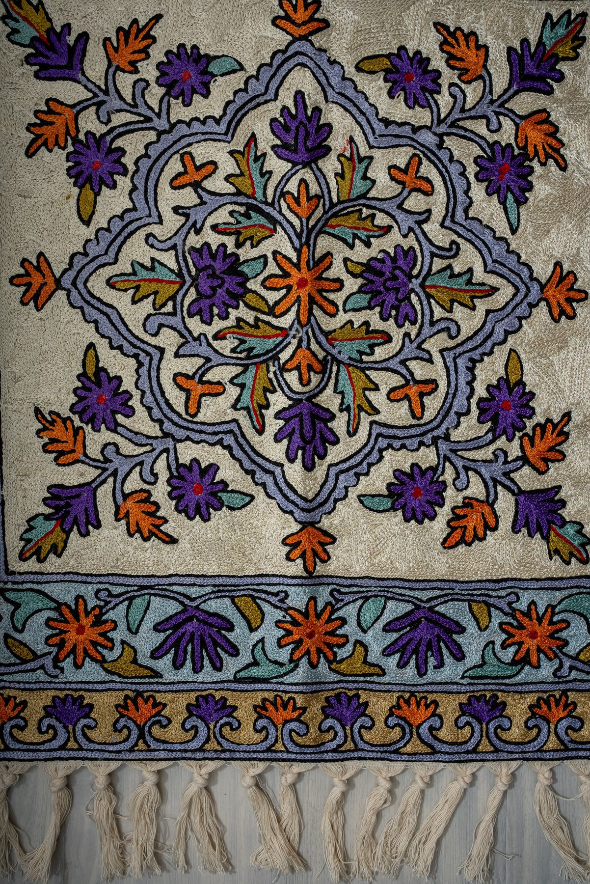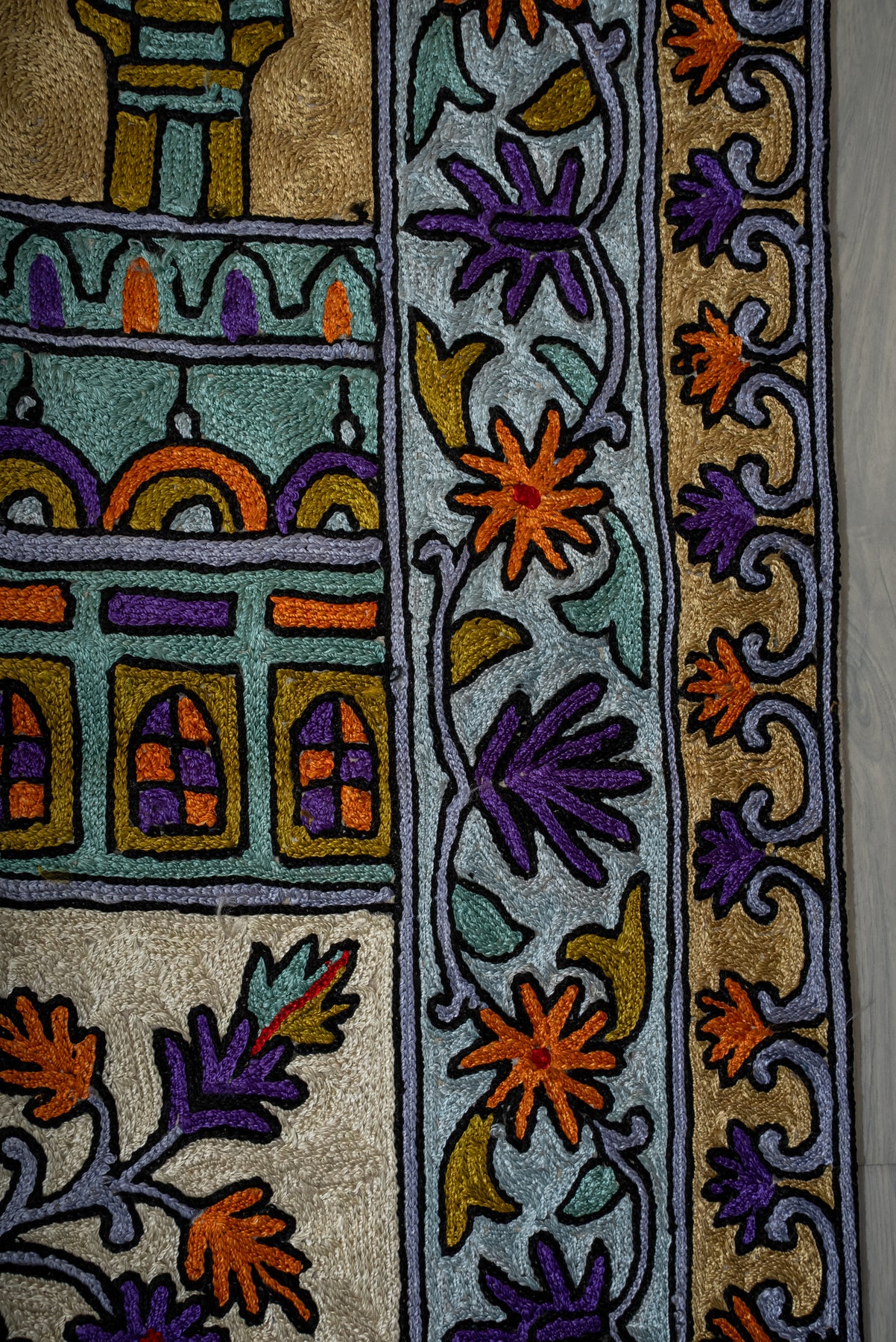 A striking display of symmetry and devotion, this Hand Embroidered Jainimaz (Prayer Mat) features the Kaaba framed by twin minarets, surrounded by a richly detailed floral border. The soft neutral base enhances the vibrant interplay of purples, oranges, and greens, creating a balanced yet eye-catching design.