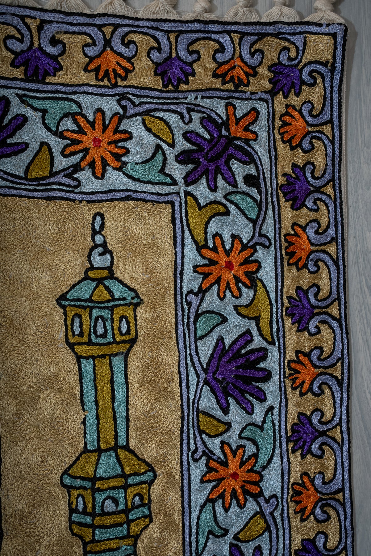 Celestial Twin Minaret Bloom: Hand Embroidered Jainimaz (Prayer Mat)